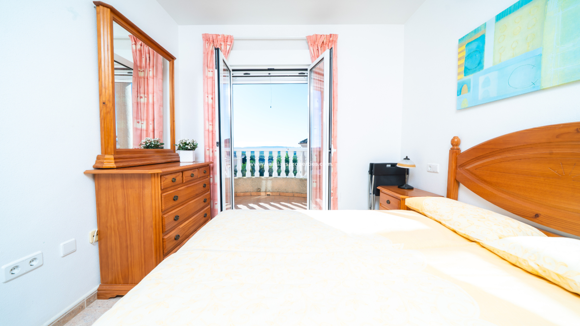 Boven is de tweede slaapkamer een tweepersoonskamer met inbouwkasten, airconditioning en openslaande deuren die uitkomen op een balkon met prachtige, open uitzichten over het platteland. De tweede badkamer biedt een bad op ware grootte, toilet, bidet en wastafel. De derde slaapkamer is een tweepersoonskamer (met twee eenpersoonsbedden) met inbouwkasten en airconditioning. De hoofdslaapkamer is ruim en beschikt over airconditioning, plafondventilatoren, grote kledingkasten en een moderne en-suite badkamer met een royale douche, een wastafelmeubel en een toilet.