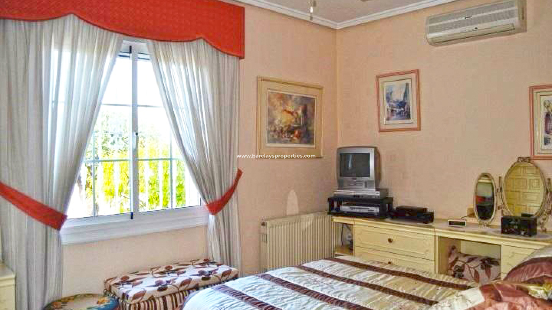 De woonkamer is licht en comfortabel, versterkt door een verhoogd torenplafond, gashaard, plafondventilator en airconditioning. De indeling omvat vier slaapkamers in het hoofdgebouw. De hoofdslaapkamer heeft airconditioning, een plafondventilator, een inbouwkast met vier deuren en een en-suite badkamer met een bad, aparte douche, toilet, wastafelmeubel, bidet en verwarmd handdoekenrek. De tweede slaapkamer is een tweepersoonskamer met airconditioning, een plafondventilator en een inbouwkast met vier deuren. De derde is een tweepersoonskamer met twee inbouwkasten en een plafondventilator, terwijl de vierde momenteel als kleedkamer wordt gebruikt. Een aparte badkamer met een hoekdouche, toilet en wastafelmeubel bedient de extra slaapkamers.