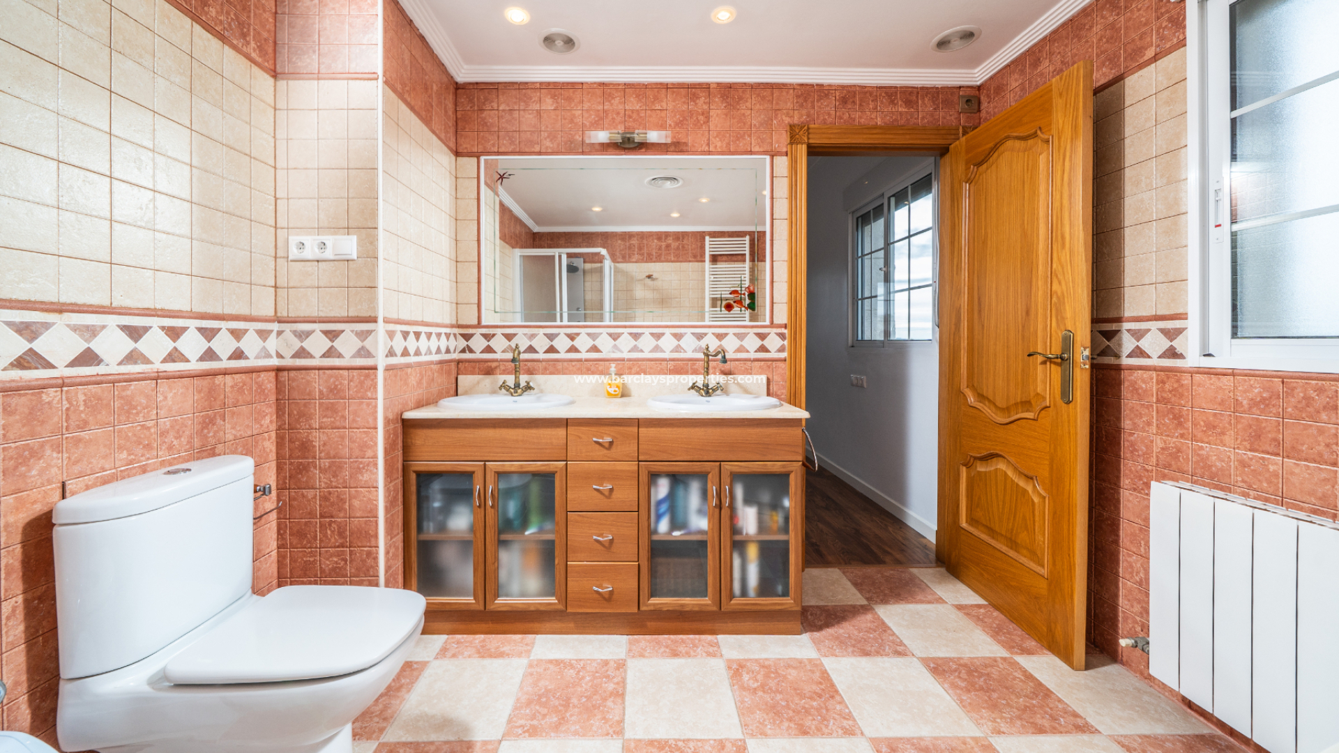 Boven opent een deur op de overloop naar het achterterras. De hoofdslaapkamer is een absoluut hoogtepunt, met een enorme inloopkast, een luxe en-suite badkamer met een groot hoekbad, aparte douche, bidet, toilet, dubbele wastafel en directe toegang tot een groot privéterras. Twee verdere tweepersoonsslaapkamers op dit niveau profiteren beide van openslaande deuren naar het terras rondom de woning, wat zorgt voor veel natuurlijk licht. Een extra badkamer met hoekdouche, toilet und bidet bedient deze slaapkamers.