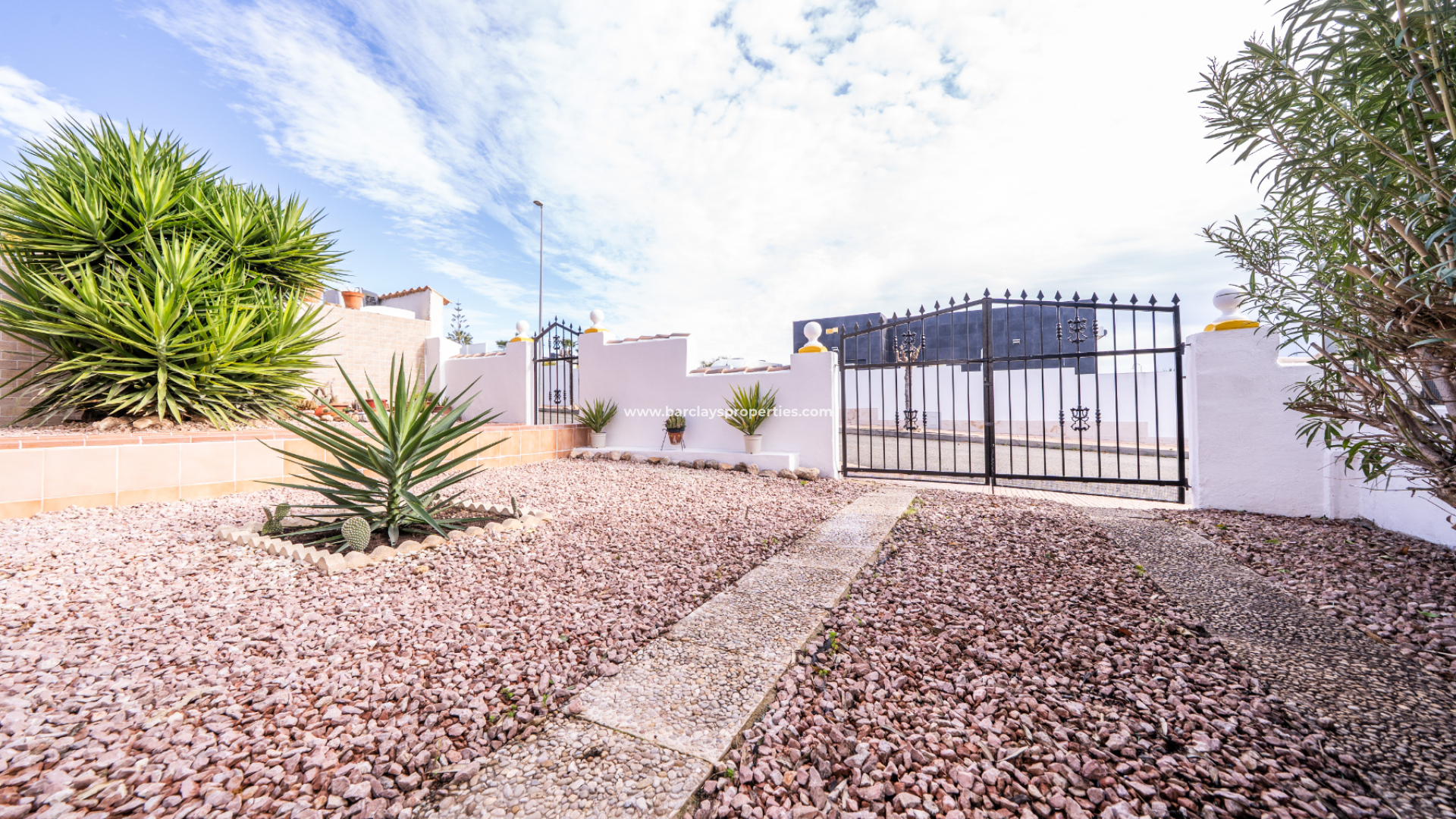 De tuin van de woning is geplaveid en voornamelijk voorzien van grind, leidend naar een overdekte veranda en beschikt over een zijterras dat nuttige buitenruimte biedt voor ontspanning of dineren. Binnen is de woonkamer licht en comfortabel, inclusief een plafondventilator en een eethoek. De indeling vloeit goed over in de rest van de woning, wat het praktisch maakt voor zowel vakantieverblijven als bewoning voor de langere termijn.