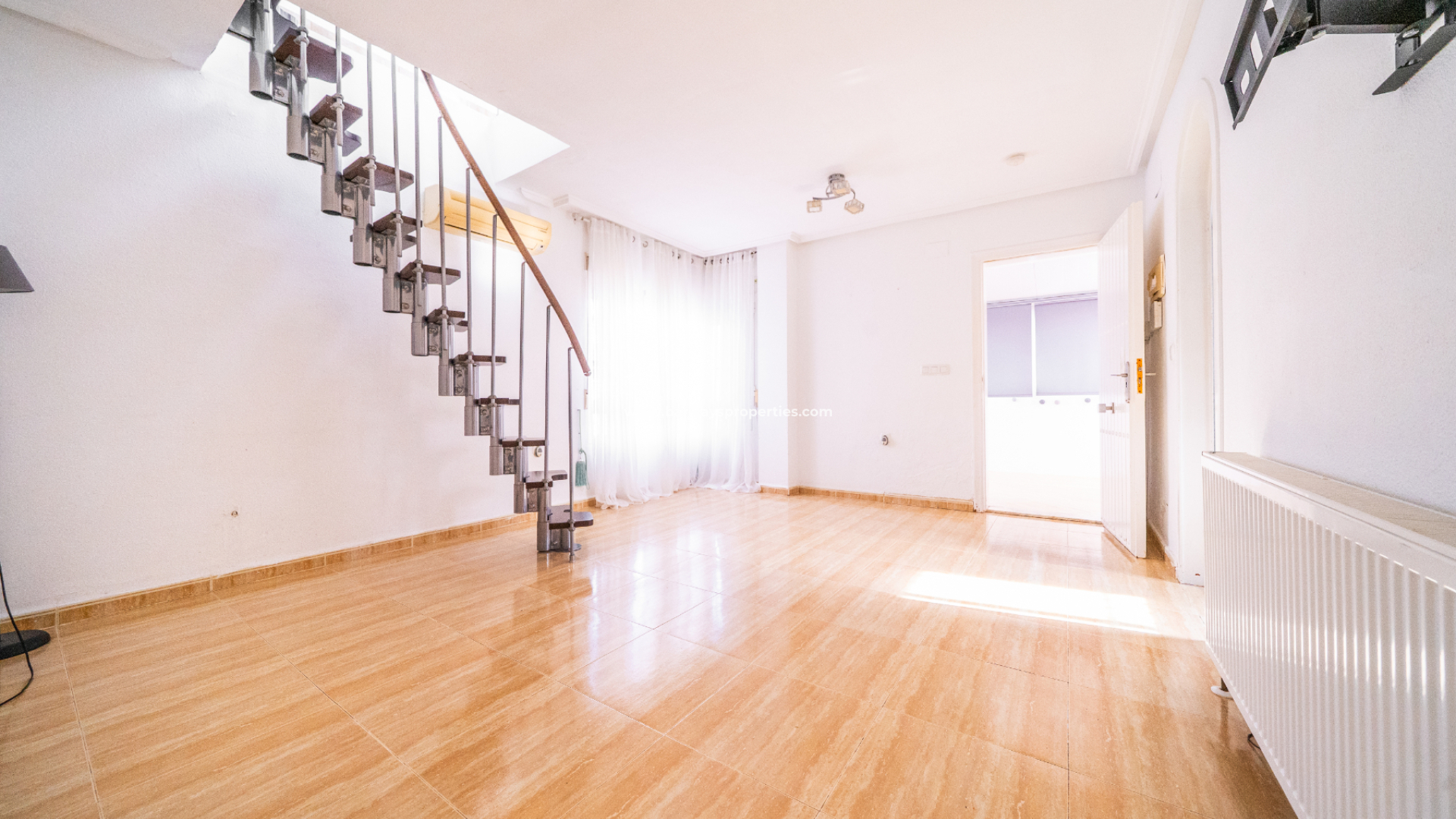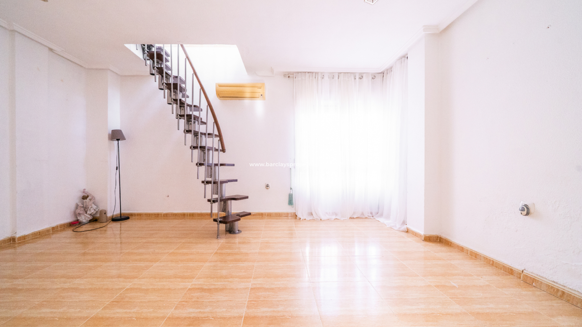 Dit specifieke pand is uniek omdat het een interne trap heeft die de leefruimtes met elkaar verbindt; boven vinden we een van de eerder genoemde slaapkamers en badkamers.