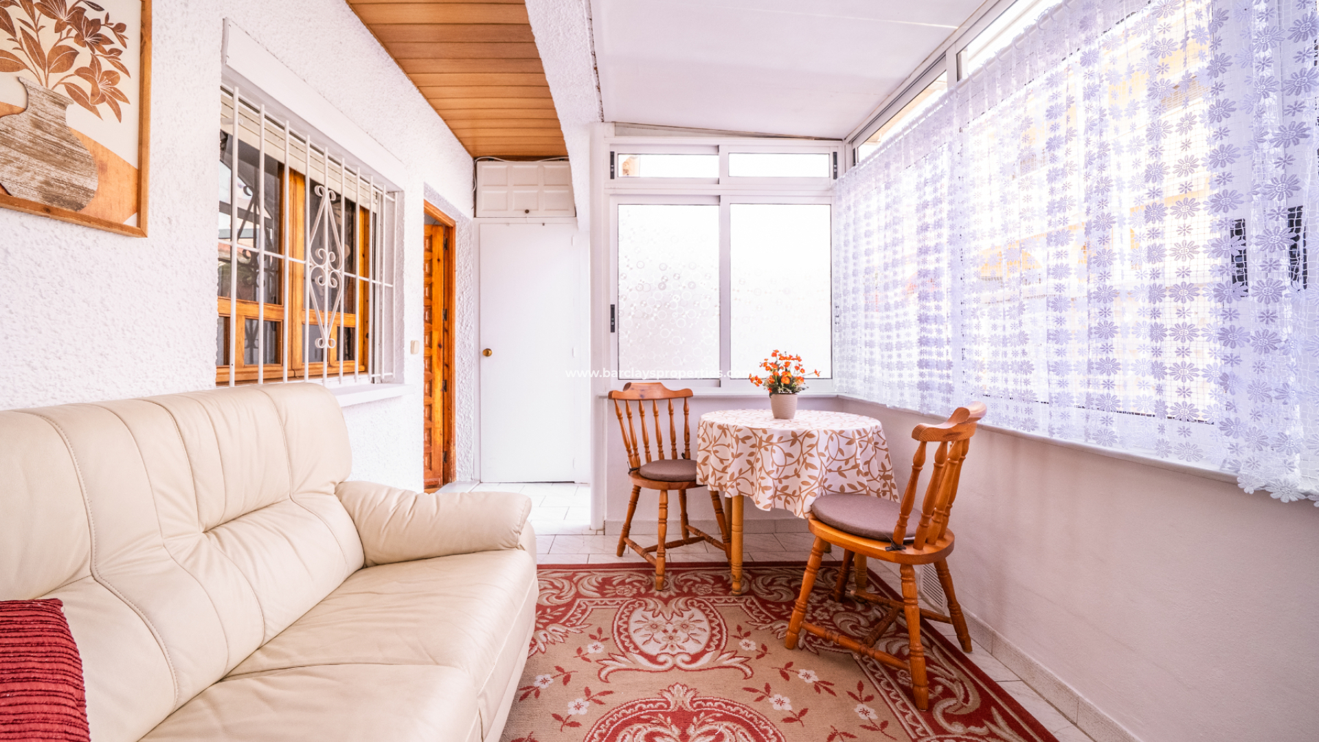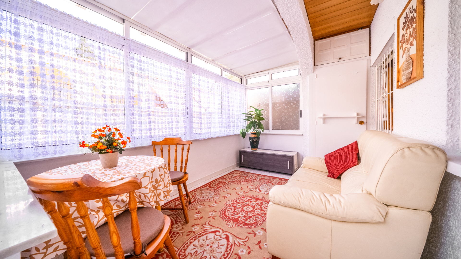 De veranda aan de voorzijde is volledig beglaasd en wordt momenteel gebruikt als een lichte und comfortabele serre waar u het hele jaar door van kunt genieten. Binnen biedt de woonkamer een uitnodigende plek om te ontspannen, met een praktische indeling die doorloopt naar de keuken.