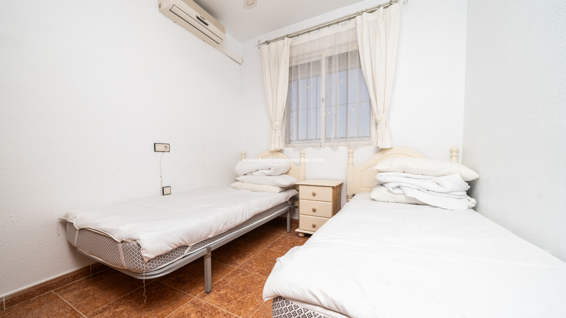De woning biedt drie slaapkamers, allemaal met inbouwkasten, airconditioning en een plafondventilator. De eerste is een tweepersoonskamer, de tweede is een kamer met twee aparte bedden en tot slot de hoofdslaapkamer met openslaande deuren naar een privébalkon. Er is een doucheruimte met toilet en wastafel, evenals een gezinsbadkamer met een ligbad met douche, bidet, toilet en wastafel.