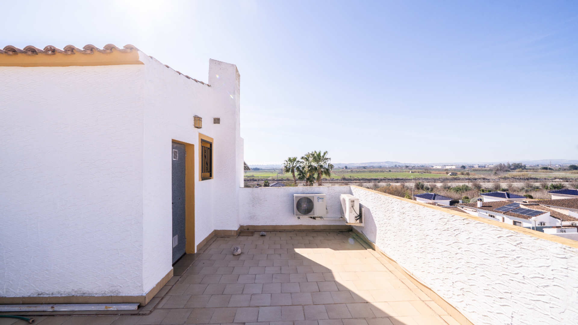 Vanaf de overloop is er toegang tot een ruim solarium waar u kunt genieten van een weids uitzicht over het landschap, wat een uitstekende extra buitenruimte biedt om te ontspannen of te zonnebaden.