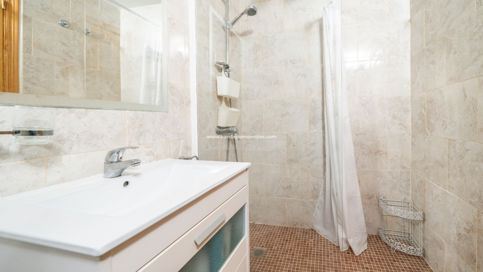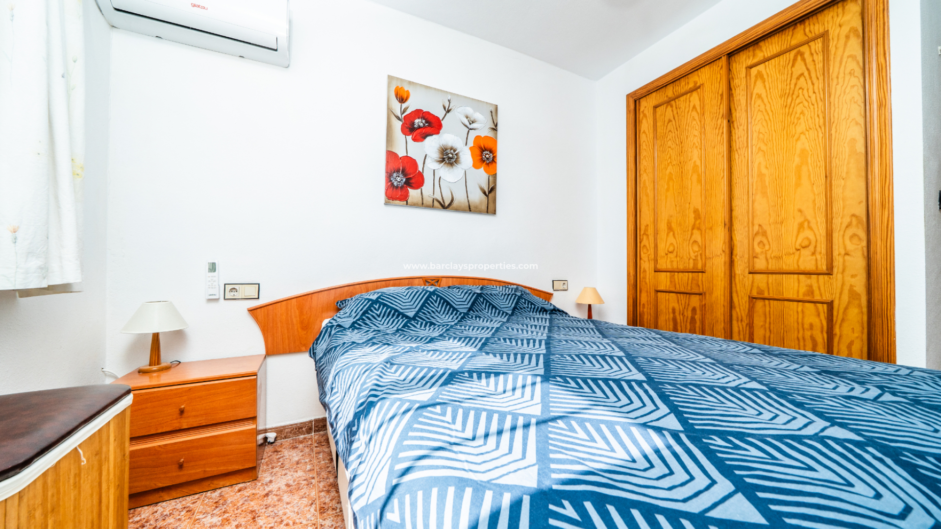 Er zijn twee slaapkamers. De hoofdslaapkamer is een tweepersoonskamer met inbouwkasten, airconditioning en een plafondventilator. De tweede slaapkamer is een kamer met twee aparte bedden, eveneens met inbouwkasten en een plafondventilator, ideaal voor gasten of familie. De badkamer is vernieuwd met nieuwe tegels en beschikt over een inloopdouche, toilet, badmeubel en bidet, afgewerkt in een moderne stijl.