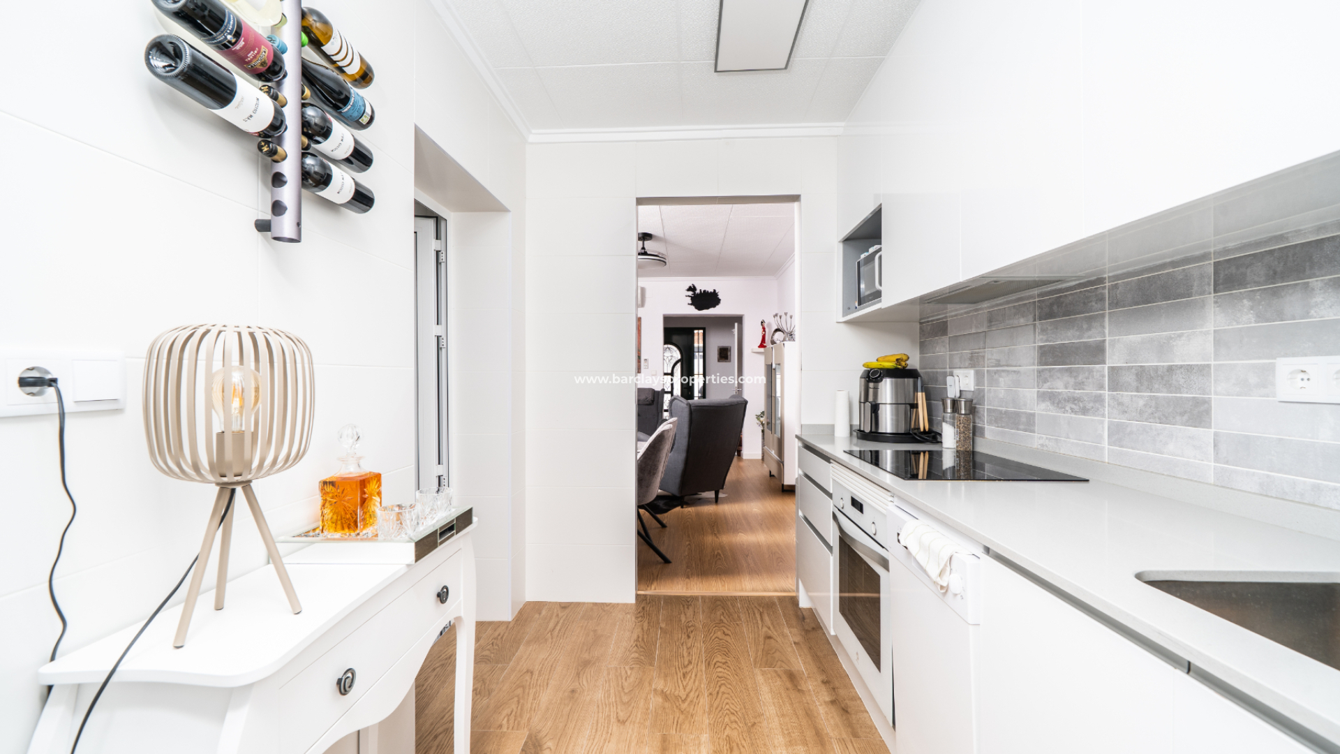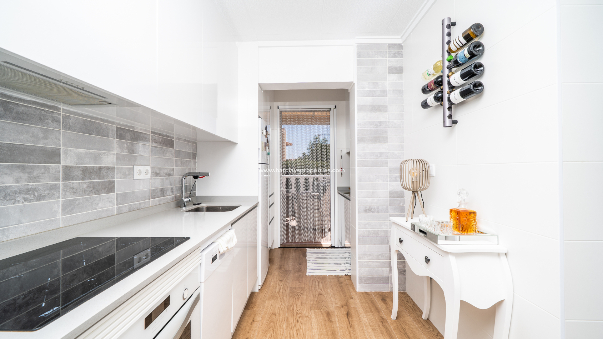 Keuken: Een uitgebouwde keuken die volledig elektrisch is en onlangs is gerenoveerd, met een deur naar het achtergelegen zonneterras.
