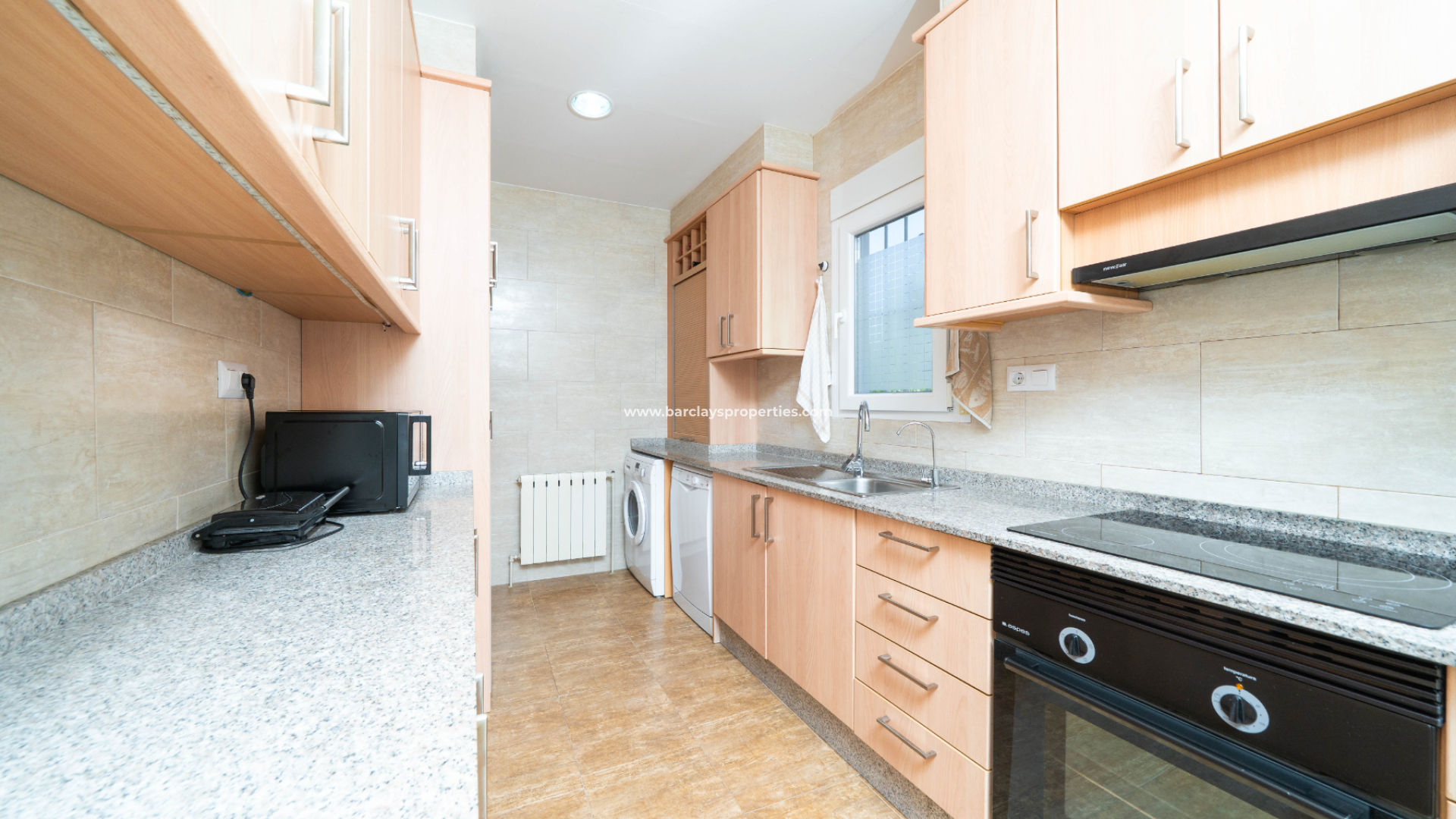 Binnen biedt de woning een lichte en comfortabele woonkamer, compleet met een open haard, plafondventilator en airconditioning, wat in elk seizoen voor een uitnodigende sfeer zorgt. De keuken is smaakvol gemoderniseerd met nieuwe units, granieten werkbladen en elektrische inbouwapparatuur, waarbij stijl en functionaliteit hand in hand gaan.