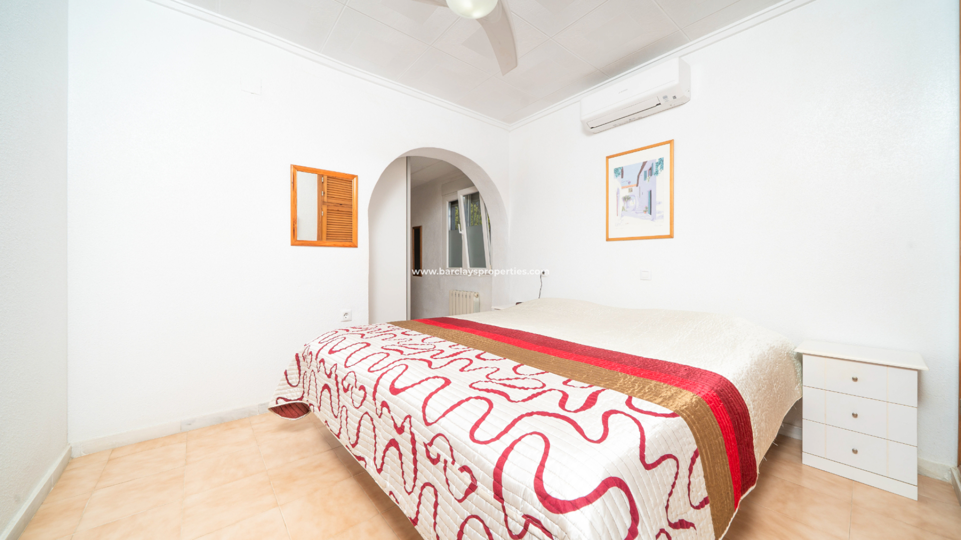 De villa beschikt over drie goed bemeten tweepersoonsslaapkamers, allen voorzien van plafondventilatoren, airconditioning en inbouwkasten. De hoofdslaapkamer is bijzonder ruim en beschikt over een grote kastenwand en een eigen en-suite badkamer met een hoekdouche, toilet en wastafelmeubel. De overige twee tweepersoonsslaapkamers worden bediend door een moderne gezinsbadkamer met inloopdouche, toilet, wastafelmeubel en handige opbergruimte.