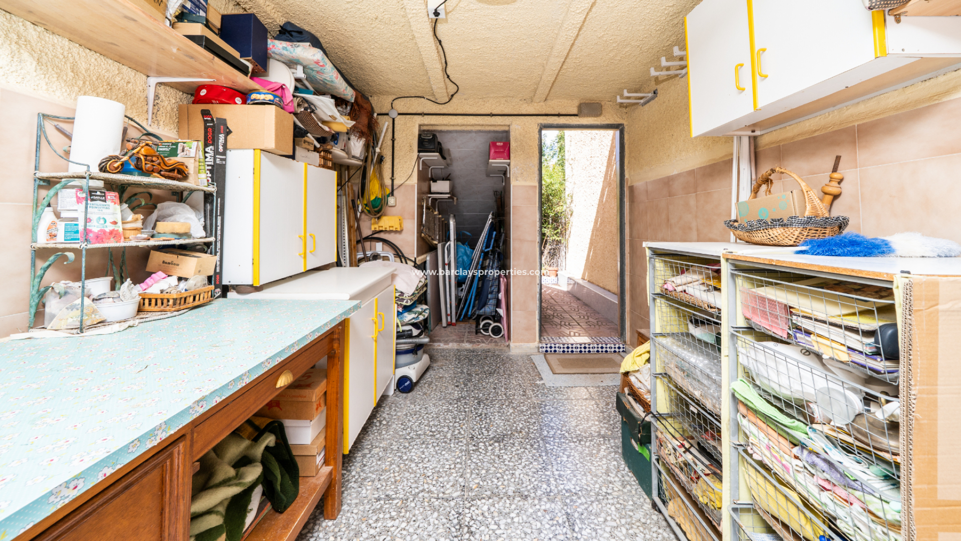 Binnen is de woonkamer zowel gastvrij als praktisch, compleet met airconditioning en een plafondventilator voor comfort het hele jaar door. De gerenoveerde keuken is hoogwaardig afgewerkt, met granieten werkbladen, een volledig elektrische indeling en voldoende werkruimte. Naast de keuken bevindt zich een handige bijkeuken met wasmachine, extra opbergruimte en toegang tot de achtertuin.