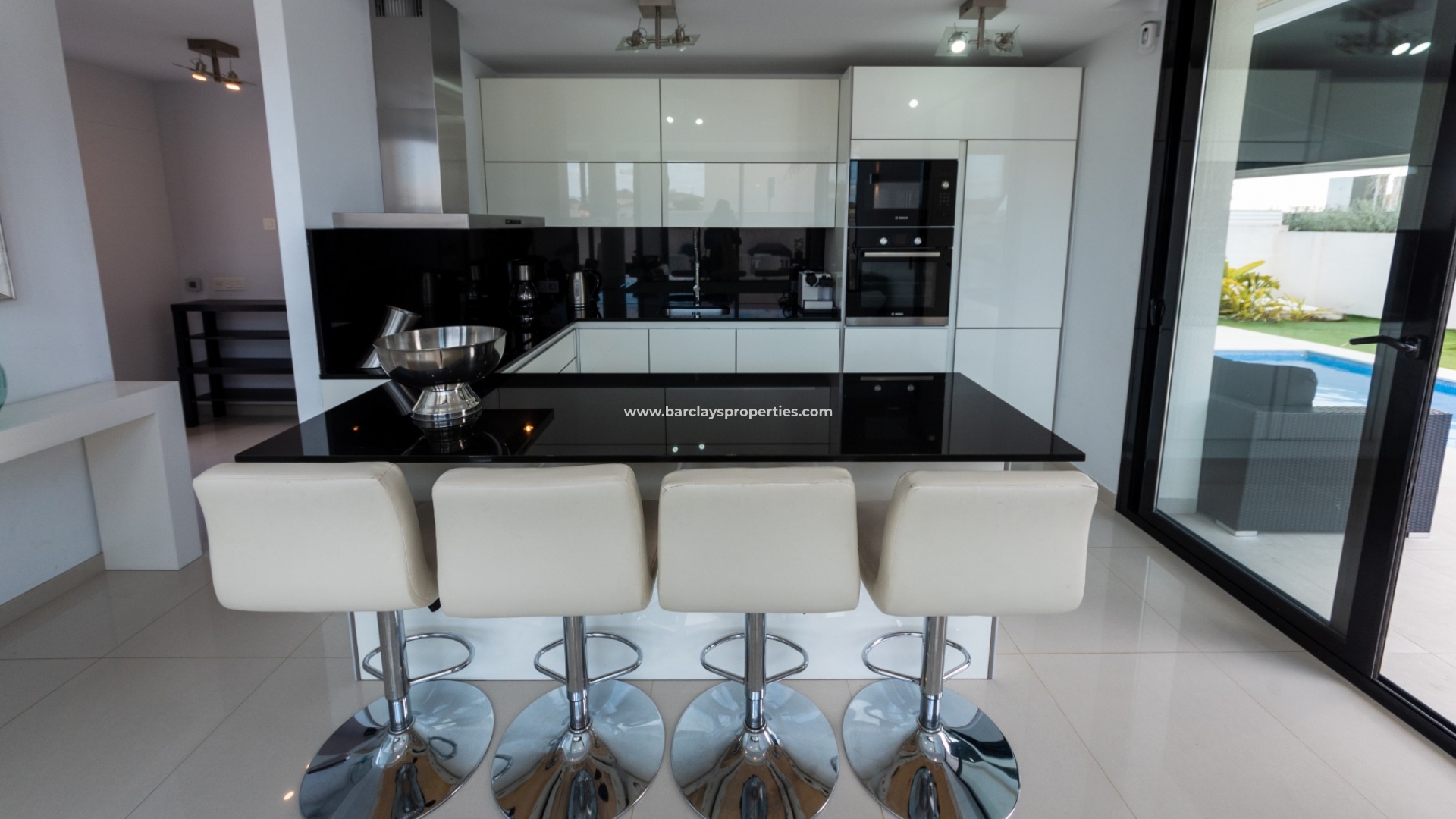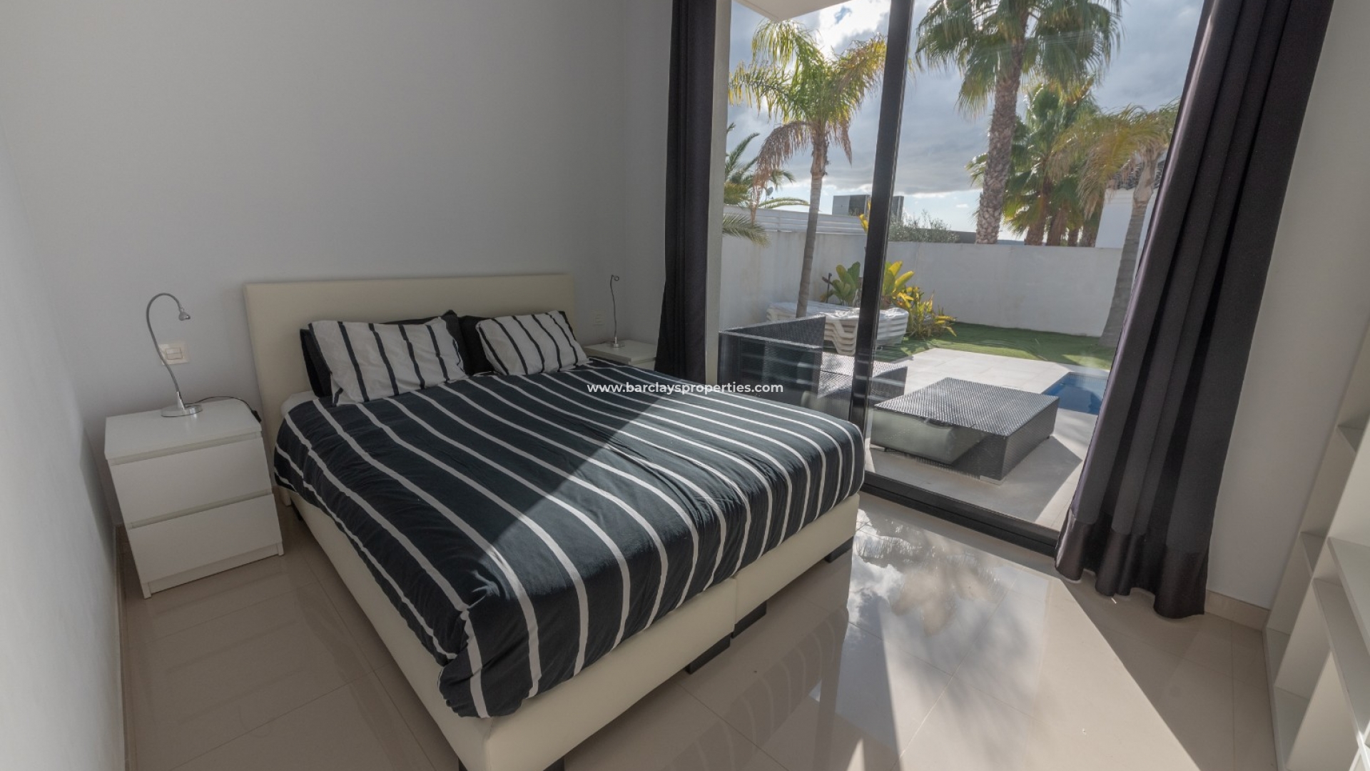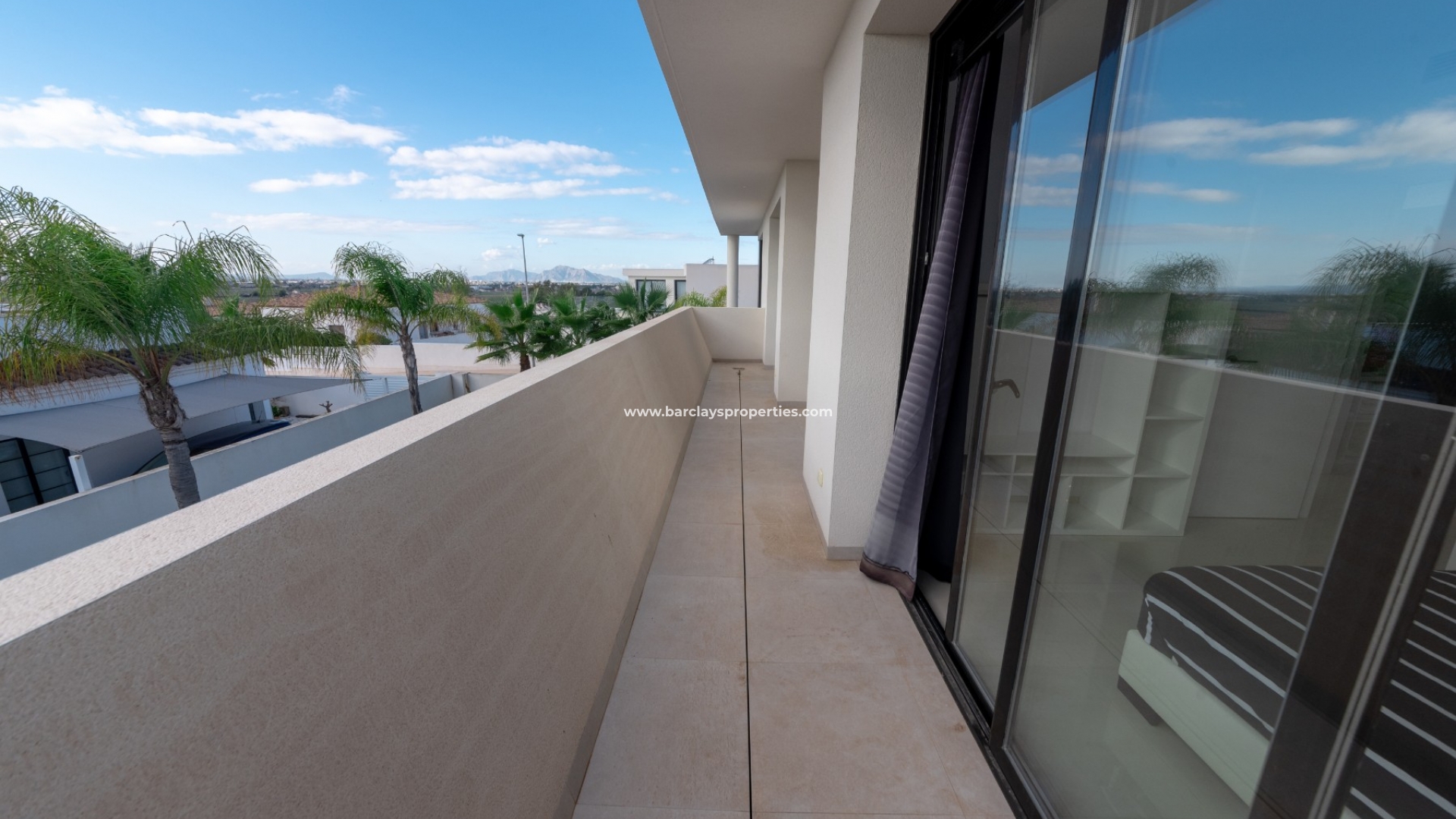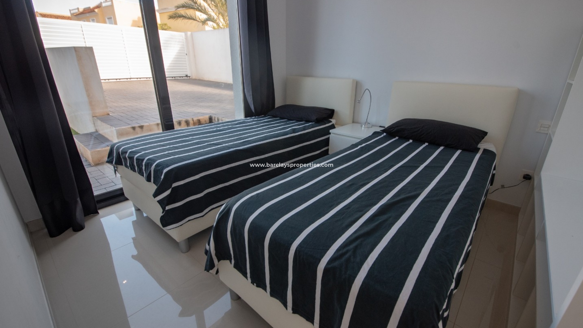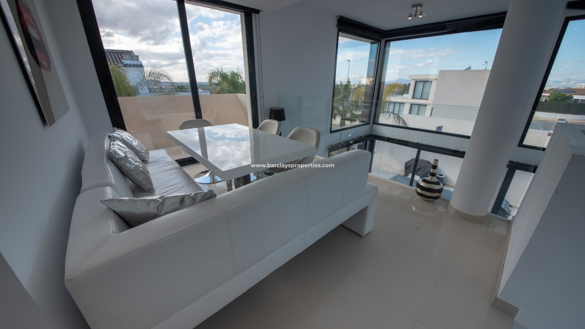 De woning wordt volledig gemeubileerd geleverd en vanaf het zwembadterras komen we in een ruime woonkamer met geïntegreerde airconditioning en een open moderne stijl keuken, die dankzij de 3 dubbele schuifdeuren naar buiten, vol natuurlijk licht is en een prachtige feng shui vibe uitstraalt. Achter de keuken is er een kleine doorgang die ons naar de voordeur aan de linkerkant brengt, met zijn eigen video-intercomsysteem. Als we verder gaan, komen we aan onze rechterkant een grote volledig ingerichte badkamer tegen, met een dubbele wastafel en een inloopdouche, gevolgd door twee tweepersoonsslaapkamers, beide met schuifdeuren die naar buiten leiden. Terug in de zitkamer vinden we een marmeren trap die ons naar de eerste verdieping brengt waar we eerst een overloop tegenkomen met een 8-persoons onafhankelijke eethoek met uitzicht op de zitkamer beneden. De doorgang leidt ons naar nog een volledig ingerichte badkamer, nog twee tweepersoonsslaapkamers en een zonneterras met spectaculair uitzicht op de bergen.