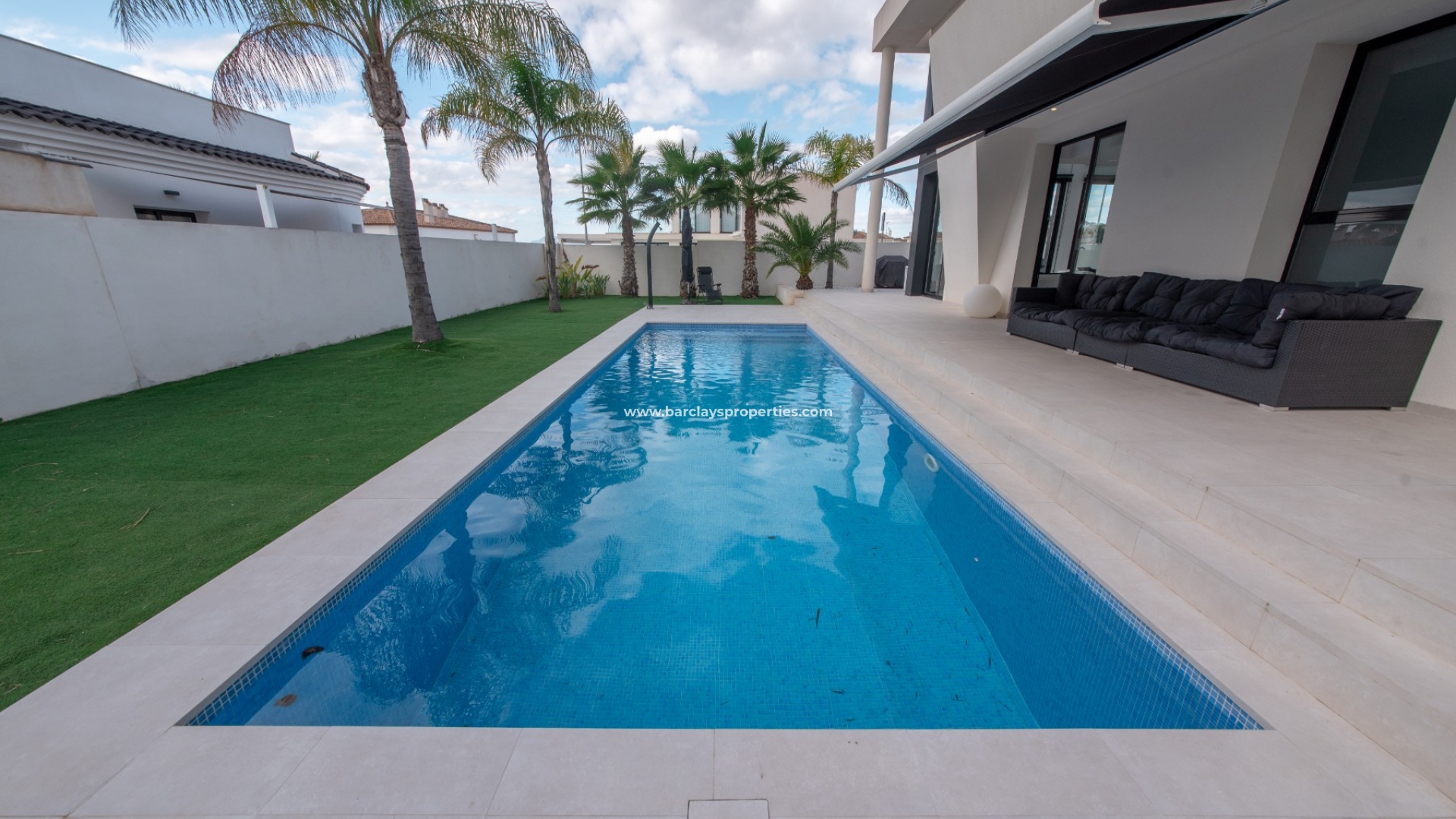 Als we de tuin van deze vrijstaande villa inlopen, vinden we een verharde tuin met kunstgras voor gemakkelijk onderhoud. Het heeft een groot zwembad van 10 x 3,5 met een speciaal ondiep gedeelte voor kinderen en een zonneterras met zonneschermen en 8 ligbedden, evenals de natuurlijke schaduw van de eigen palmbomen.