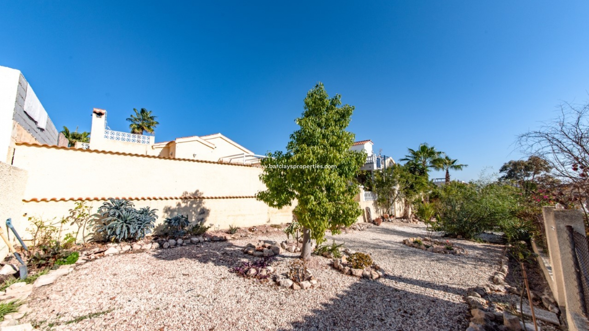De tuin is volledig bestraat voor weinig onderhoud en biedt een eigen oprit, zijtuin, zonneterrassen voor en achter (het achterterras wordt verhoogd met uitzicht op het zwembad en de groene omgeving). Enkele van de inbegrepen extra's zijn zonneschermen, veiligheidsroosters, buitenverlichting, onderbouwopslag ...