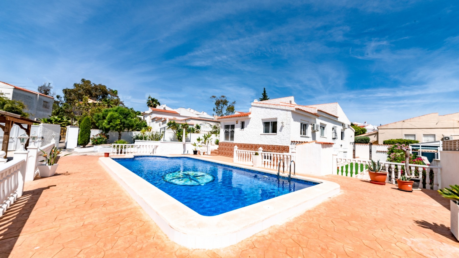 Met trots presenteren we deze absoluut schitterende vrijstaande villa, een model "Yolanda" met een 10 x 5 privé zwembad die te koop is in de urbanisatie La Marina aan de Costa Blanca. Gelegen in een rustige doodlopende straat maar toch in een centrale omgeving, deze woning is slechts 2 minuten lopen van alle voorzieningen en heeft naastgelegen prachtige vrijstaande villa's in de buurt. Het grote perceel van ongeveer 873 m² met veel verschillende tropische planten is toegankelijk via elektrische poorten en biedt off-road parking met een carport, verschillende zitjes aan de buitenkant, een tuinhuisje, een tuinhuisje, een pittoreske hoekvijver en een barbecue met buitenkeuken en bar, perfect voor die warme zomeravonden die ontspannen bij het zwembad of voor het ontvangen van familie en vrienden. Het grote zwembad heeft een buitendouche en een wasruimte met W.C.