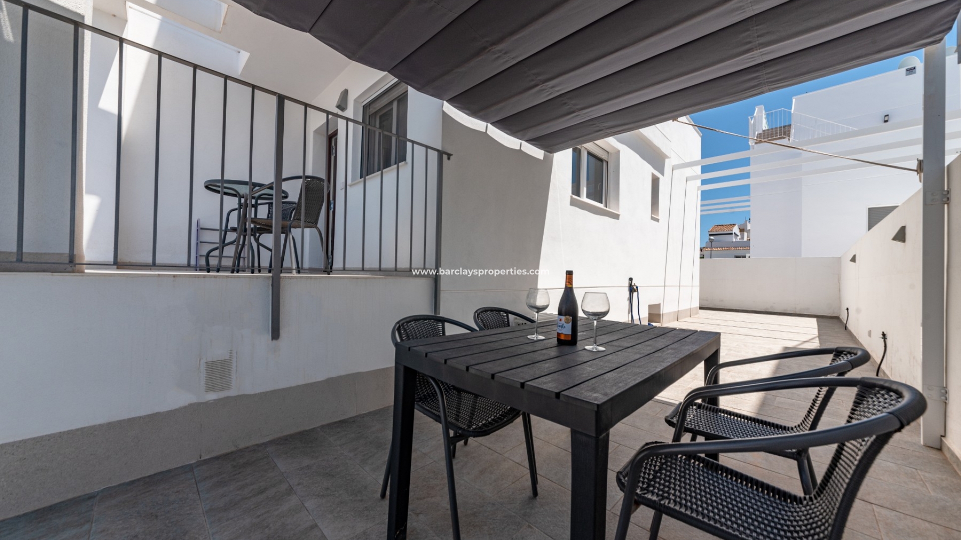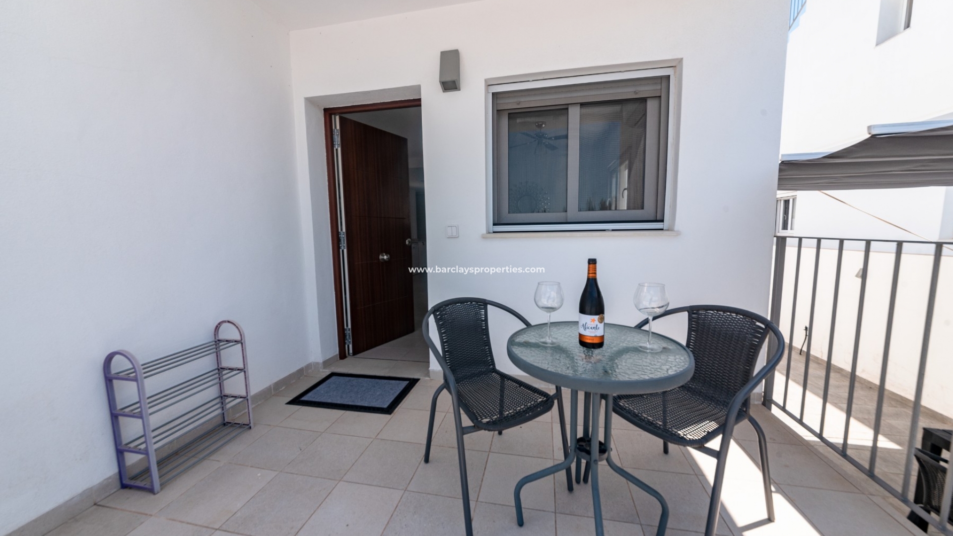 Deze prachtige moderne villa is gebouwd volgens de hoogste normen en biedt een gemotoriseerde poort voor toegang tot de volledig verharde tuin met off-road parking en een buitenzithoek met zonnescherm om schaduw te bieden terwijl u "al fresco" dineert voor de warmere zonnige dagen aan de Costa Blanca . Het terras aan de voorzijde is verhoogd met een zithoek die leidt naar het interieur van het pand waar we de lichte en luchtige woonkamer met eethoek vinden, een moderne volledig ingerichte open keuken met plafondspots, een slaapkamer met tweepersoonsbed en een moderne badkamer met inloop douche. Een trap leidt naar de eerste verdieping die bestaat uit een tweepersoonsslaapkamer met inbouwkasten en een openslaande deur naar een zonneterras, een volledig betegelde badkamer met inloopdouche en nog een tweepersoonsslaapkamer met inbouwkasten en een openslaande deur naar een groot balkon met buitentrap die leidt naar het solarium met een prachtig uitzicht op het landschap en de bergen.