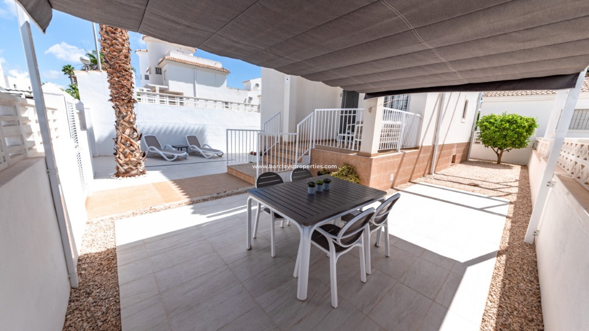 De villa bevindt zich op een vlak, volledig betegeld perceel met off-road parking, een eethoek met een zonnescherm voor schaduw en een berging, en is gebouwd volgens een hoge kwaliteit met chique, schone en lichte interieurs.