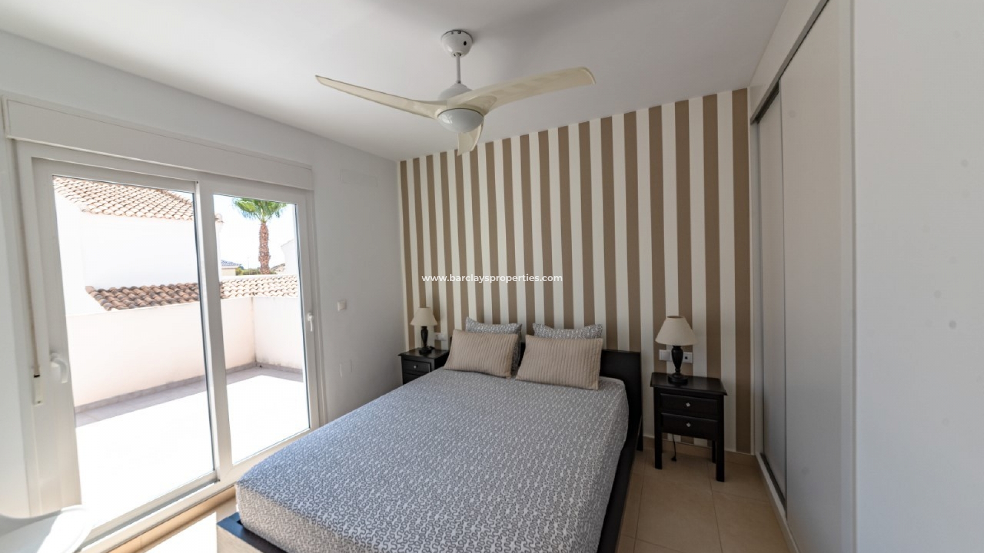 Op de eerste verdieping vinden we nog twee slaapkamers (een met openslaande deuren naar een eigen zonneterras), beide met inbouwkasten en plafondventilatoren en een tweede badkamer met een groot bad.