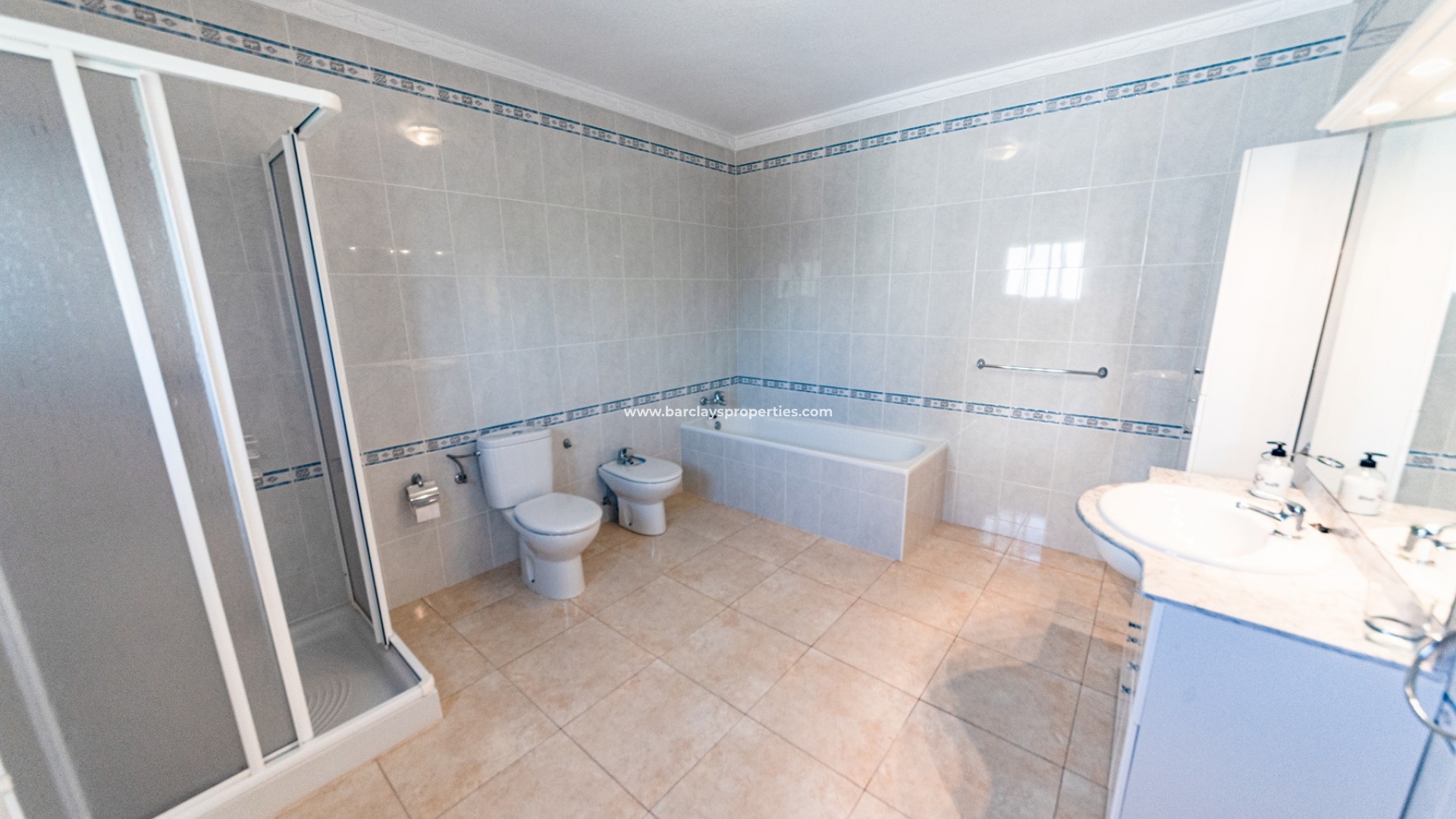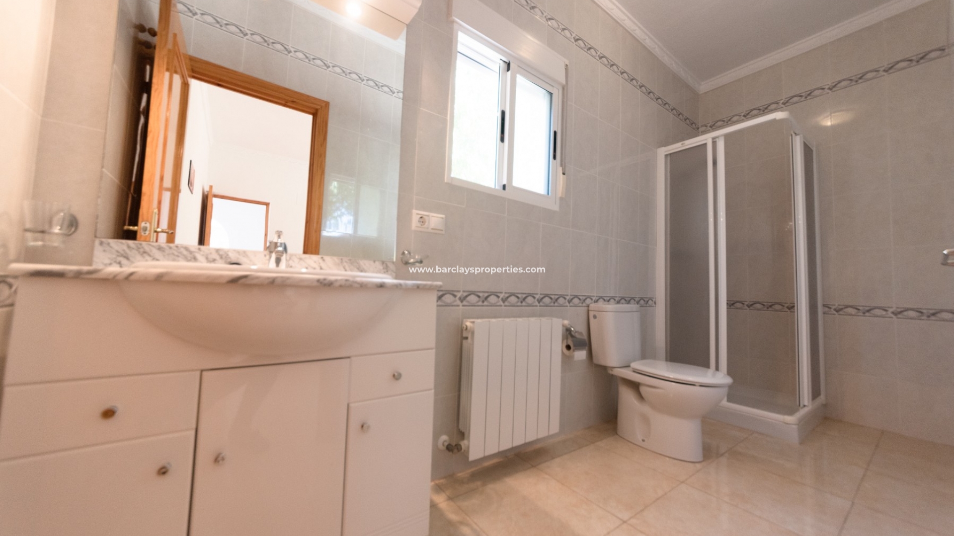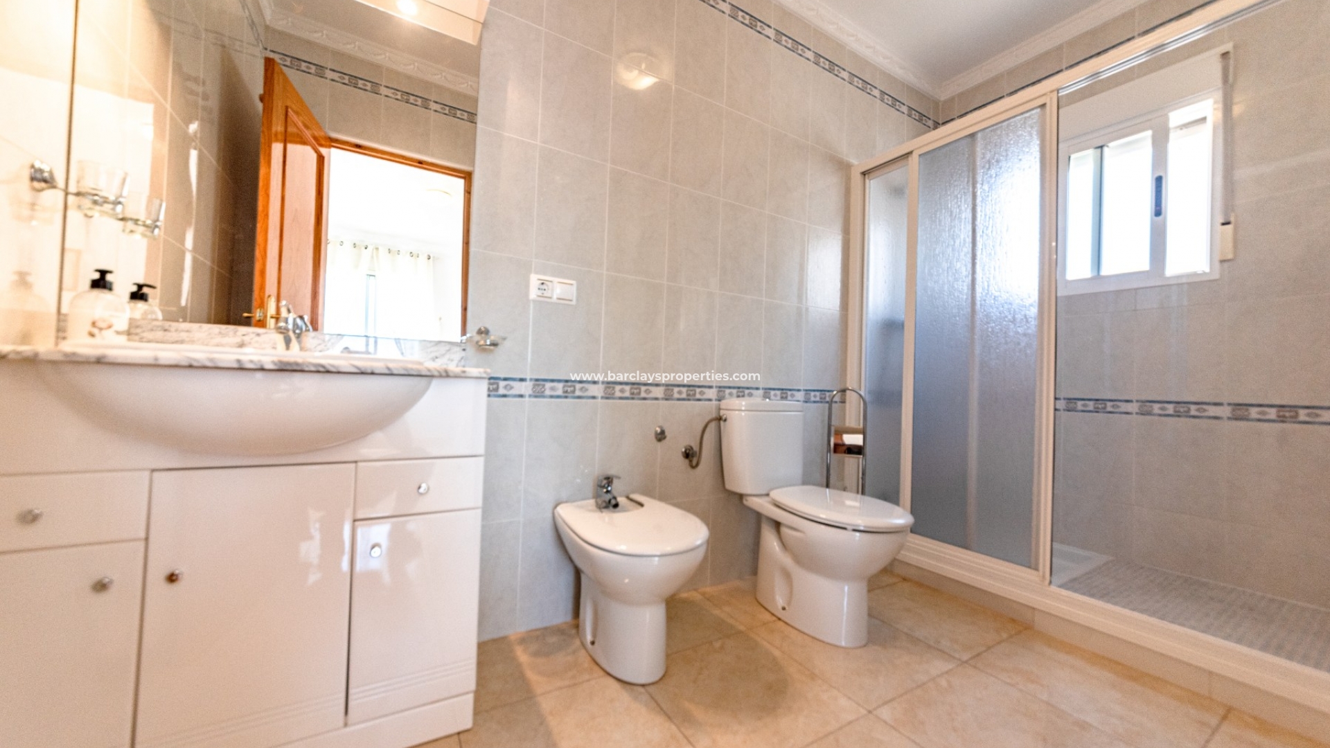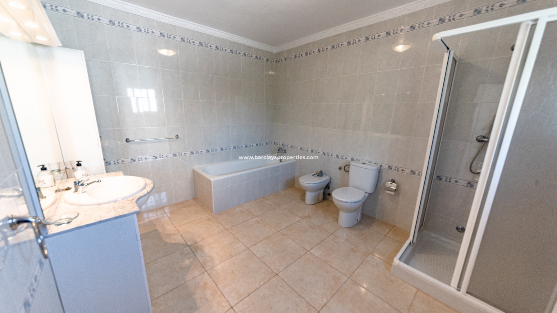 Deze prachtige villa van 300 m2 met twee verdiepingen bestaat uit een grote glazen veranda die momenteel wordt gebruikt als eetkamer / zitkamer, die leidt naar een grote, ruime woonkamer, een zeer grote volledig uitgeruste, moderne keuken met veel werkbladen, een gaskookplaat en veel bergruimte . Daarnaast vinden we een tweepersoonsslaapkamer met airconditioning en inbouwkasten met een en-suite badkamer met een hoekdouche. Opslag is te vinden onder de karakteristieke marmeren trap die leidt naar de eerste verdieping waar we een 2e grote tweepersoonsslaapkamer vinden met inbouwkasten, airconditioning en een grote en-suite badkamer met een groot bad en een ruim zonneterras met prachtig uitzicht op zee. Op deze verdieping bevinden zich ook nog 2 andere grote slaapkamers, beide met en-suite badkamers (een met een douche van muur tot muur, de andere met een groot bad).