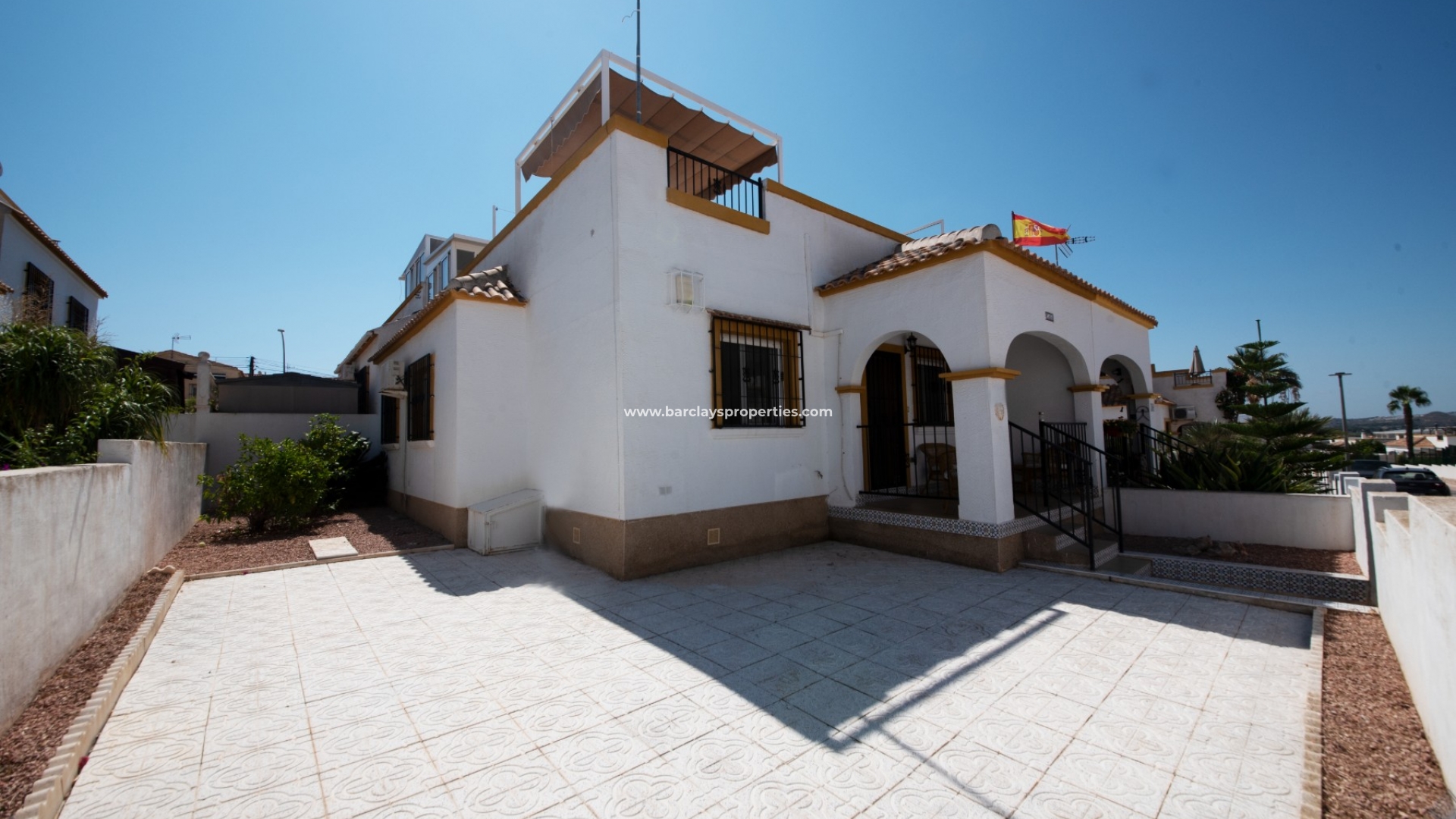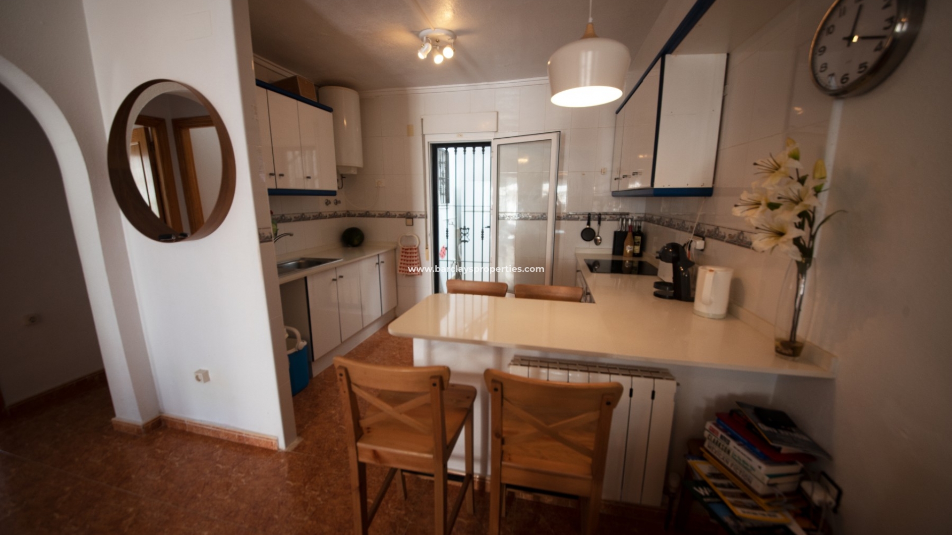 Toegang tot het pand is via de voetgangerspoort of opritpoorten die uitkomen op een volledig verharde tuin met off-road parking en trappen die leiden naar een verhoogde overdekte veranda die toegang geeft tot het interieur van het pand waar we de ruime en lichte woonkamer met lucht airconditioning, een open keuken met moderne ontbijtbar, drie tweepersoons slaapkamers (waarvan twee met inbouwkasten) en een badkamer met inloopdouche. De woning heeft een aparte bijkeuken met trap naar de serre en een groot solarium met ligweide en buiten eethoek met prieel, ideaal om 'al fresco' te dineren op die warme zomeravonden. Het solarium heeft buitenverlichting voor de donkere avonden en een prachtig uitzicht op het landschap en de bergen.