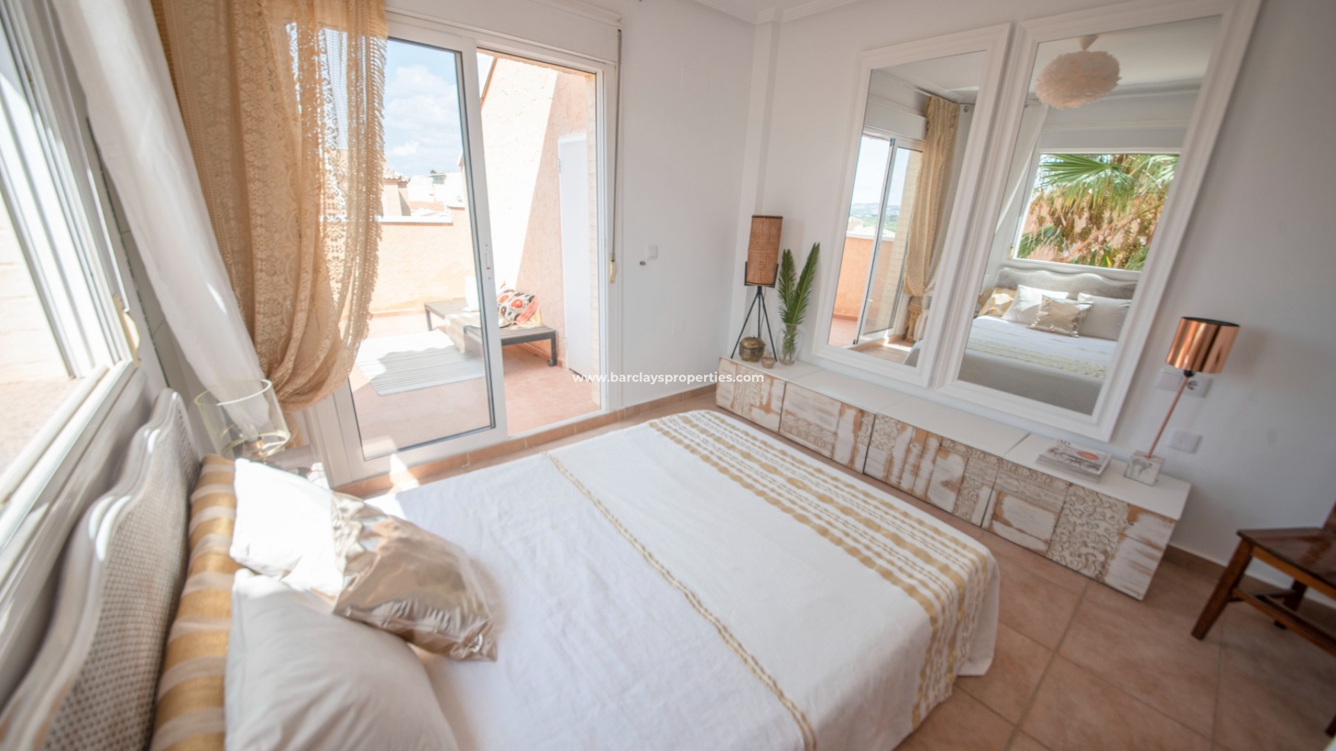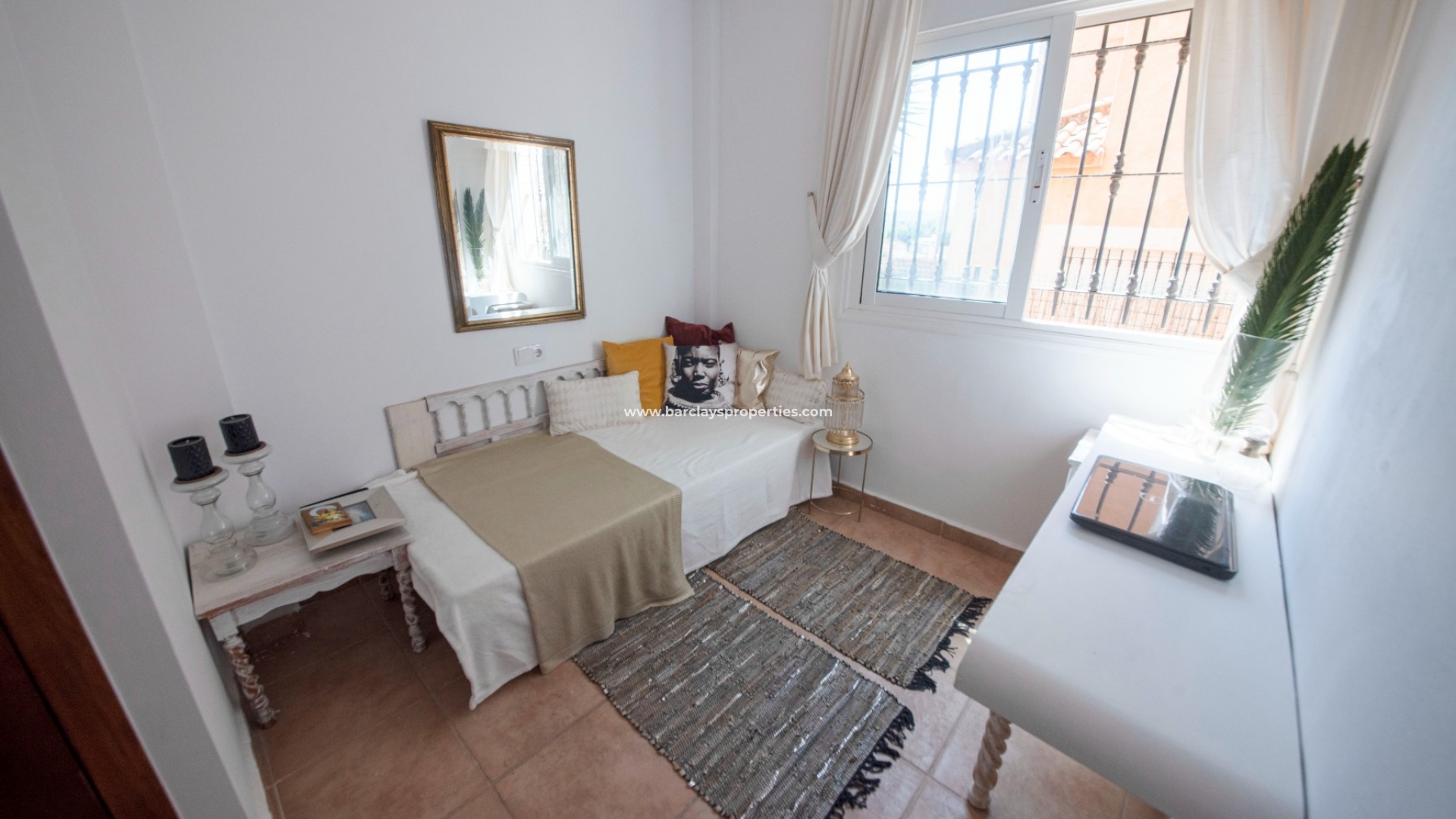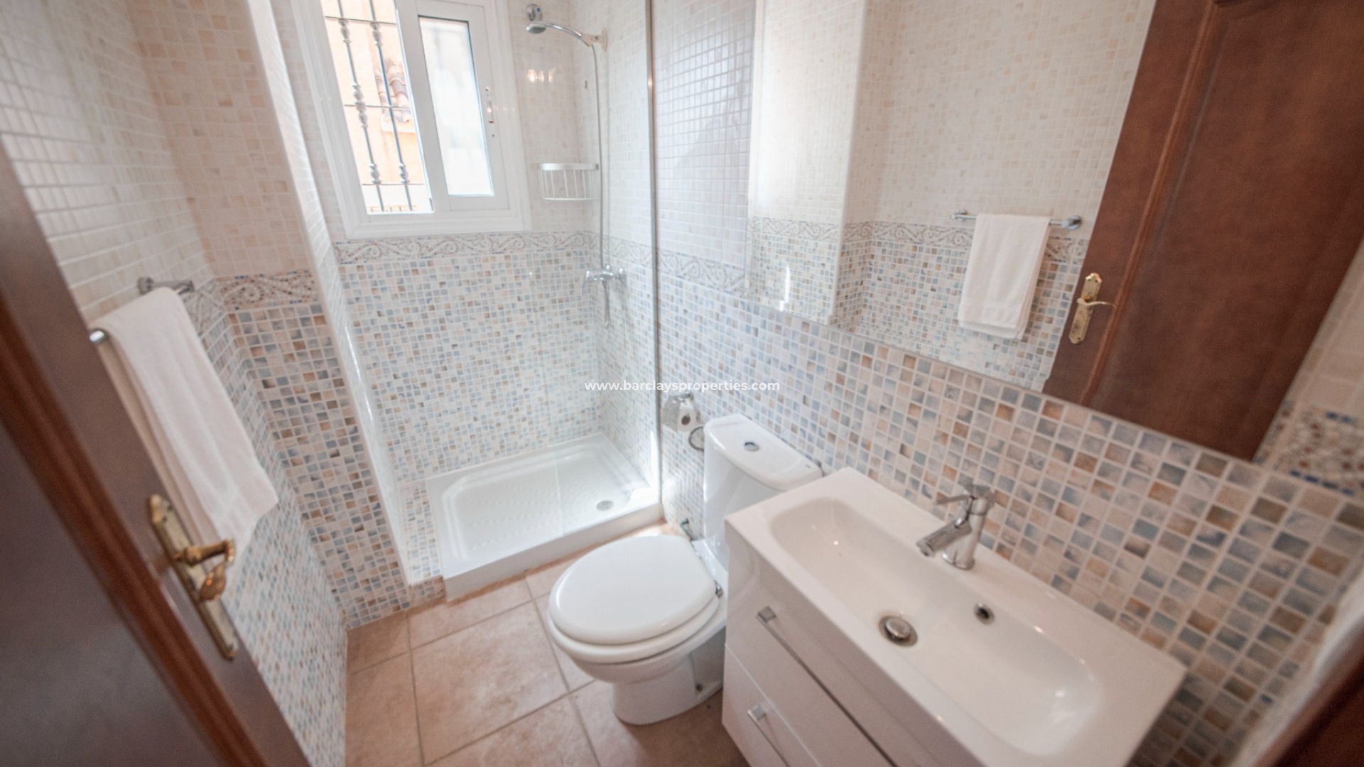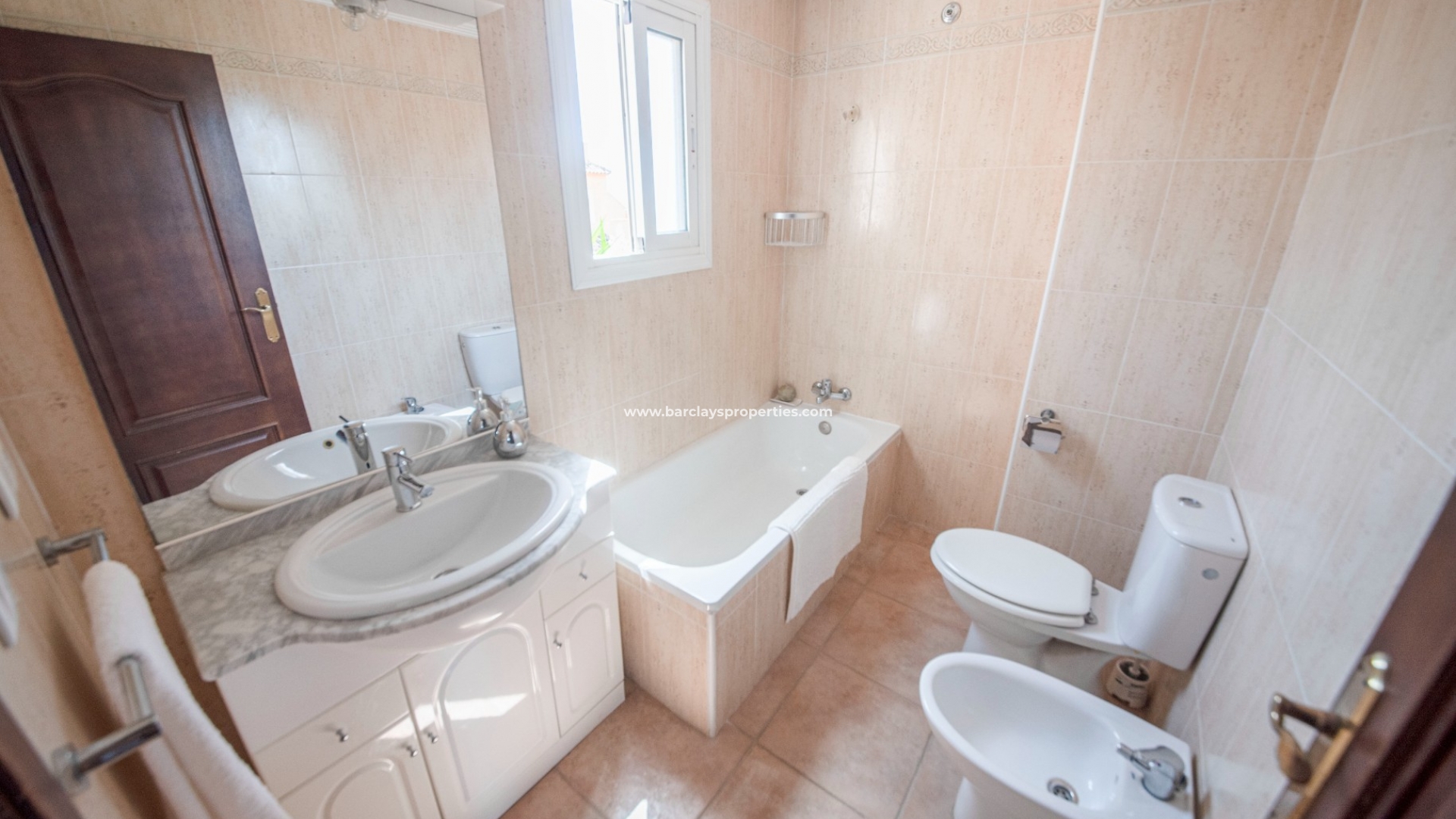 Trappen leiden ons naar de eerste verdieping en de familiebadkamer met een groot bad en bidet. De tweede slaapkamer is de hoofdslaapkamer met inbouwkasten en toegang tot het zonneterras met opslagfaciliteiten en een buitentrap die leidt naar het dakterras met een fantastische chill-outzone met prachtig uitzicht op de Vega Baja-regio.