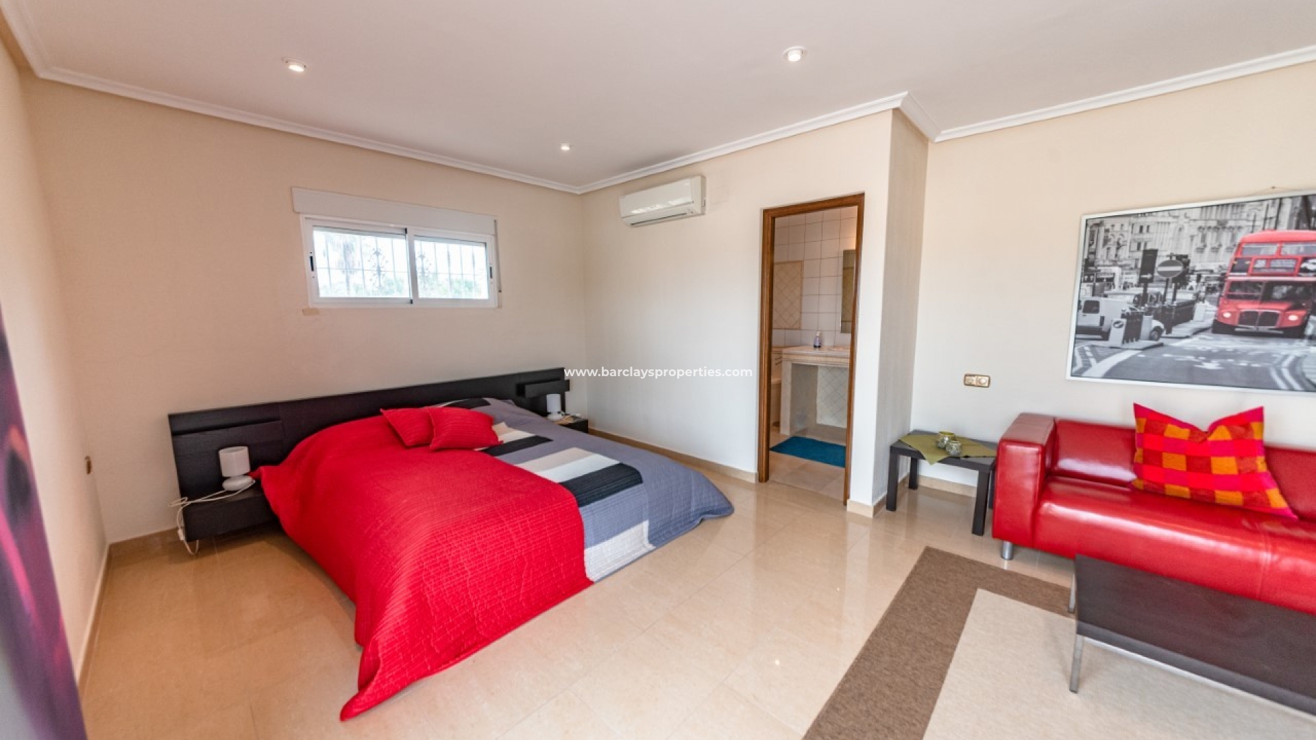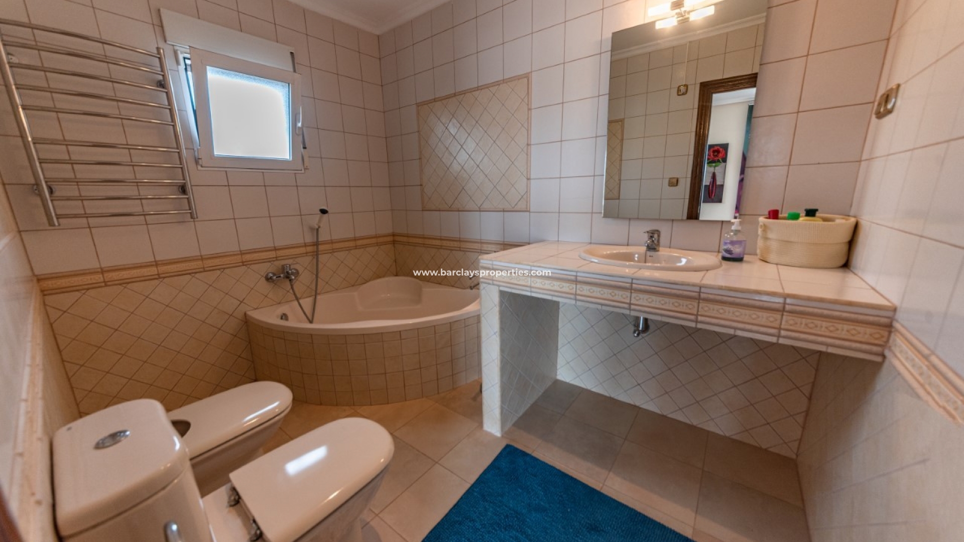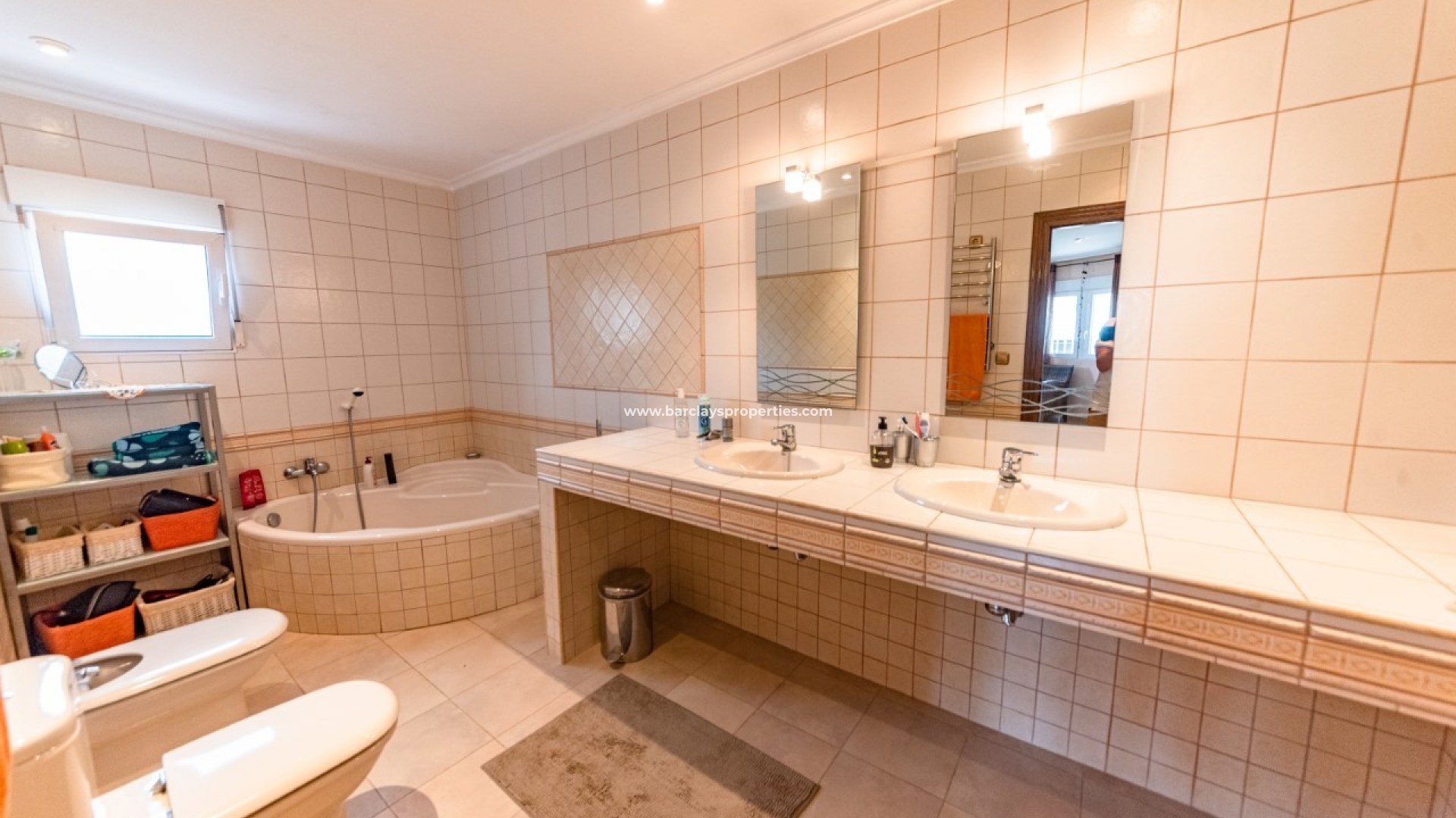 Drie grote dromerige tweepersoonskamers, allemaal met hun eigen en-suite badkamers en allemaal van goede grootte en twee met een inloopdouche. De grote hoofdslaapkamer heeft een prachtige inloopkast en een eigen en-suite badkamer met een dubbele wastafel en een hoekbad. Op de eerste verdieping vinden we de vierde grote tweepersoonsslaapkamer met een aangrenzende woonkamer met openslaande deuren naar een zonneterras met uitzicht op de tuin en het zwembad en een eigen en-suite badkamer.