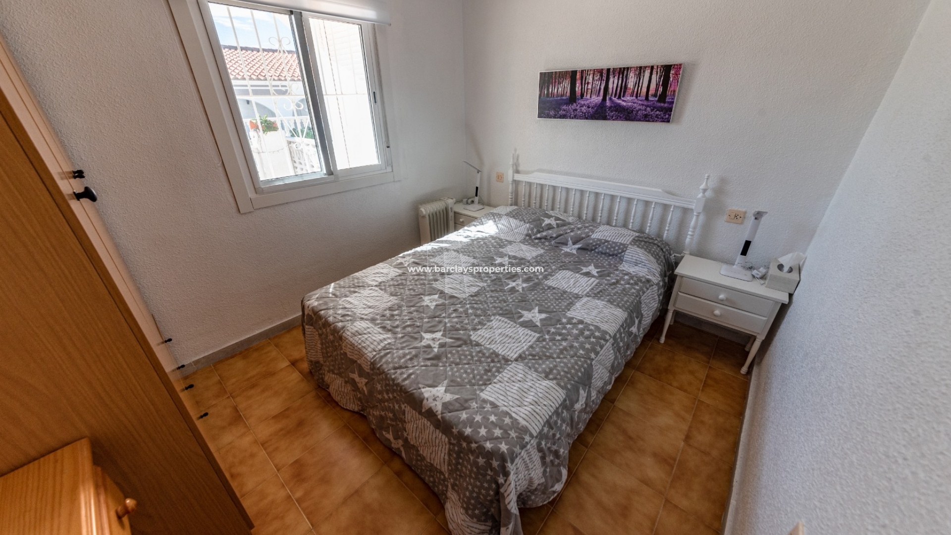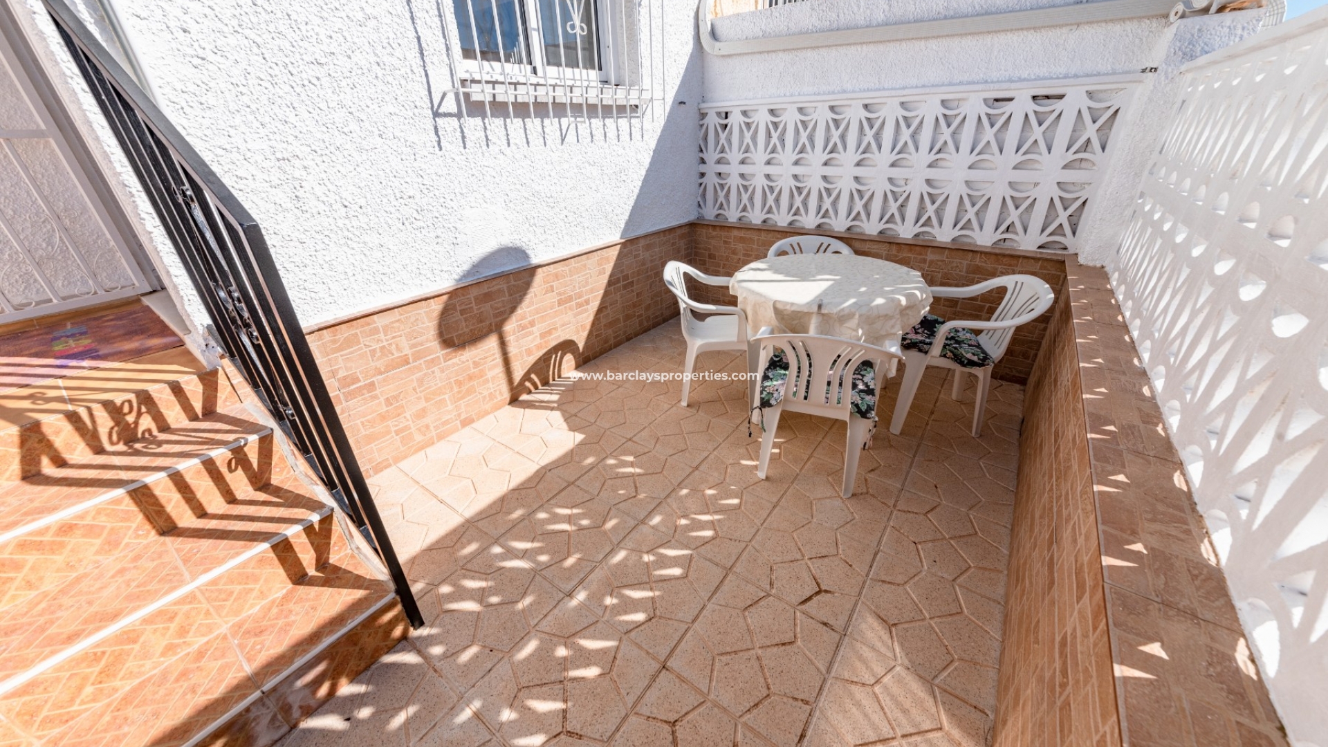 De voetgangerspoort geeft toegang tot dit mooie pand dat ons leidt naar het zonnige terras aan de voorzijde met een trap die leidt naar het verhoogde terras en het interieur van het pand dat bestaat uit een lichte woonkamer met open keuken, twee slaapkamers en een badkamer met inloop in de douche.