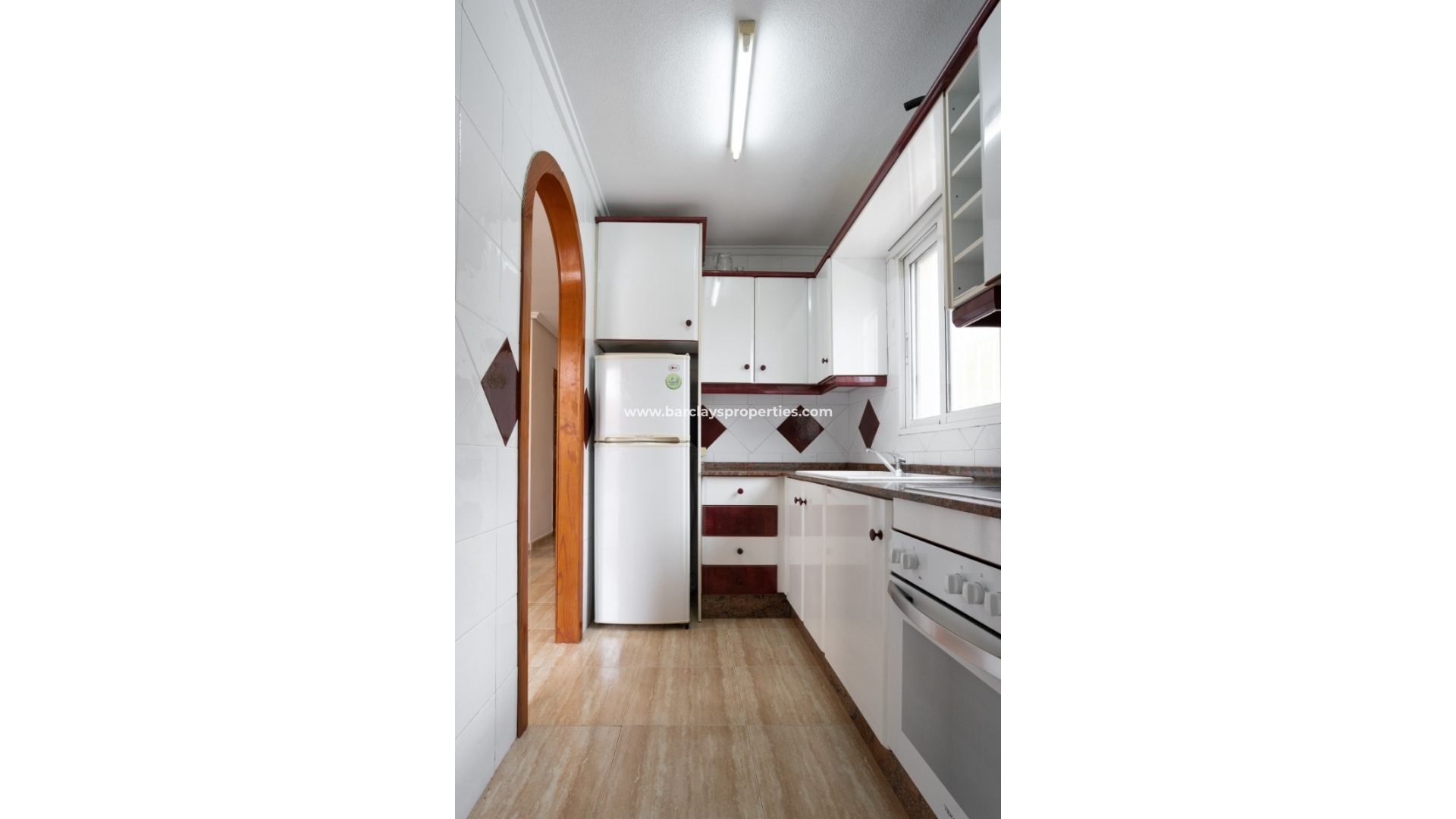 We betreden het pand via een verhoogd zonneterras en lopen recht in een mooi formaat moderne stijl lounge / eetkamer, verlicht door de overvloedige hoeveelheid natuurlijk licht dat naar binnen straalt door de grote ramen. Aan de rechterkant vinden we een onafhankelijke volledig ingerichte keuken met een bijkeuken. Aan het einde van de woonkamer is er een kleine hal waar we twee tweepersoons slaapkamers, een met een eigen airconditioning unit en ingebouwde kasten, evenals een badkamer met een grote walk-in muur tot muur douche te vinden.