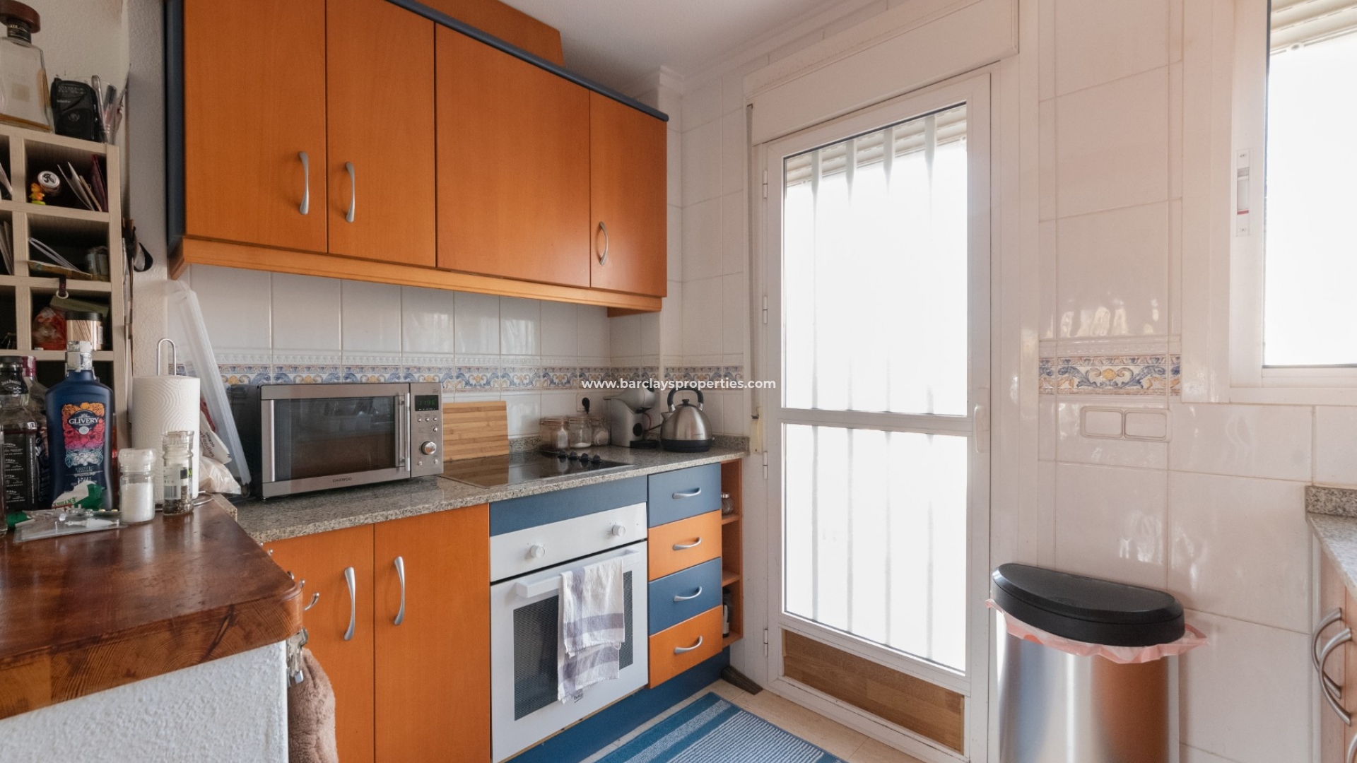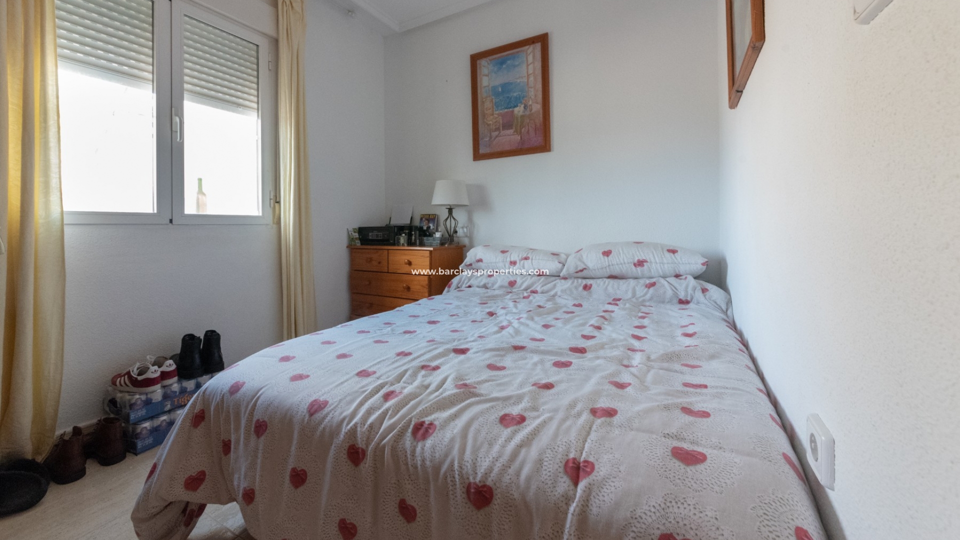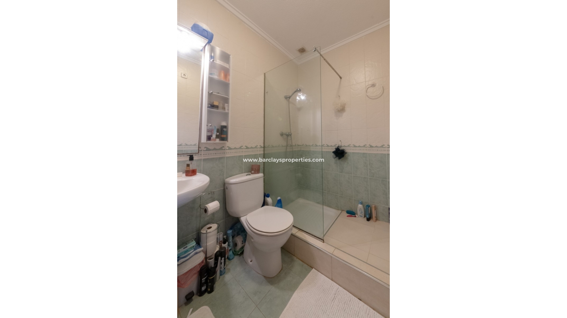 De achtertuin biedt een zit/barbecue aan de buitenzijde, opslagfaciliteiten, toegang tot het gemeenschappelijke zwembad en een buitentrap die leidt naar het solarium en een derde slaapkamer met tweepersoonsbed en een tweede badkamer met hoekdouche, een ideale plek voor gasten. Het solarium heeft opslagruimte en is het perfecte toevluchtsoord om de prachtige zonsondergangen over de bergen hier aan de Costa Blanca te bekijken.
