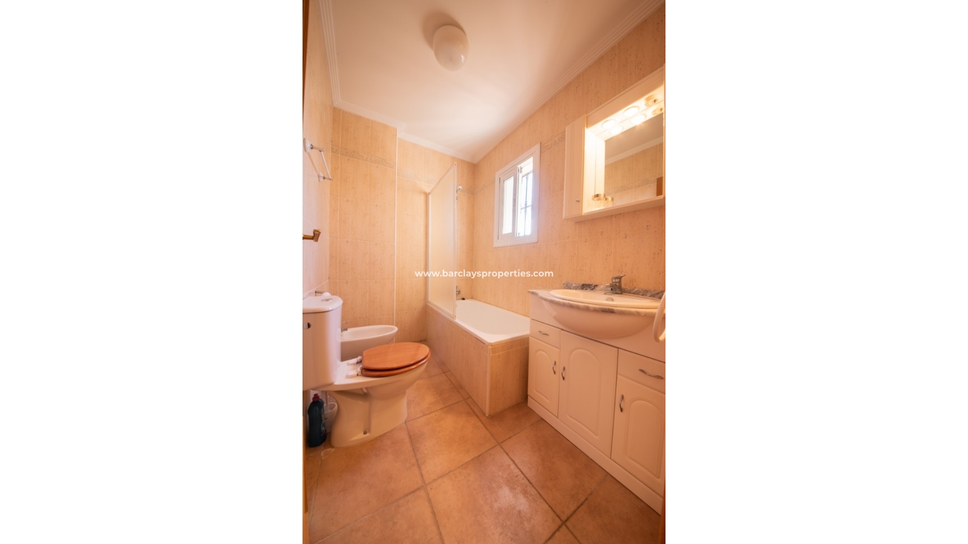 Een trap leidt ons naar de eerste verdieping met een volledig uitgeruste betegelde badkamer met full size bad en bidet, naast de badkamer is de master slaapkamer met airconditioning en openslaande deuren naar een eigen zonneterras met berging / bijkeuken, een buiten zithoek en een trap naar het solarium met een prachtig uitzicht op het platteland en de bergen.