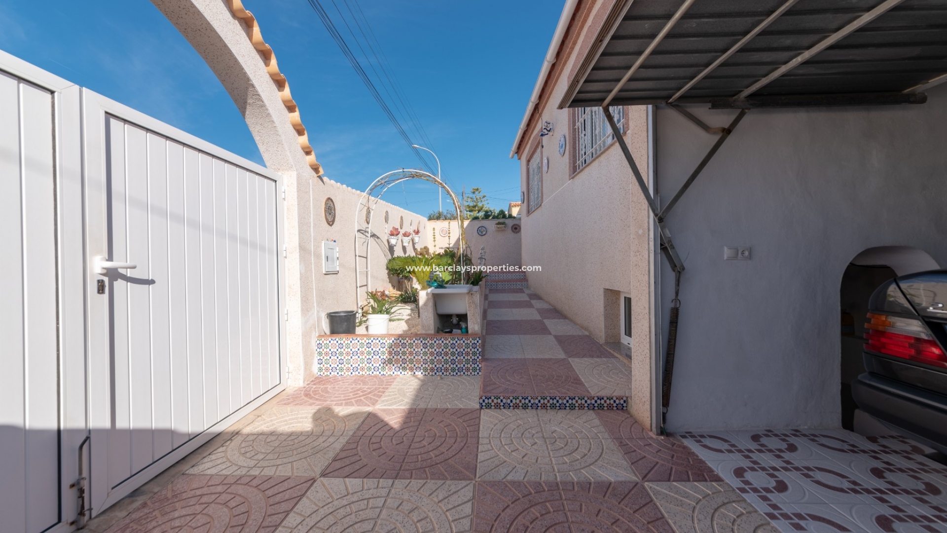 Deze gerenoveerde woning biedt hoge muren voor privacy en geeft toegang via de oprit poorten die leiden naar de volledig verharde weinig onderhoud voortuin met eigen garage.