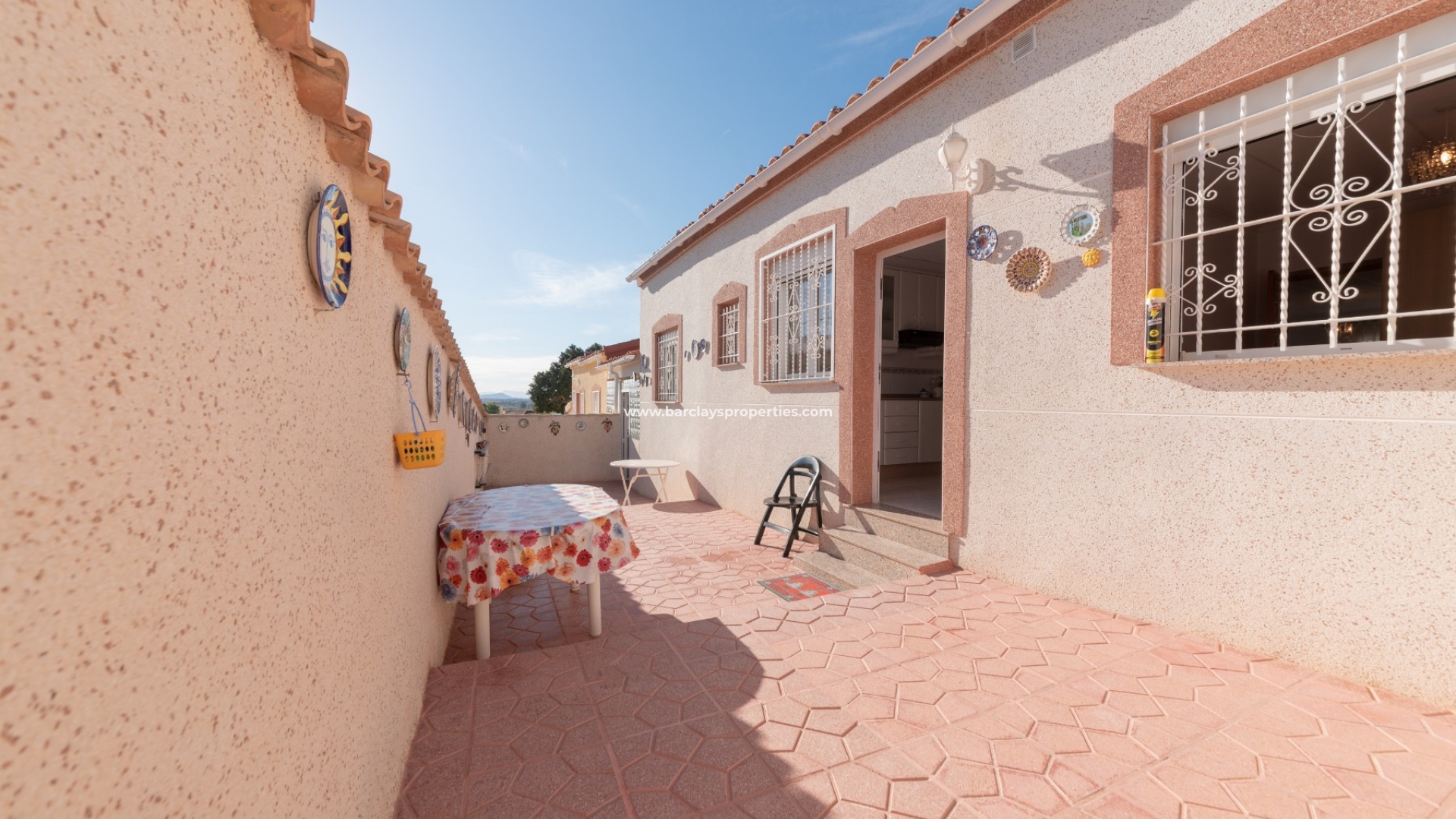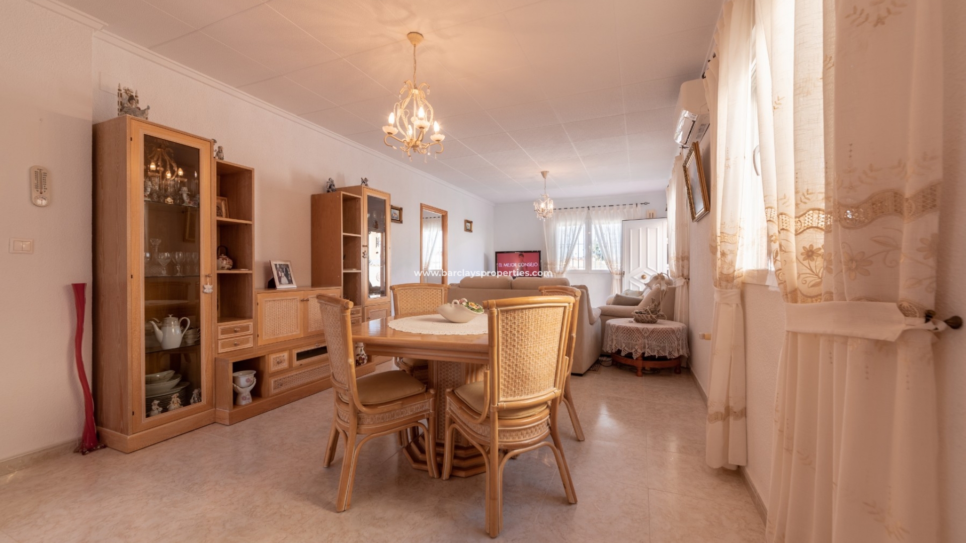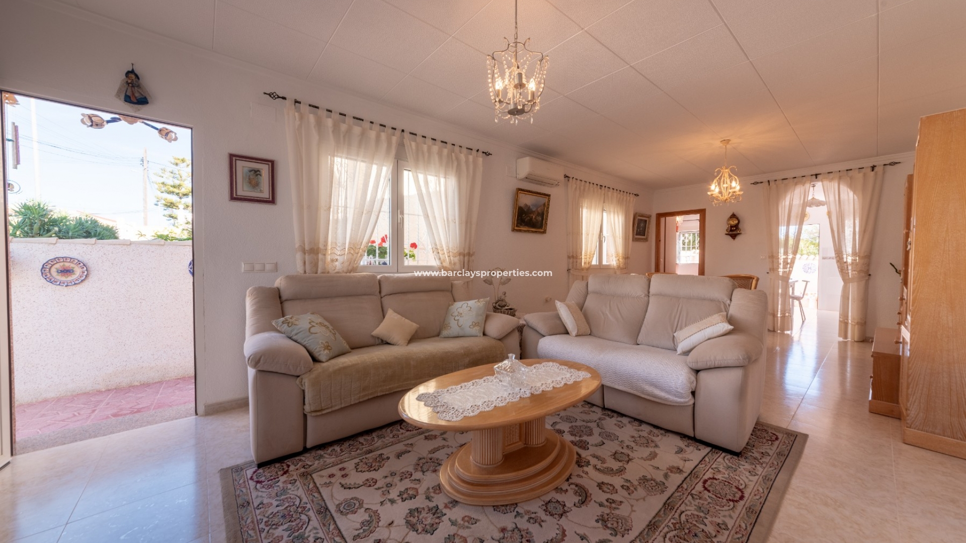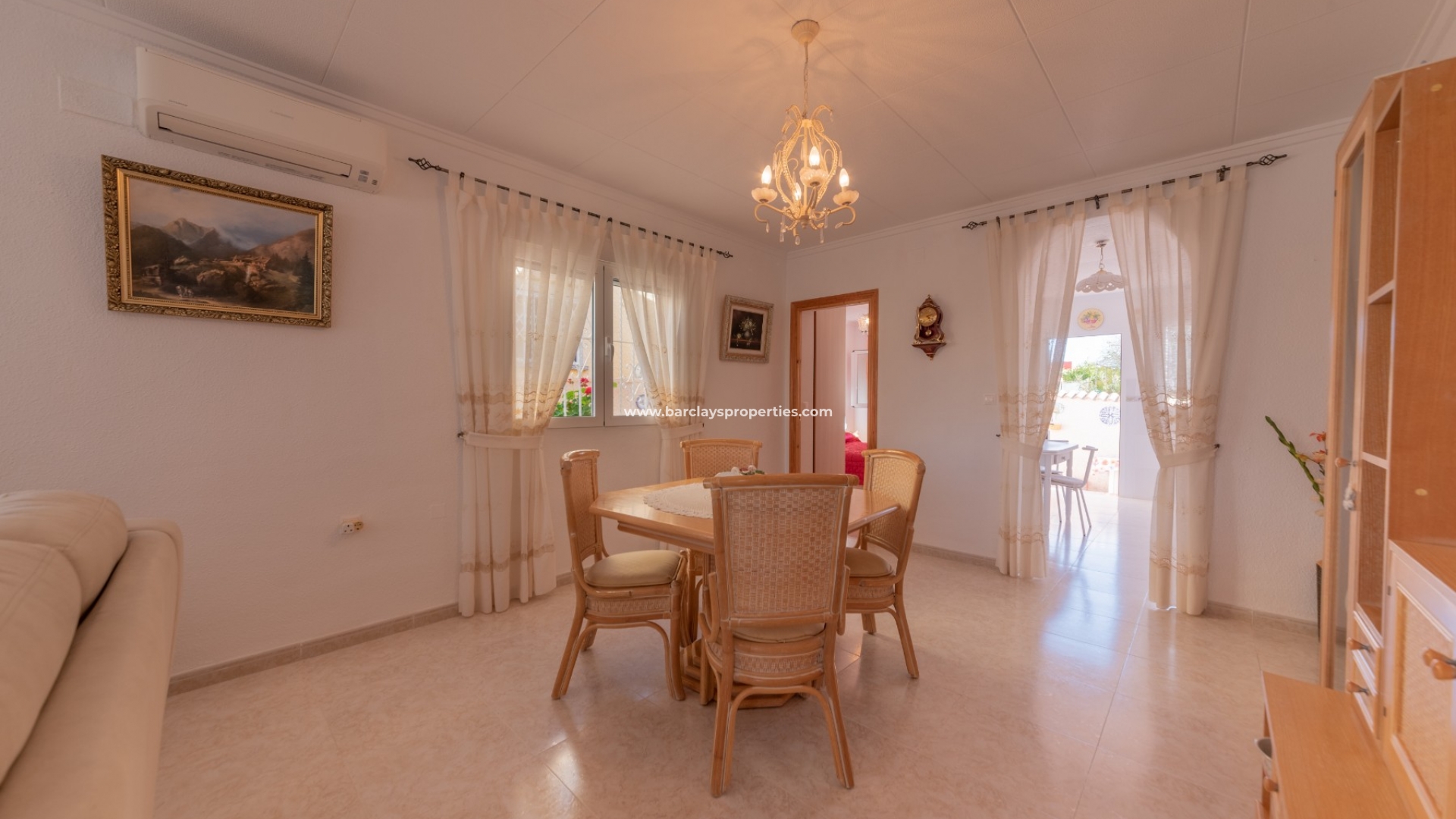 Het interieur van de woning is geheel gelijkvloers en ideaal voor iedereen die niet dagelijks trappen wil lopen. We worden verwelkomd door de ruime en lichte woon / eetkamer met airconditioning en "draai-kiep" aluminium ramen met dubbele beglazing die veel natuurlijk licht geven, een onafhankelijke volledig ingerichte keuken met eethoek en toegangsdeur naar de patio aan de achterzijde, vier ruime tweepersoons slaapkamers en een badkamer met inloopdouche.