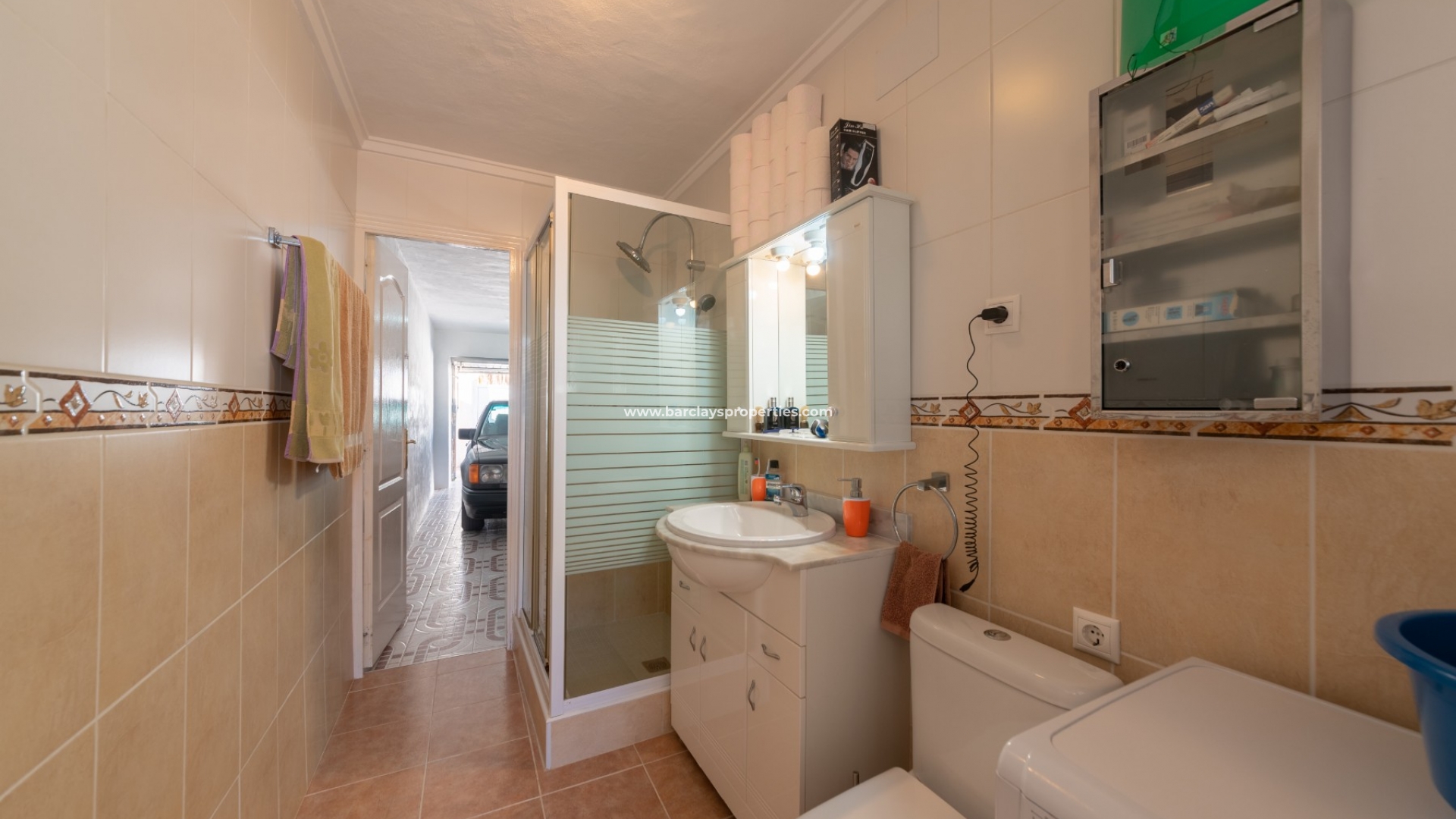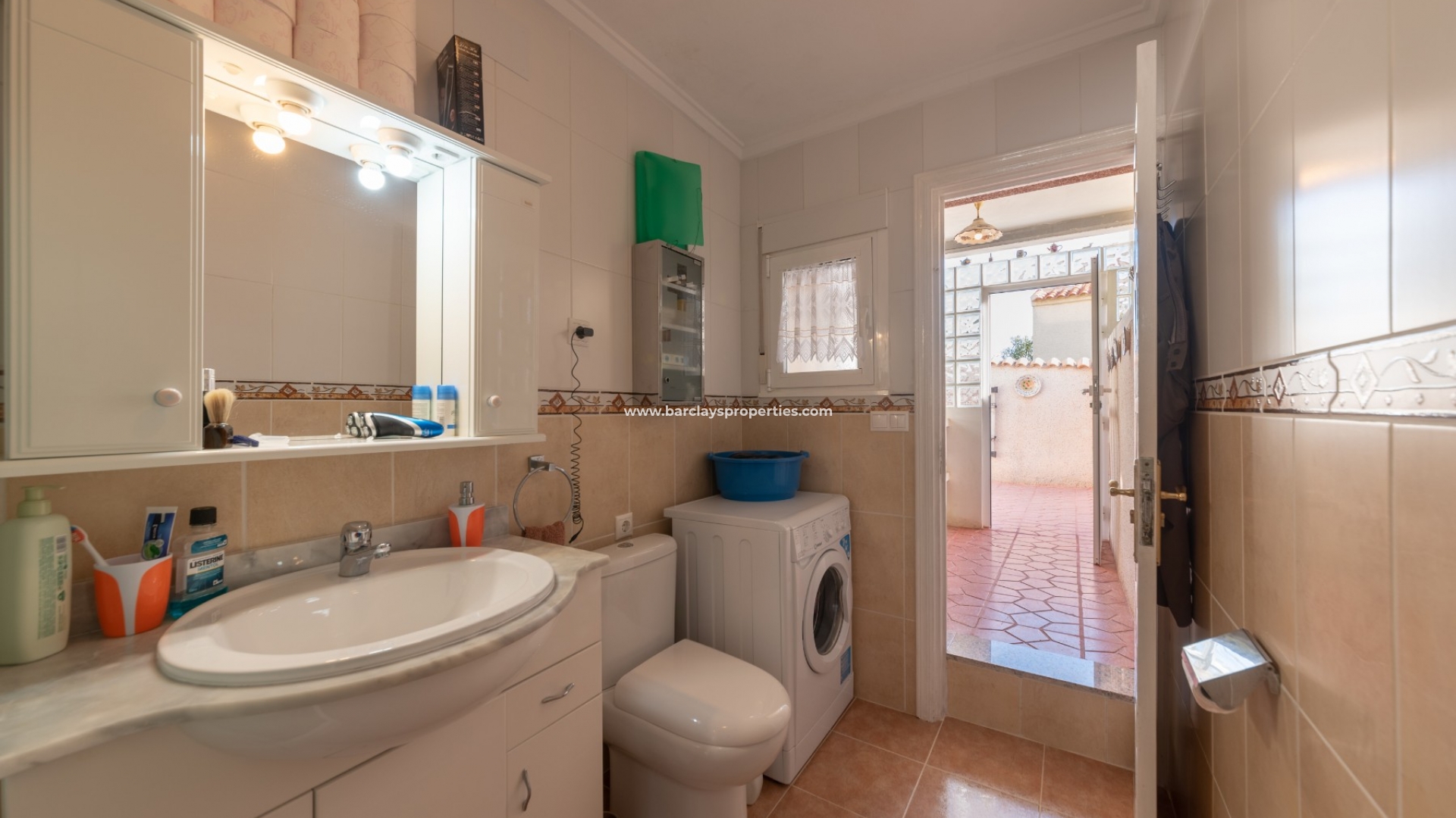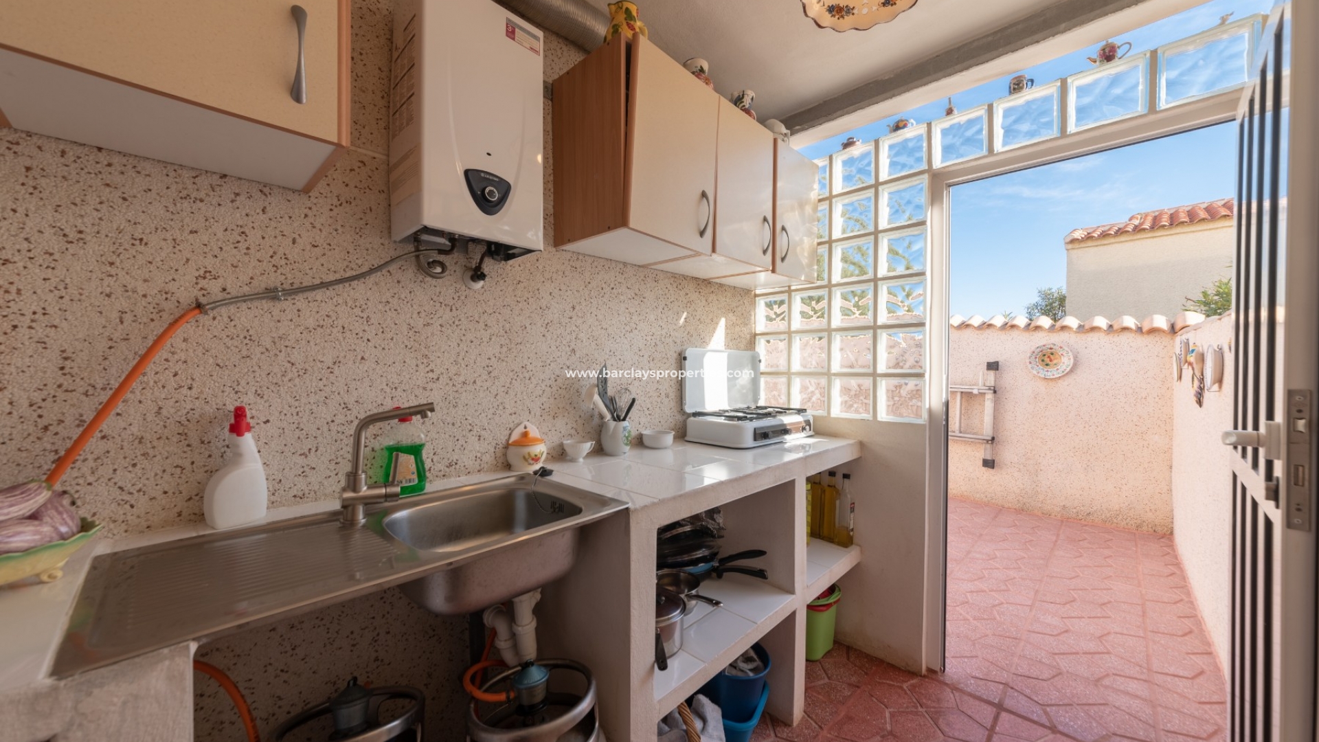 Vanaf de patio achteraan vinden we een gesloten buitenkeuken met gasboiler, een deur geeft toegang tot een buitendouchekamer met wastafel badmeubel en w.c en de privégarage kan vanuit deze kamer worden betreden.