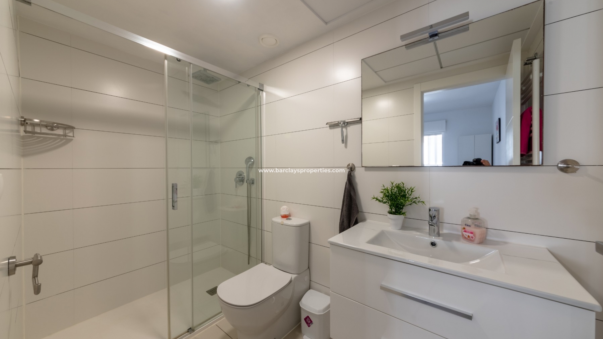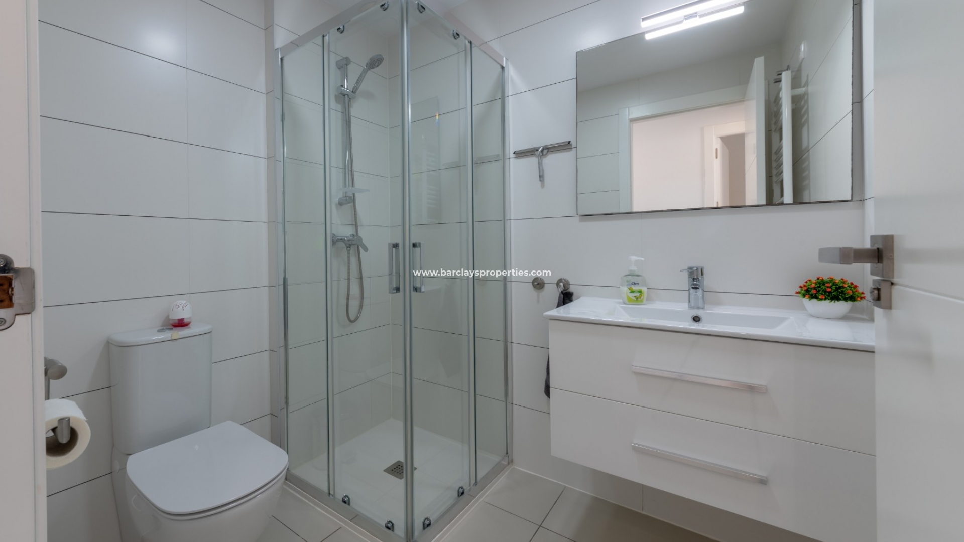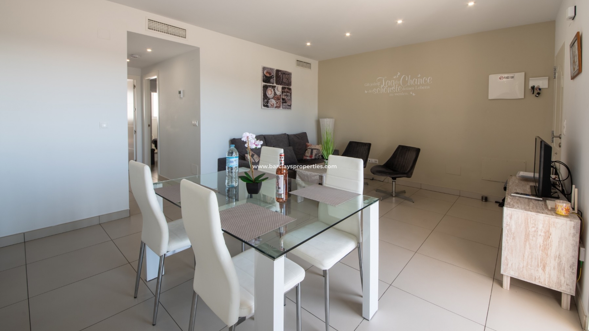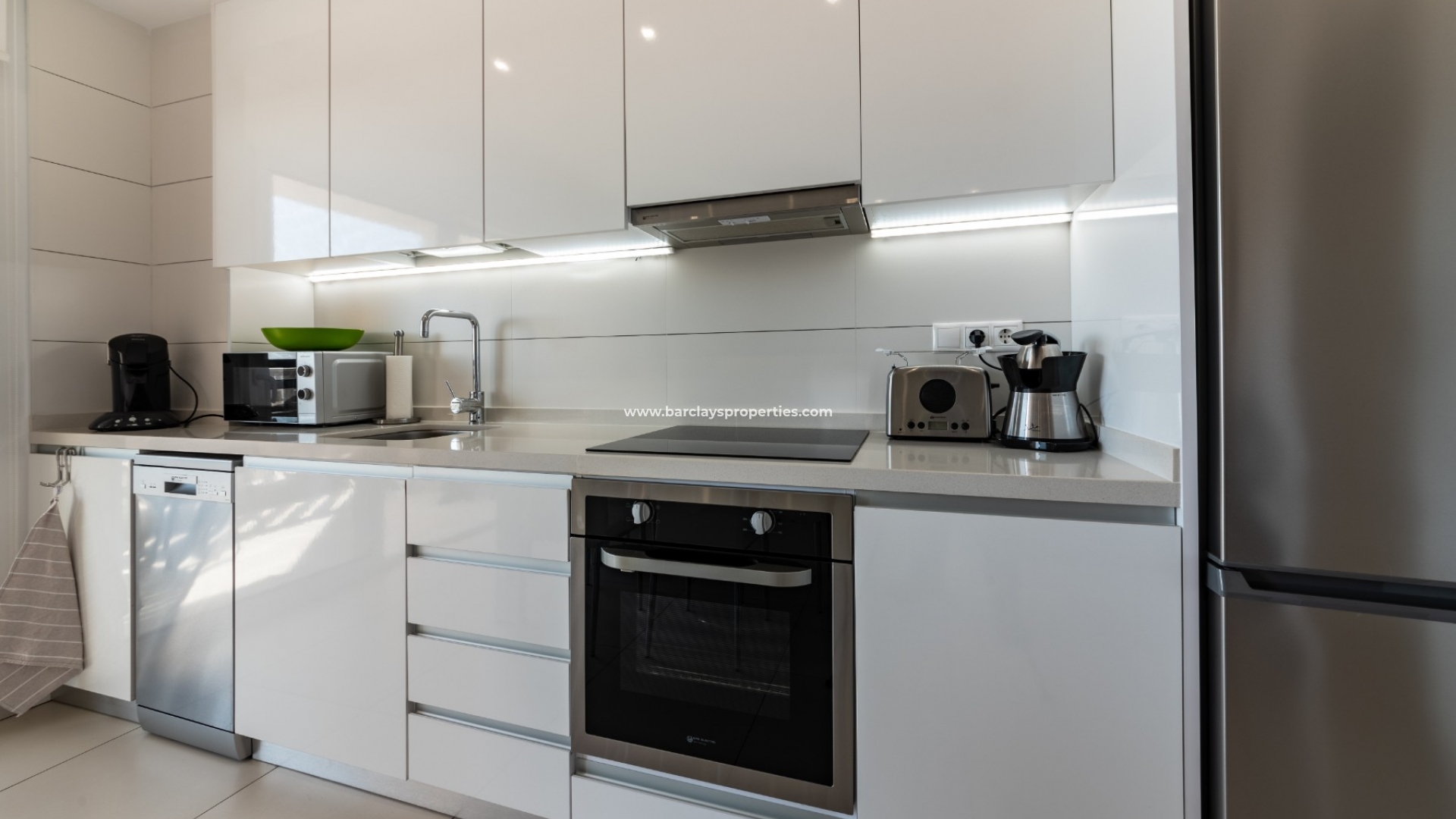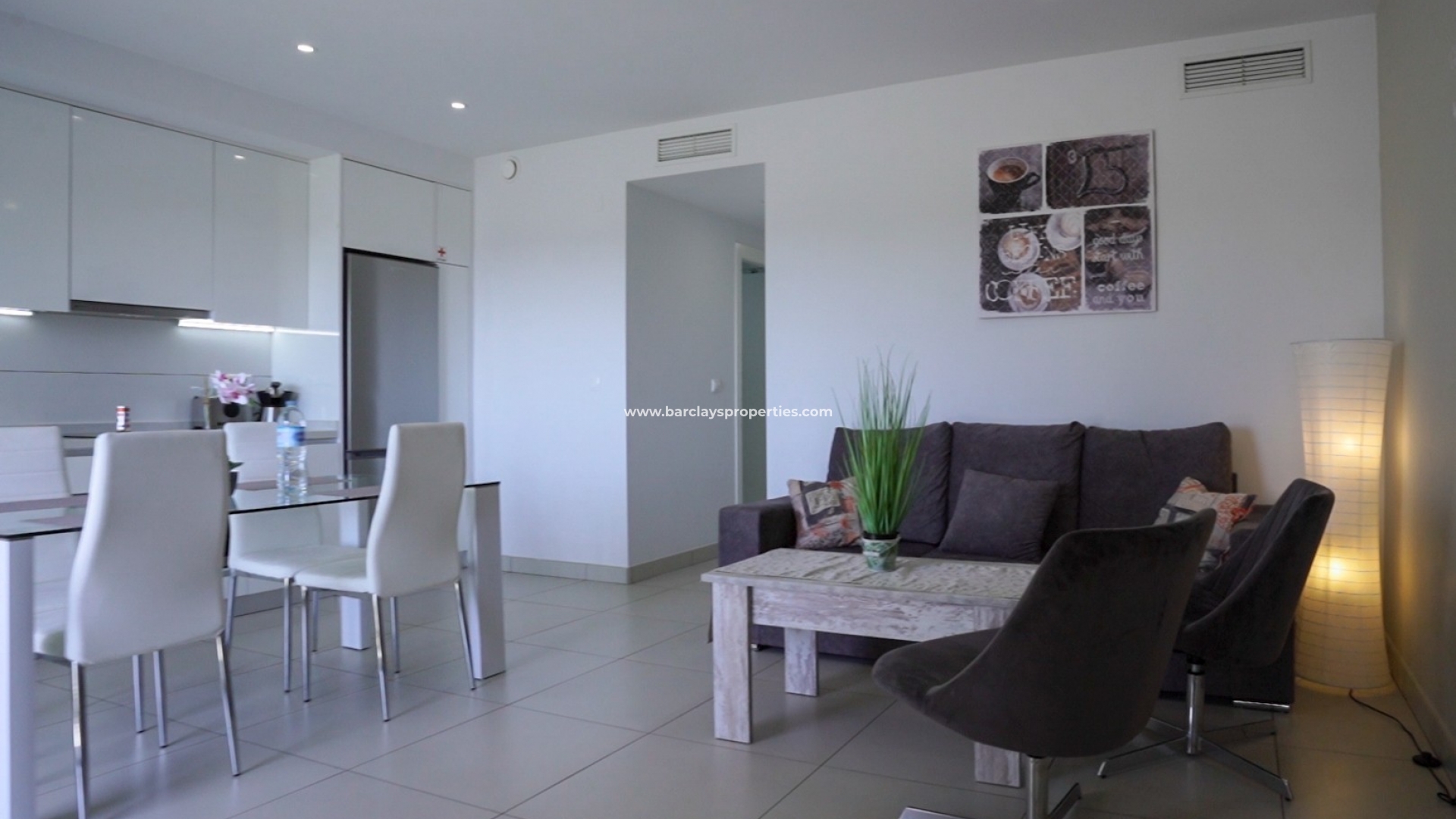 Een intercom systeem geeft toegang tot het appartement waar we de voorste veiligheidsdeur vinden die leidt naar het interieur van het pand en een ruime, moderne woonkamer / eetkamer en grote volledig ingerichte open keuken met vaatwasser, kookplaat en oven en koelkast met vriesvak. Een overdekt zonneterras kan worden bereikt vanuit de woonkamer en biedt een prachtig uitzicht. Vanuit de hal vinden we een moderne badkamer met hoekdouche, twee dubbele slaapkamers met ingebouwde kasten, de master heeft openslaande deuren die leiden naar een bijkeuken, evenals genieten van een en-suite badkamer met muur-tot-muur douche. Deze moderne woning heeft mooie afwerkingen die het een mooie schone, frisse sfeer geven, zoals geïntegreerde airconditioning (warm koud), gladde, moderne witte binnendeuren, LED spiegels, plafondspots, alle ramen met horren en smaakvol meubilair.
