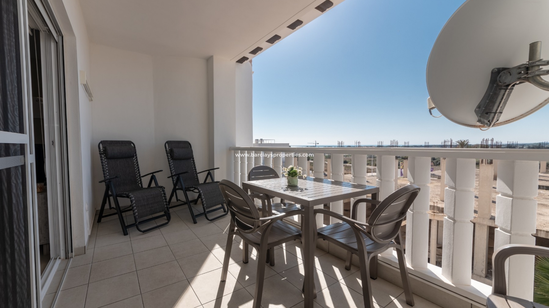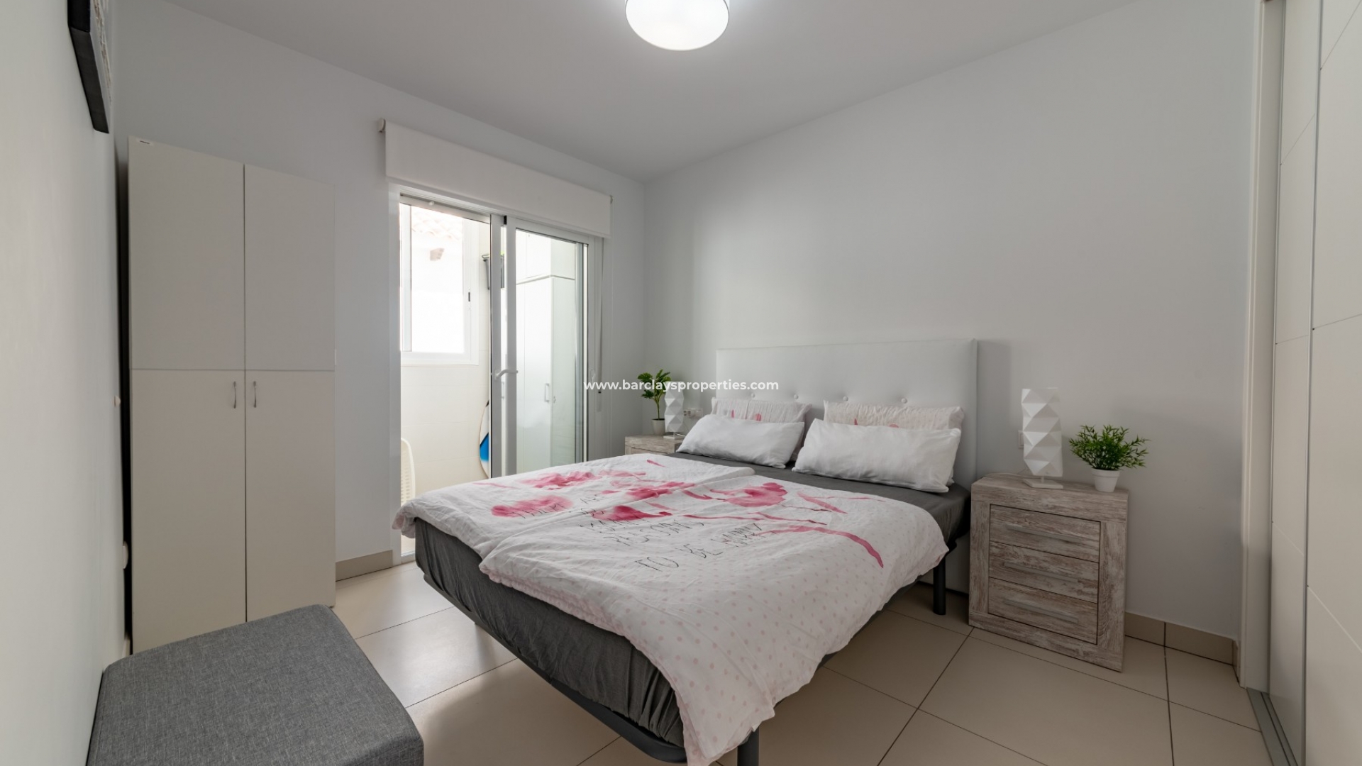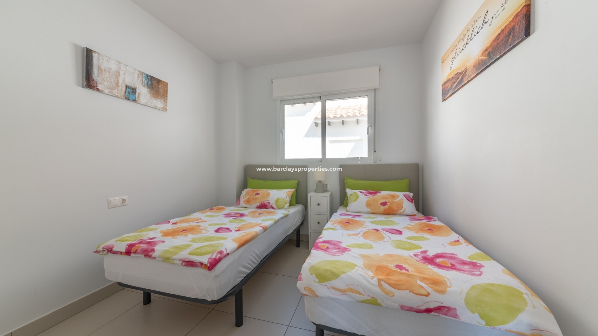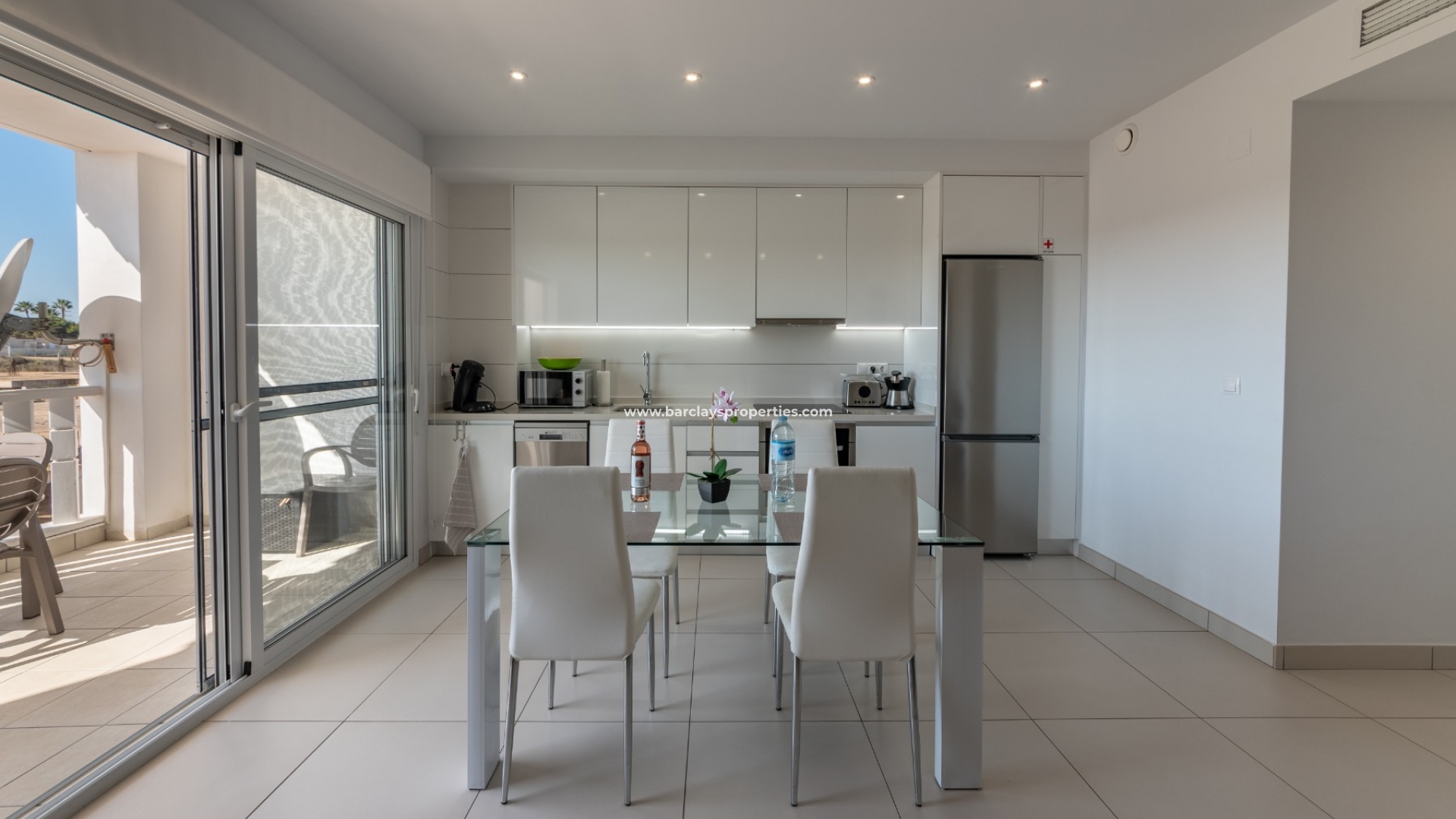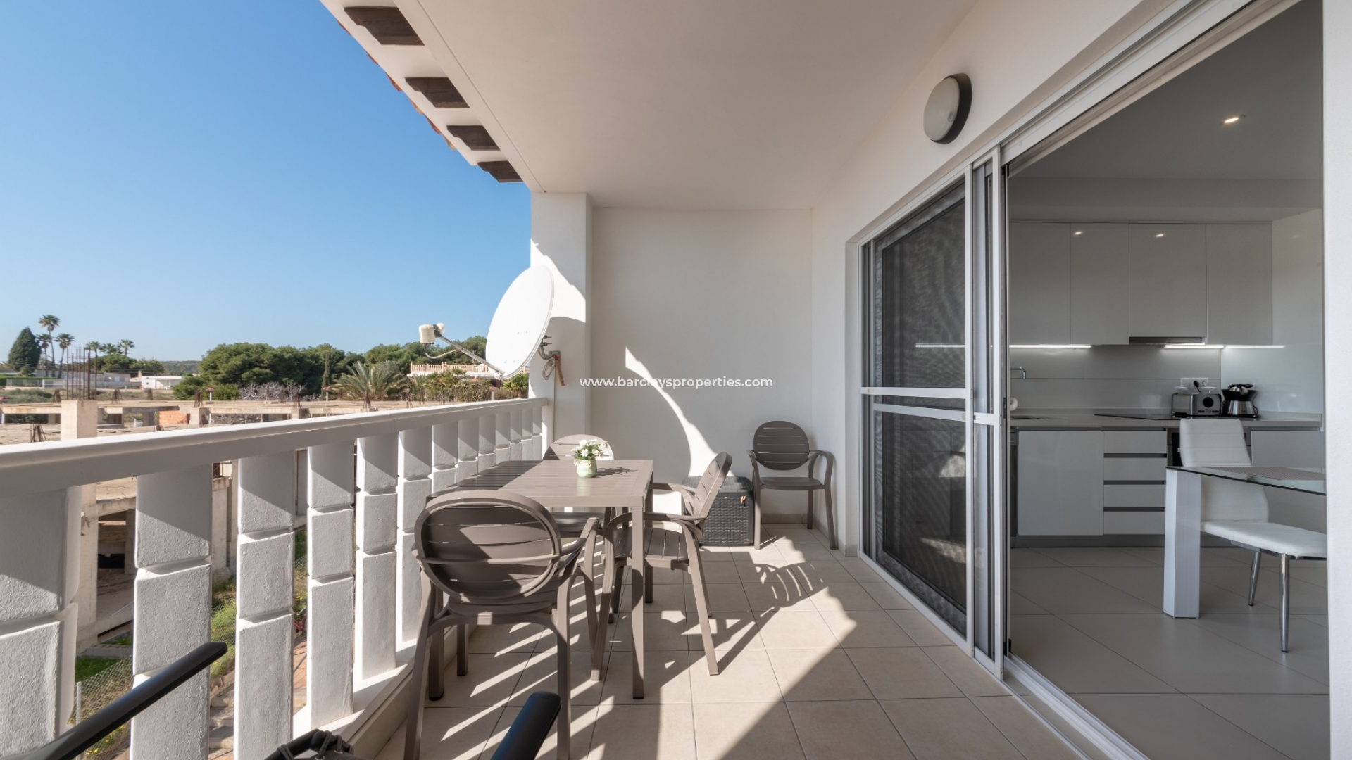 Een intercom systeem geeft toegang tot het appartement waar we de voorste veiligheidsdeur vinden die leidt naar het interieur van het pand en een ruime, moderne woonkamer / eetkamer en grote volledig ingerichte open keuken met vaatwasser, kookplaat en oven en koelkast met vriesvak. Een overdekt zonneterras kan worden bereikt vanuit de woonkamer en biedt een prachtig uitzicht. Vanuit de hal vinden we een moderne badkamer met hoekdouche, twee dubbele slaapkamers met ingebouwde kasten, de master heeft openslaande deuren die leiden naar een bijkeuken, evenals genieten van een en-suite badkamer met muur-tot-muur douche. Deze moderne woning heeft mooie afwerkingen die het een mooie schone, frisse sfeer geven, zoals geïntegreerde airconditioning (warm koud), gladde, moderne witte binnendeuren, LED spiegels, plafondspots, alle ramen met horren en smaakvol meubilair.