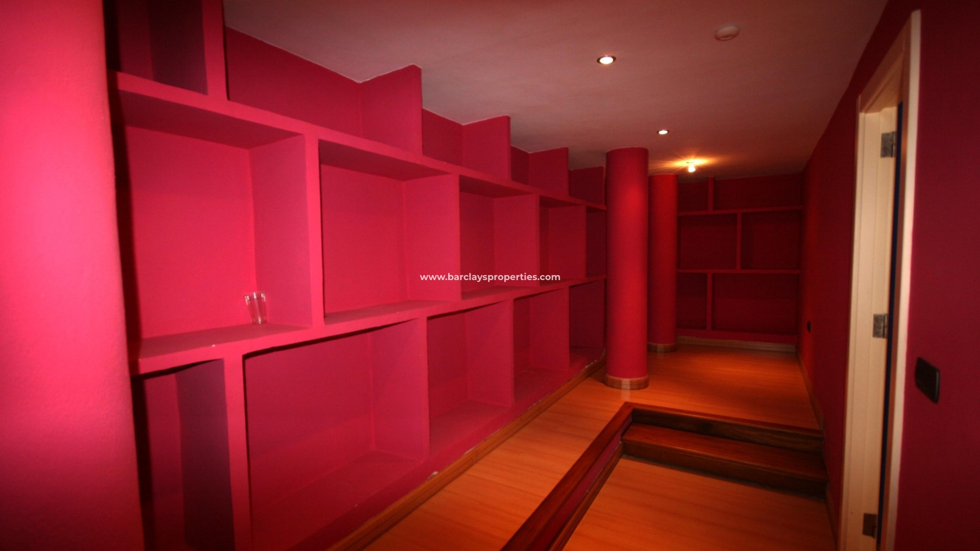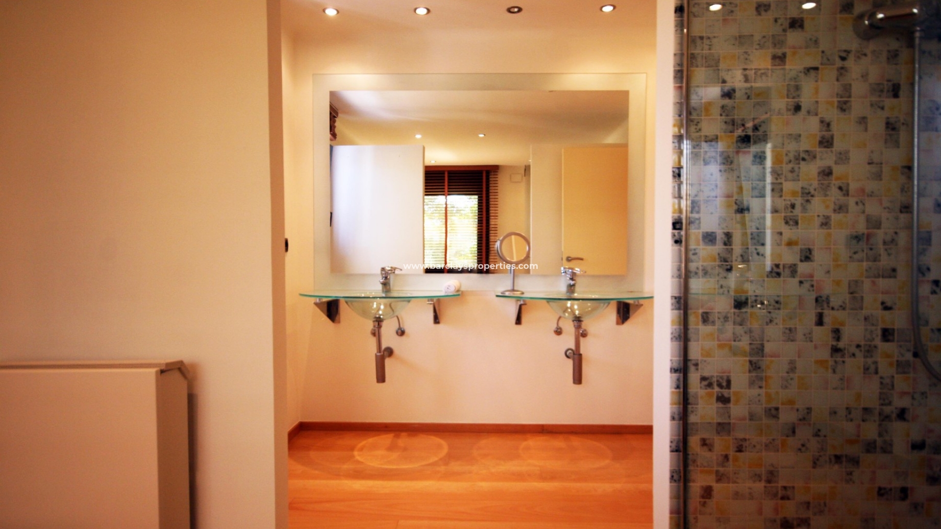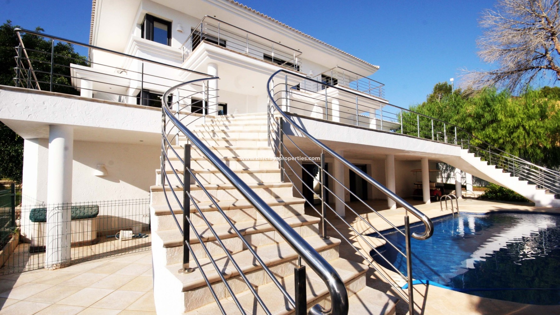 Deze prachtige villa is gebouwd volgens een zeer hoge standaard op een royaal perceel van 1.053m2 met een eigen privé zwembad. De woning zelf is 500m2 met 9 slaapkamers en 5 badkamers verdeeld over drie verdiepingen. Op de begane grond vinden we een bioscoop projectie kamer, slaapkamers, een eigen fitnessruimte, een wijnkelder, terras en een garage voor twee voertuigen. Op de eerste verdieping is er een inkomhal, een woonkamer, een onafhankelijke volledig uitgeruste keuken met een eiland en Porcelanosa apparatuur, een slaapkamer, een badkamer en een groot terras met uitzicht op het zwembad en met een adembenemend uitzicht op de Middellandse Zee. Op de laatste verdieping zijn er nog twee slaapkamers, waarvan een de master bedroom is met een en-suite badkamer en een inloopkast.