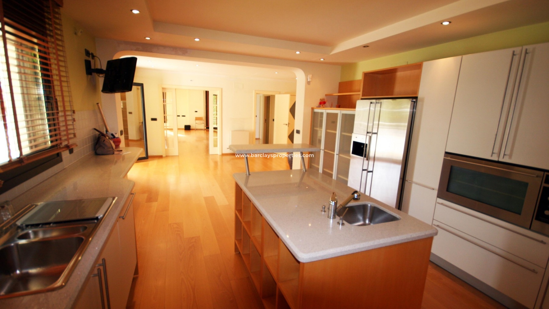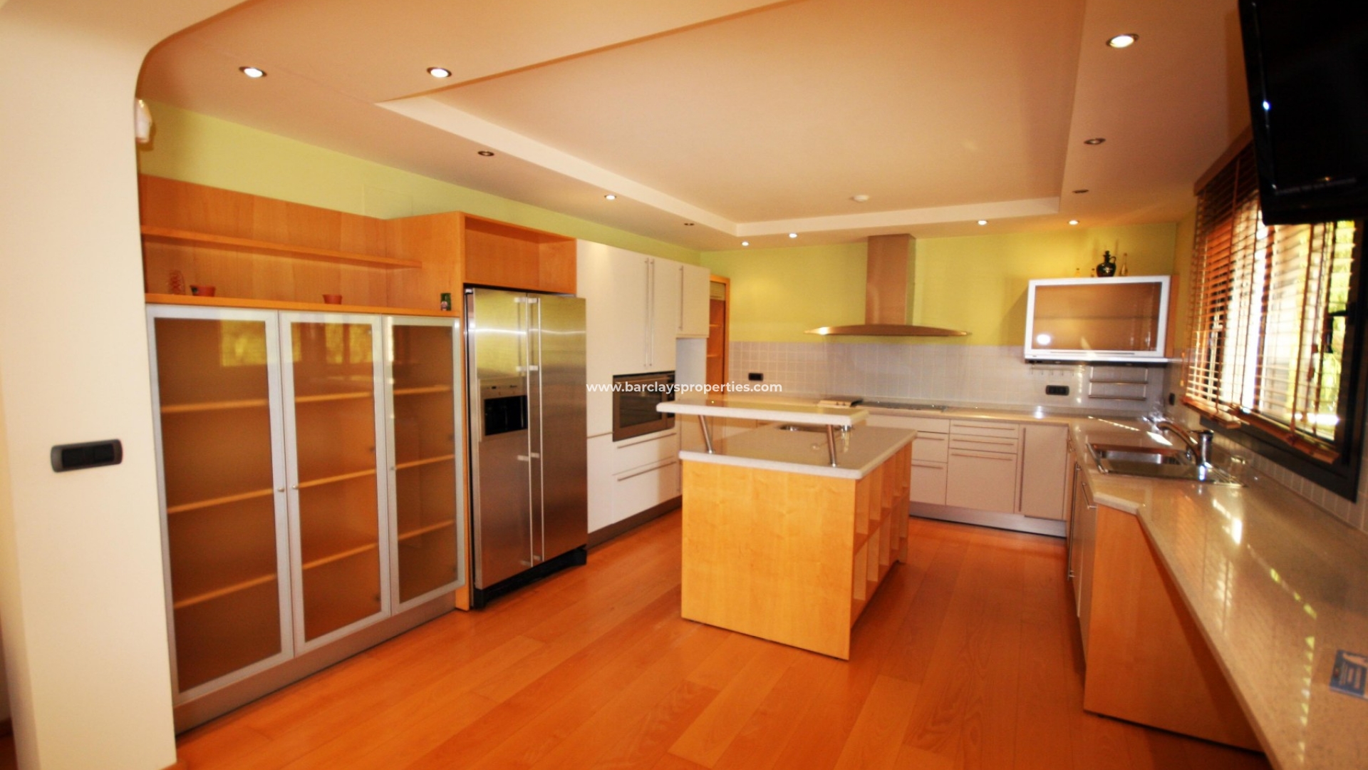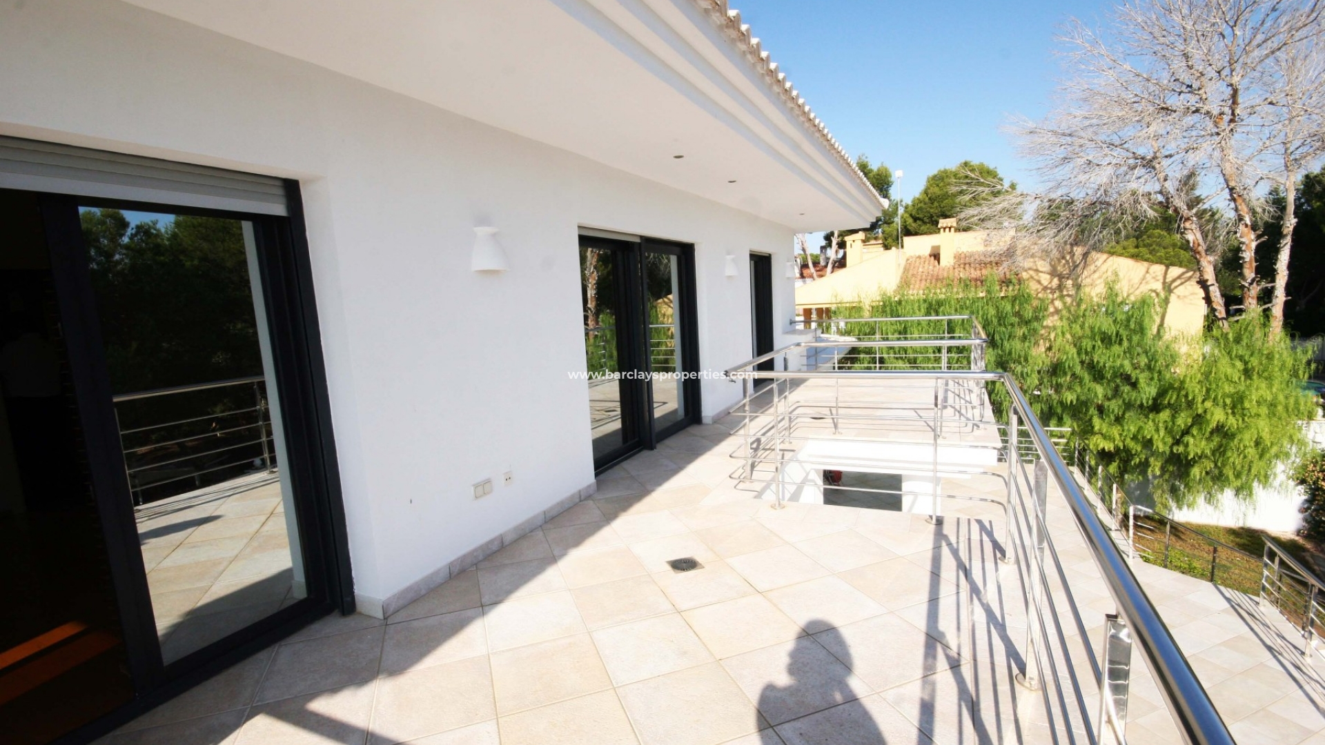Deze prachtige villa is gebouwd volgens een zeer hoge standaard op een royaal perceel van 1.053m2 met een eigen privé zwembad. De woning zelf is 500m2 met 9 slaapkamers en 5 badkamers verdeeld over drie verdiepingen. Op de begane grond vinden we een bioscoop projectie kamer, slaapkamers, een eigen fitnessruimte, een wijnkelder, terras en een garage voor twee voertuigen. Op de eerste verdieping is er een inkomhal, een woonkamer, een onafhankelijke volledig uitgeruste keuken met een eiland en Porcelanosa apparatuur, een slaapkamer, een badkamer en een groot terras met uitzicht op het zwembad en met een adembenemend uitzicht op de Middellandse Zee. Op de laatste verdieping zijn er nog twee slaapkamers, waarvan een de master bedroom is met een en-suite badkamer en een inloopkast.