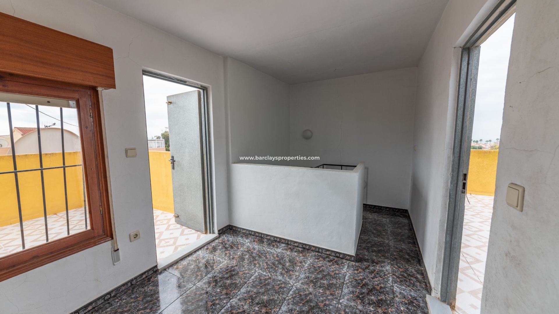 Terug in de ontvangsthal is er een marmeren trap met zijn eigen berging netjes weggestopt onder de trap. Via deze trap komen we op de tweede verdieping waar we een grote zitkamer vinden met een eigen bar, een tweepersoonsslaapkamer met airconditioning, ingebouwde kledingkast en een eigen privéterras. Er is ook een volledig ingerichte badkamer met een bad en een wenteltrap die ons naar het volgende niveau brengt. Hier komen we op een grote overloop met aan weerszijden deuren die ons naar twee aparte solariums leiden, waarvan één met uitzicht op zee! Het is de perfecte plek om uw zomer chill-out gebied voor alfresco dineren, zonnebaden en sterrenkijken te creëren!
