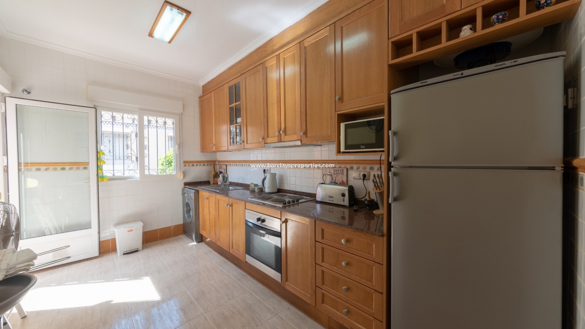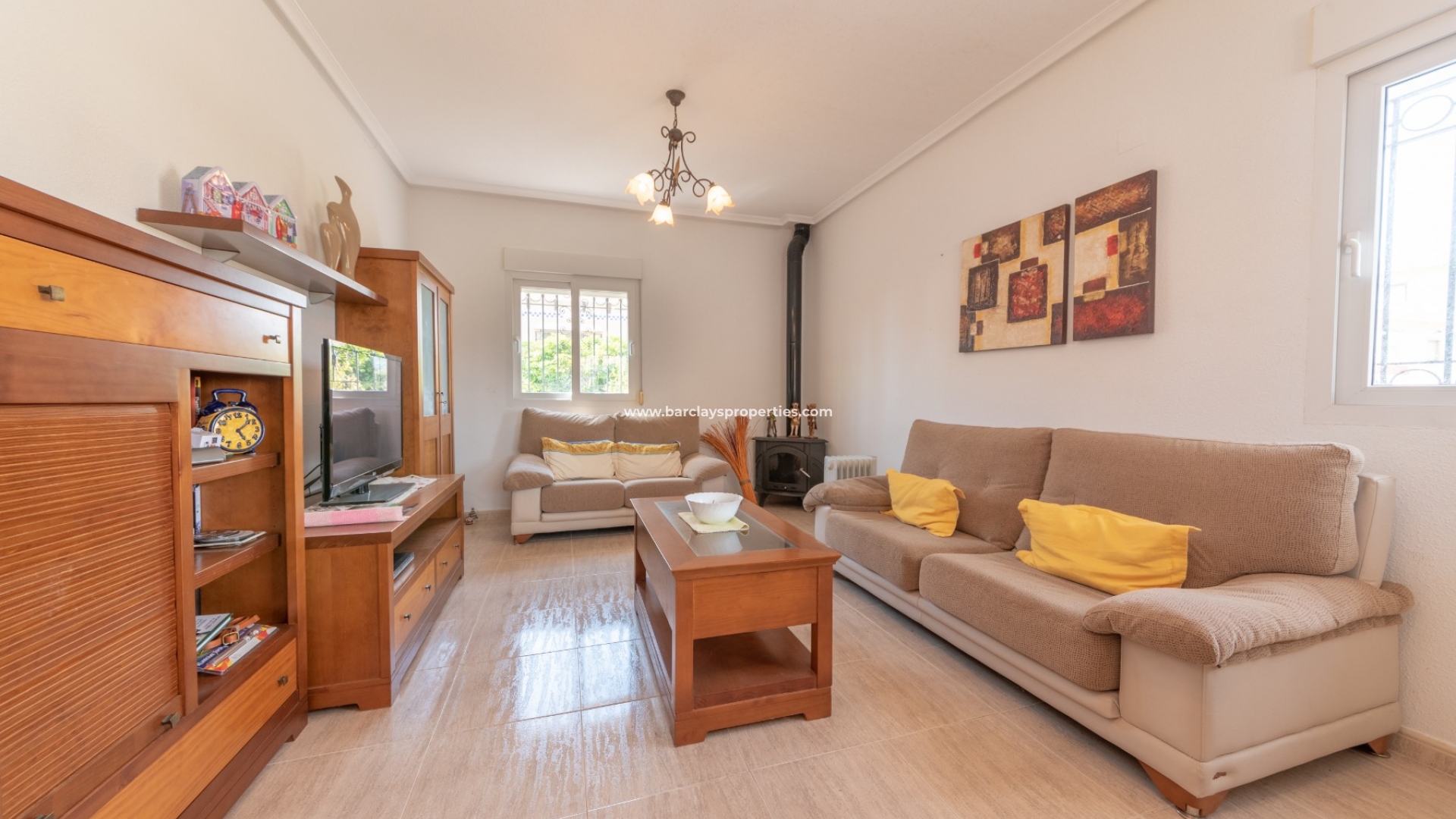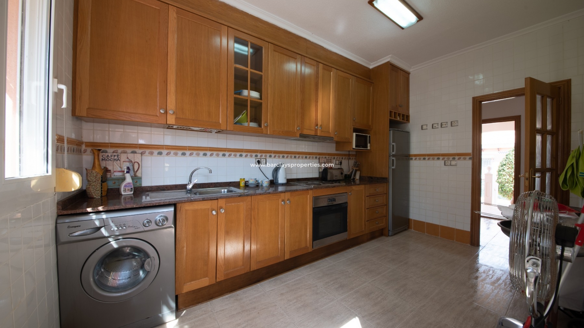 We worden verwelkomd door een grote verhoogde overdekte veranda met balustrades, buitenverlichting en plafondventilator die leidt naar het interieur van het pand waar we worden verwelkomd door een hal die leidt naar een grote woonkamer met houtkachel en ramen met dubbele beglazing die leidt naar de onafhankelijke volledig ingerichte keuken met granieten aanrechtblad. Een deur leidt vanuit de keuken naar een bijkeuken met een trap naar het zonneterras met prachtig uitzicht op de bergen, een heerlijke plek om te genieten van de prachtige zonsondergangen die we hier aan de Costa Blanca hebben.