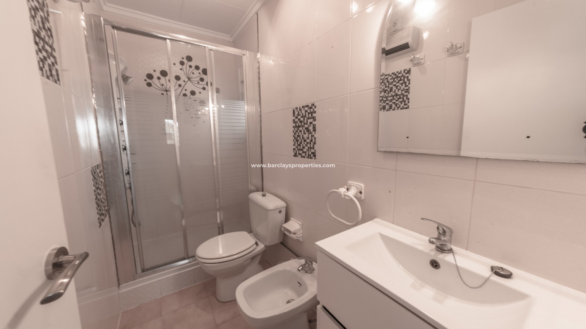 Aan de rechterkant van de woonkamer vinden we een kleine hal die ons leidt naar twee slaapkamers met ingebouwde kasten en airconditioning, samen met een volledig ingerichte badkamer die is gerenoveerd met een muur-tot-muur douche.