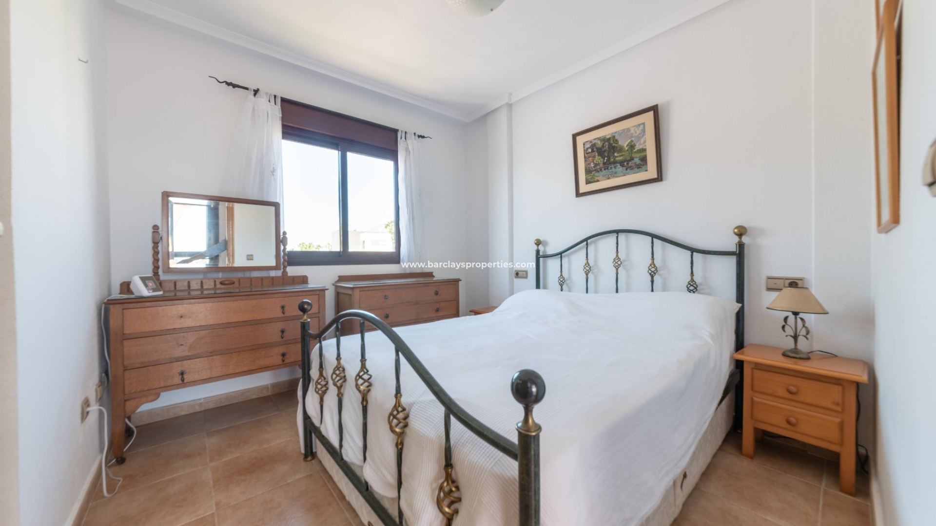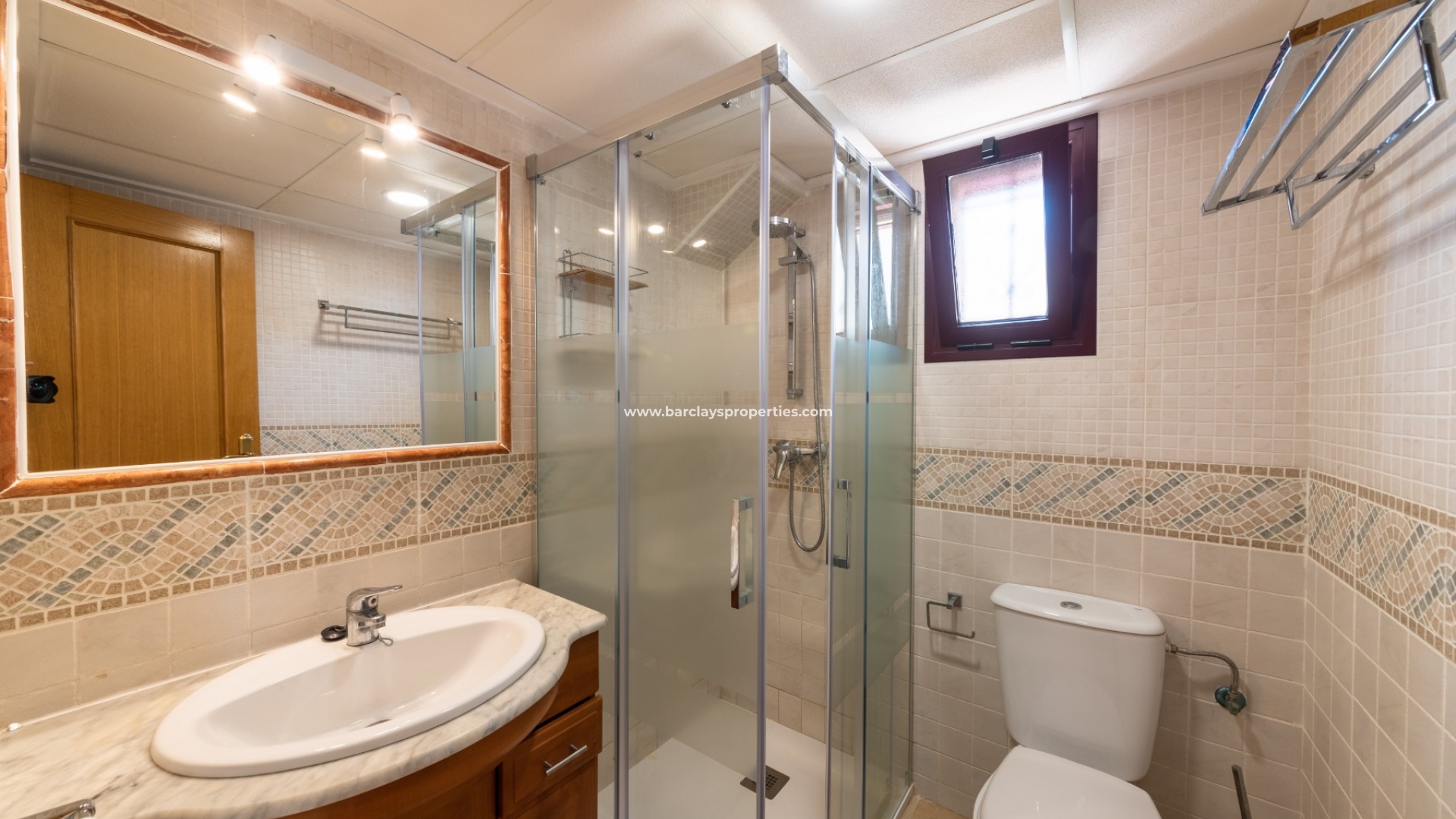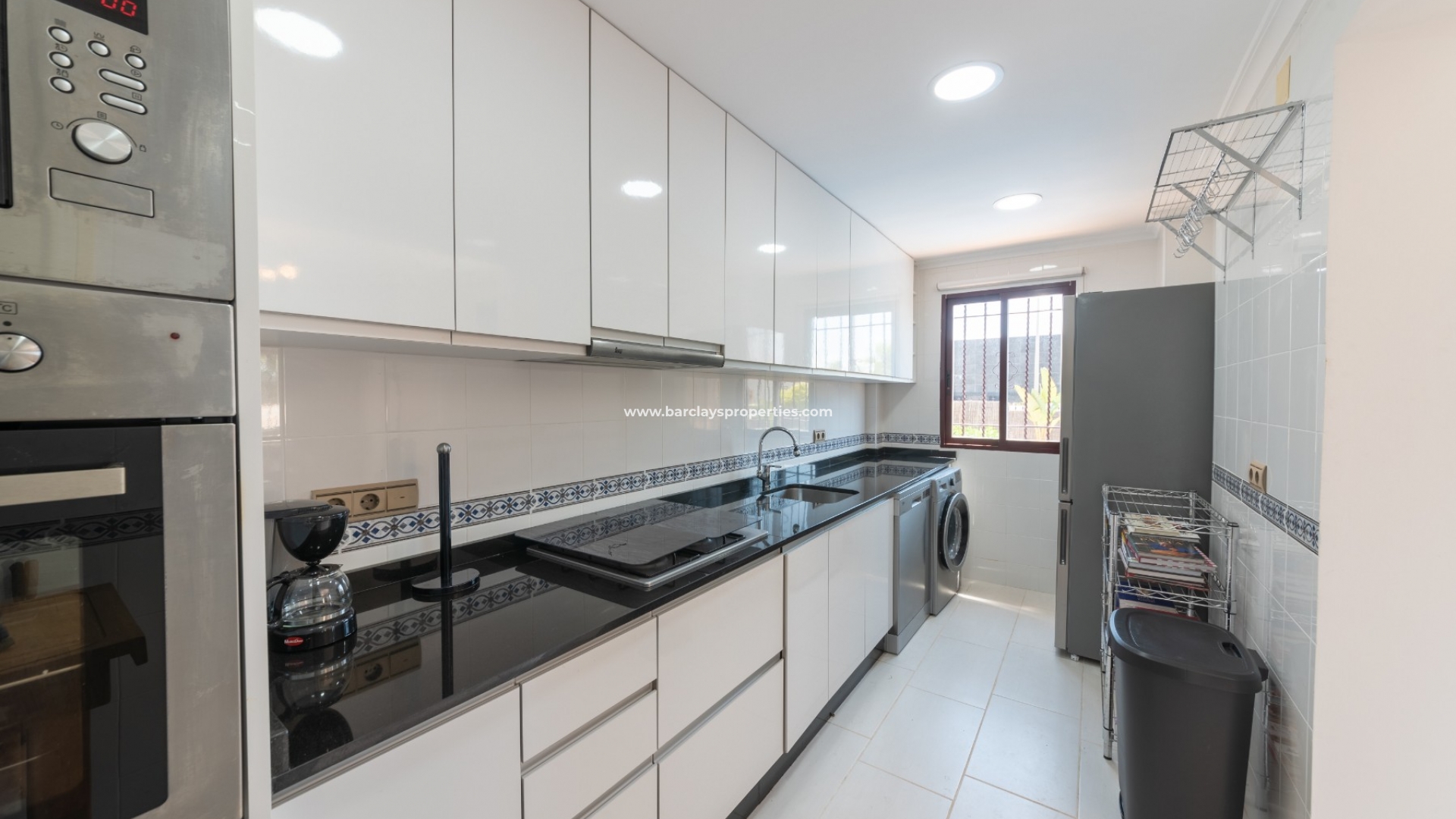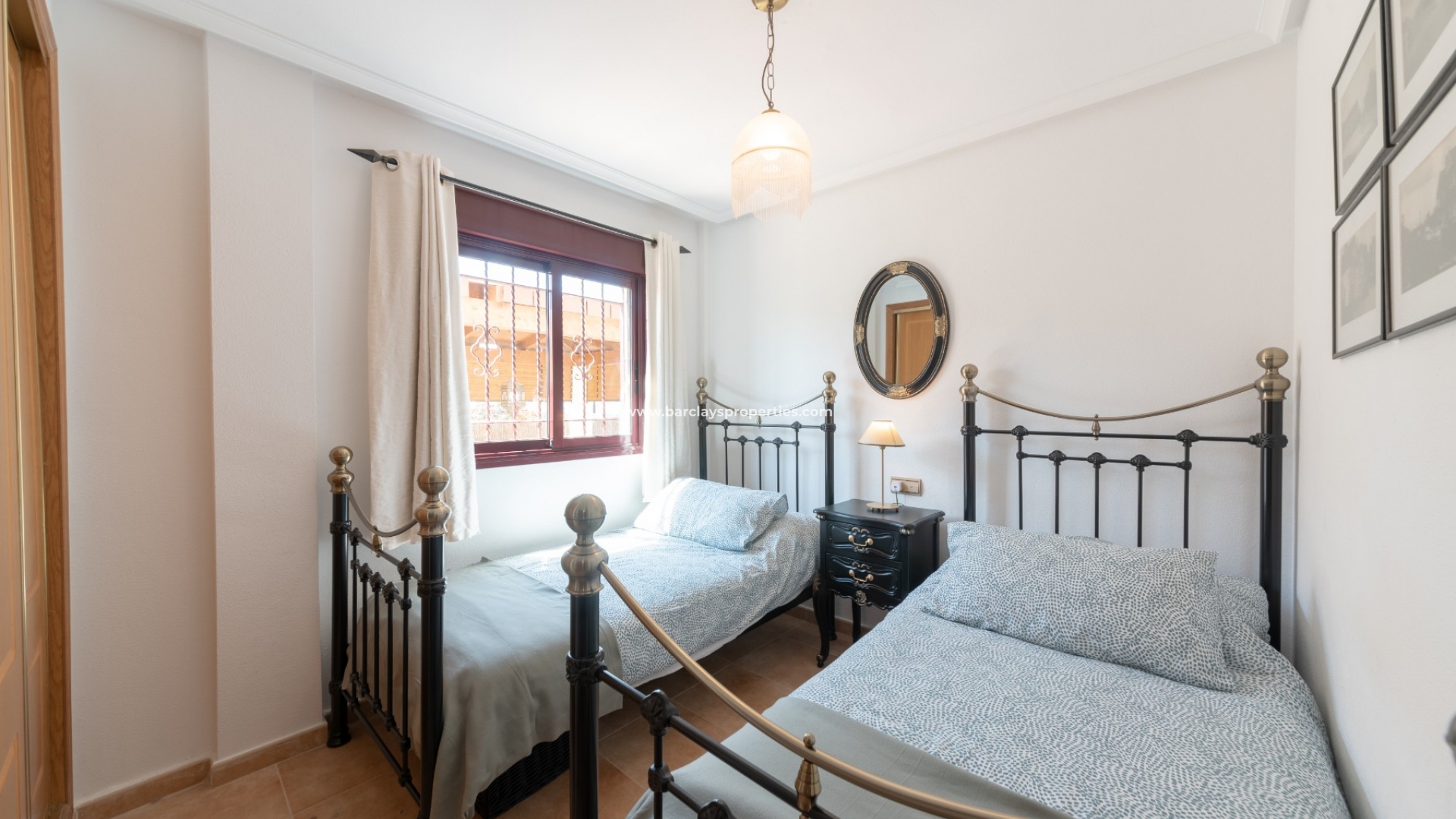 De ruime woonkamer met eethoek biedt een open haard, evenals geïntegreerde airconditioning en een toegangsdeur die leidt naar de tuin. De aparte keuken is volledig gerenoveerd met granieten werkbladen en voorzien van een geïntegreerde split-level oven en kookplaat, vaatwasser, wasmachine en koelkast met vriesvak. Op de begane grond bevinden zich ook twee ruime slaapkamers met inbouwkasten en een badkamer met hoekdouche. Een marmeren trap leidt ons naar boven waar we de hoofdslaapkamer vinden met en-suite een volledig ingerichte badkamer met een full-size bad, een inloopkast met ingebouwde spiegelkasten en een privé zonneterras met uitzicht op het gemeenschappelijke zwembad en de tuinen. De woning heeft ook een ruim solarium met een prachtig uitzicht, een heerlijke plek om te ontspannen en te genieten van de zomerzon.
