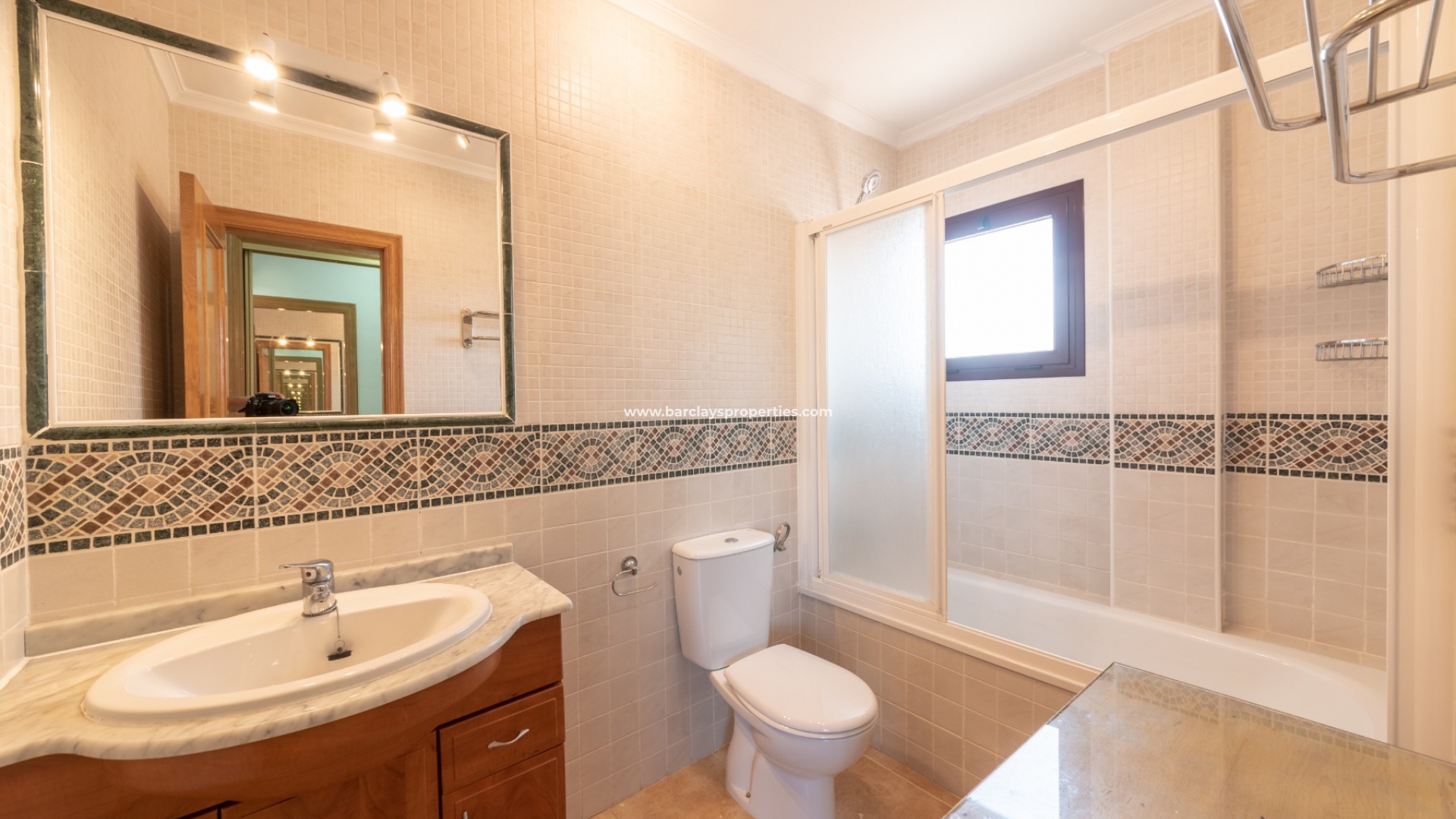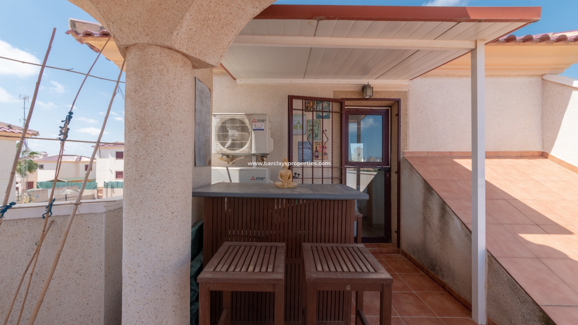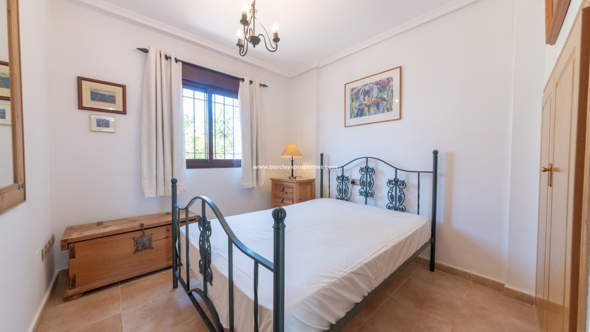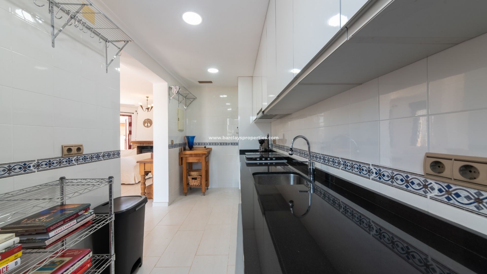 De ruime woonkamer met eethoek biedt een open haard, evenals geïntegreerde airconditioning en een toegangsdeur die leidt naar de tuin. De aparte keuken is volledig gerenoveerd met granieten werkbladen en voorzien van een geïntegreerde split-level oven en kookplaat, vaatwasser, wasmachine en koelkast met vriesvak. Op de begane grond bevinden zich ook twee ruime slaapkamers met inbouwkasten en een badkamer met hoekdouche. Een marmeren trap leidt ons naar boven waar we de hoofdslaapkamer vinden met en-suite een volledig ingerichte badkamer met een full-size bad, een inloopkast met ingebouwde spiegelkasten en een privé zonneterras met uitzicht op het gemeenschappelijke zwembad en de tuinen. De woning heeft ook een ruim solarium met een prachtig uitzicht, een heerlijke plek om te ontspannen en te genieten van de zomerzon.