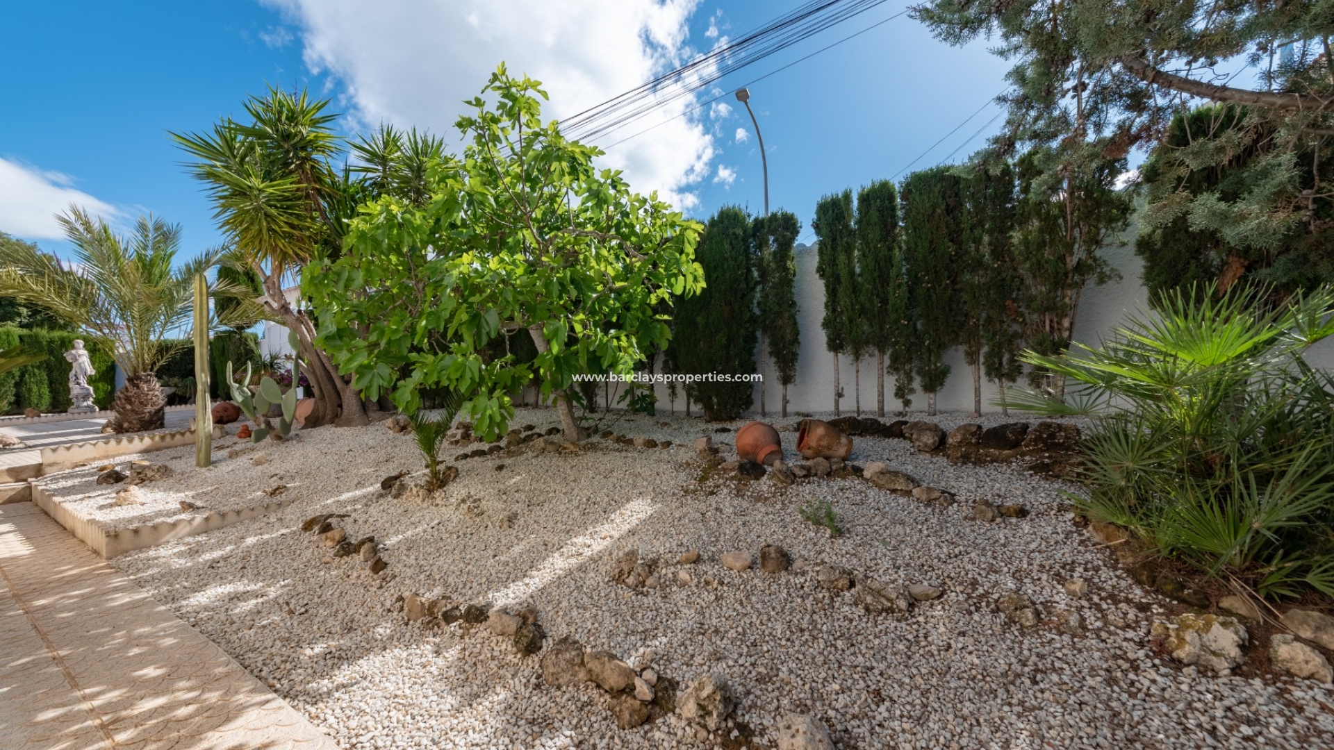 Verscholen achter grote witte buitenmuren in Andalusische stijl vindt u dit stijlvolle huis. We komen binnen in een prachtig aangelegde tuin via een grote schuifpoort, die ons leidt naar een privégarage voor off-road parking. De tuin is zowel verhard als met grind aangelegd, wat het onderhoud vergemakkelijkt, terwijl het toch een echt mediterraan paradijs blijft, dankzij de palmbomen en bloementuinen.