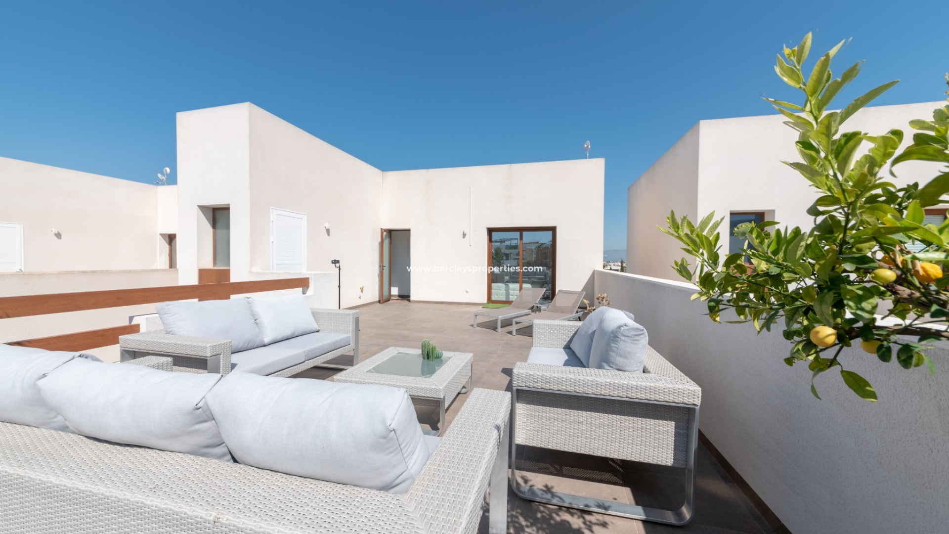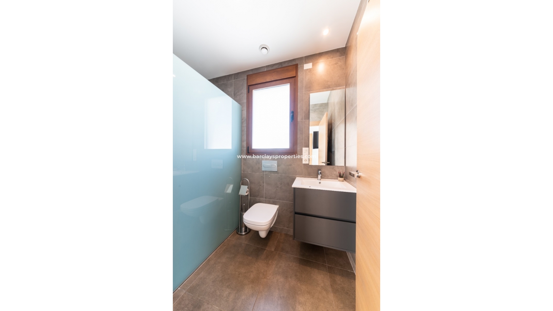 Een trap leidt ons naar de eerste verdieping waar we een tweepersoons slaapkamer vinden met ingebouwde kasten, een en-suite badkamer met muur tot muur douche, hangend toilet en wastafelmeubel, en openslaande deuren die leiden naar een groot zonneterras met prachtig uitzicht op de bergen. Er is een deur vanaf de overloop die toegang geeft tot hetzelfde zonneterras dat een buiten lounge en zonnebaden gebieden, evenals een berging biedt. Dit is een fantastische ruimte om te chillen, te ontspannen en vrienden en bezoekende familie te vermaken.