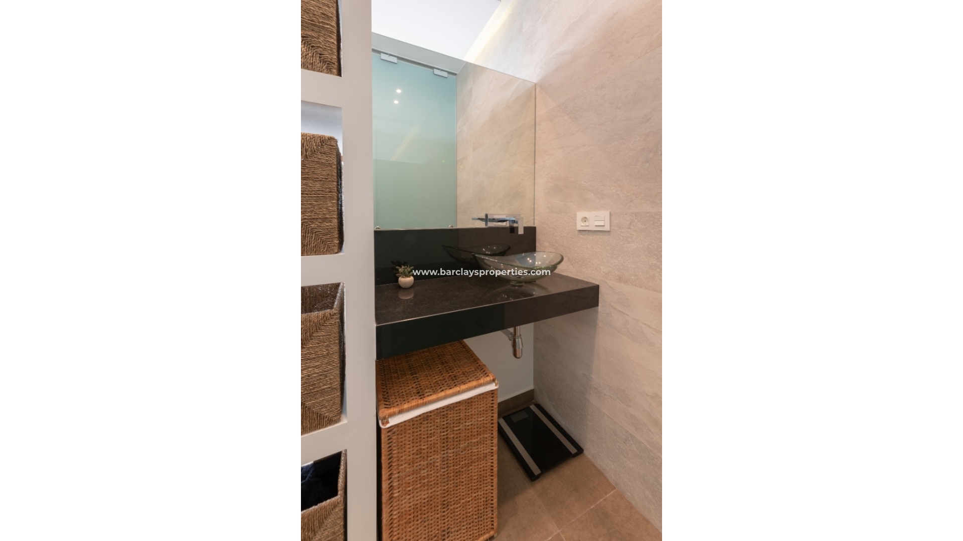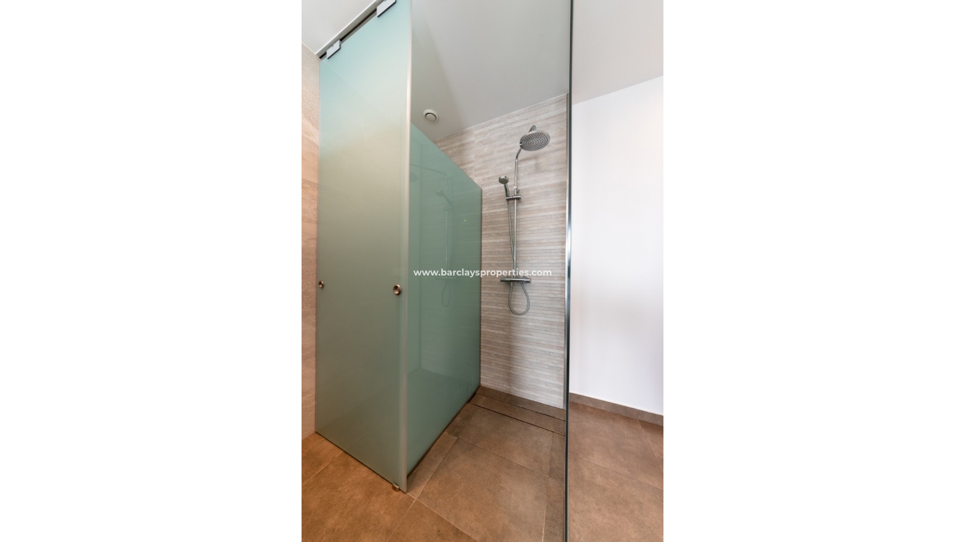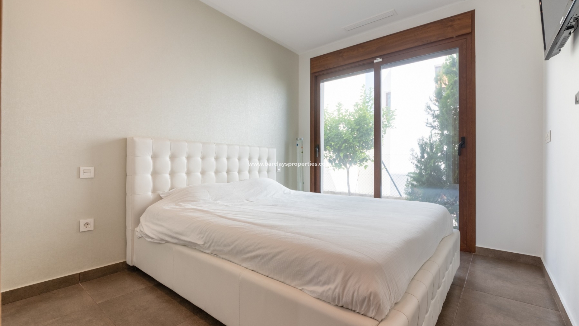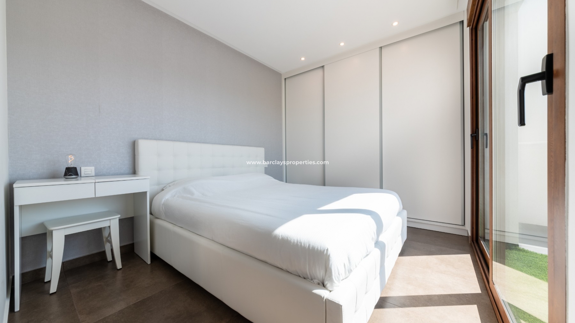 Bij het betreden van het pand vinden we de ruime en lichte woonkamer met open plan volledig ingerichte moderne keuken met granieten werkblad en witgoed van hoge kwaliteit met ontbijtbar en openslaande deuren leiden vanuit de woonkamer naar de buiten eetkamer en het zwembad. Vanuit de hal op de begane grond vinden we een tweepersoons slaapkamer met inbouwkasten en openslaande deuren naar de tuin, een grote tweepersoons slaapkamer met inbouwkasten en openslaande deur toegang tot de tuin en een en-suite badkamer met grote douche, hangende w.c en badmeubel en een aparte badkamer met hoekdouche, hangende w.c en moderne ijdelheid wastafelmeubel.