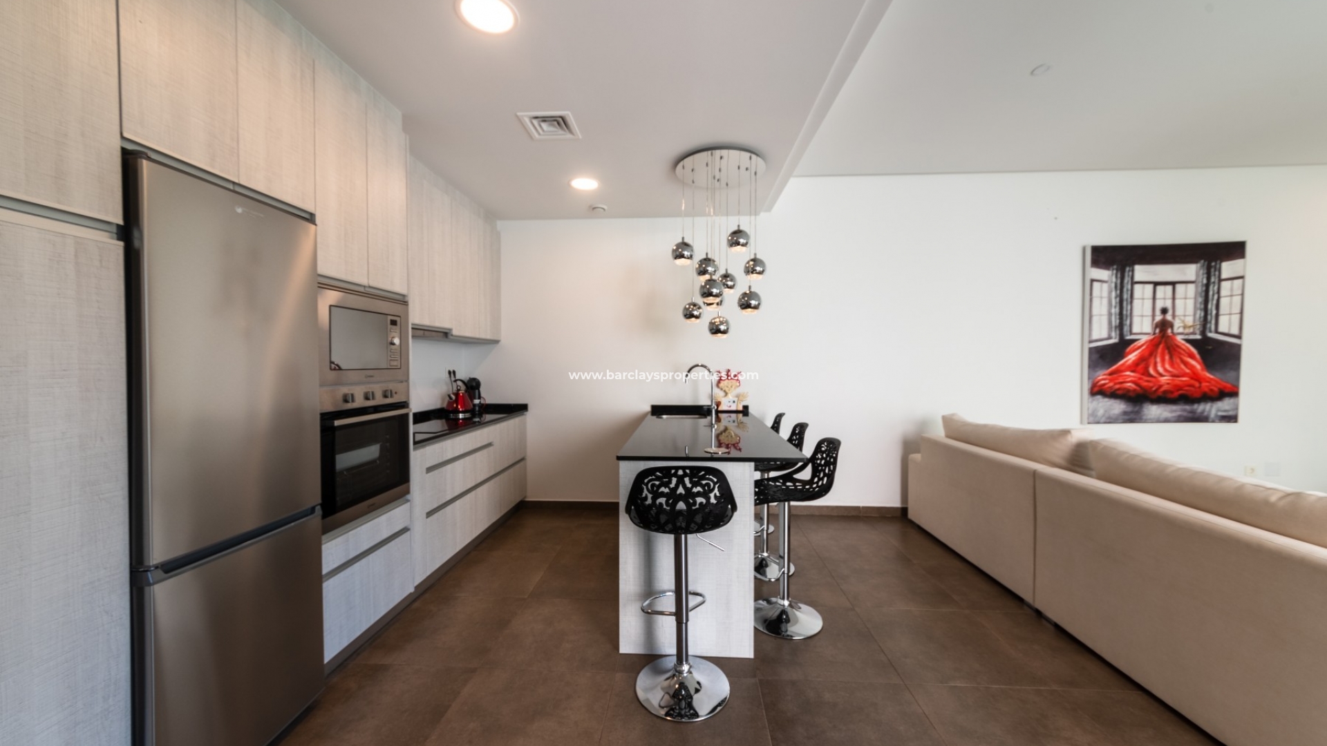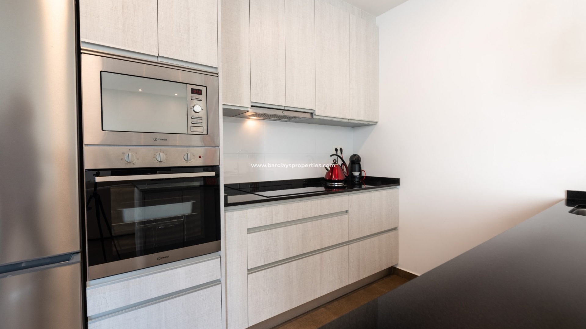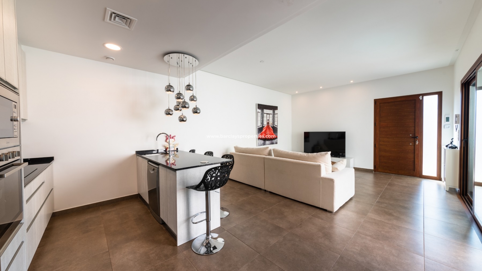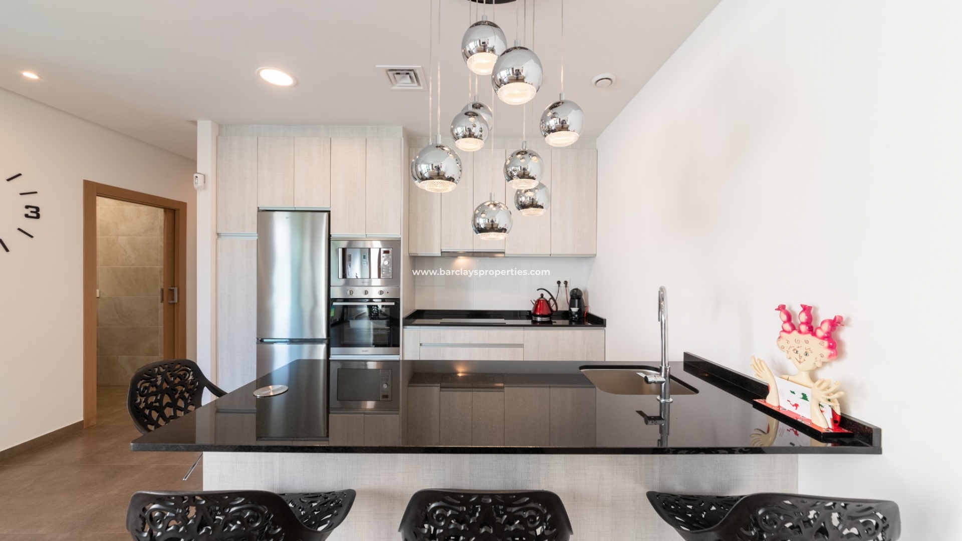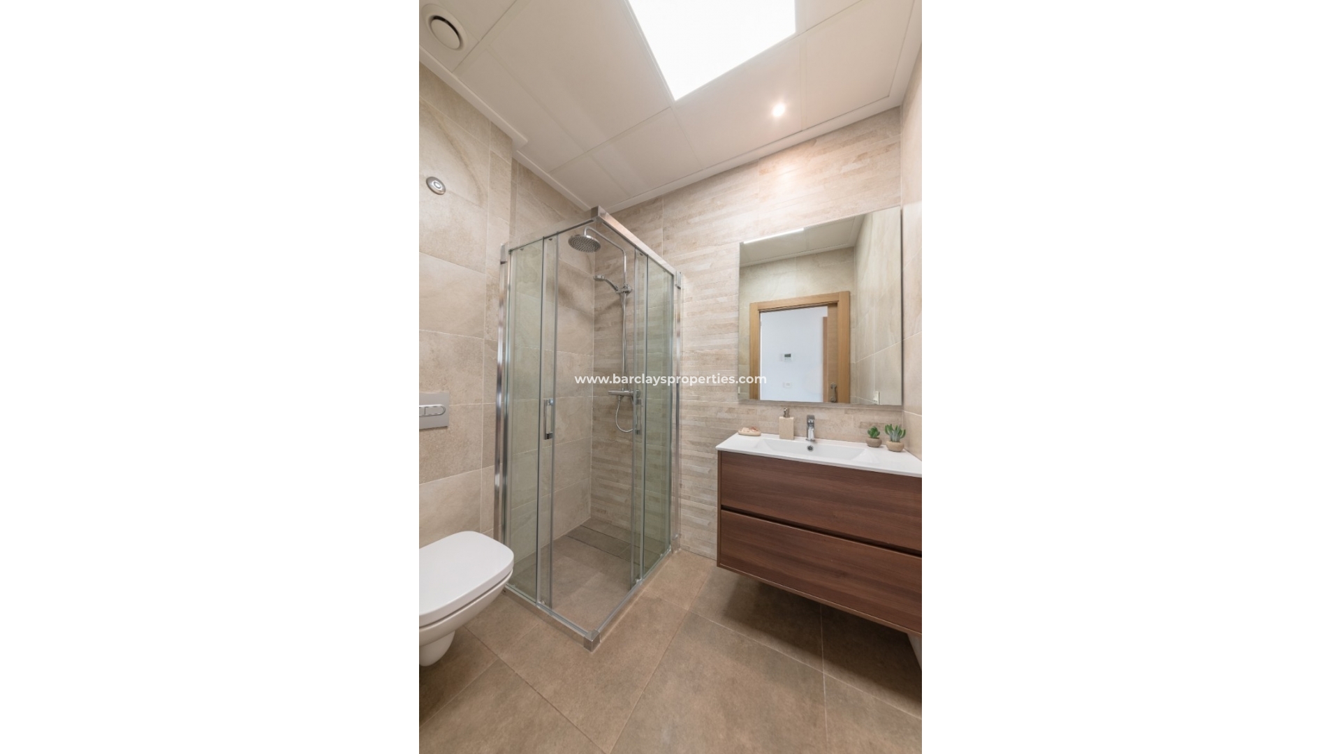 Bij het betreden van het pand vinden we de ruime en lichte woonkamer met open plan volledig ingerichte moderne keuken met granieten werkblad en witgoed van hoge kwaliteit met ontbijtbar en openslaande deuren leiden vanuit de woonkamer naar de buiten eetkamer en het zwembad. Vanuit de hal op de begane grond vinden we een tweepersoons slaapkamer met inbouwkasten en openslaande deuren naar de tuin, een grote tweepersoons slaapkamer met inbouwkasten en openslaande deur toegang tot de tuin en een en-suite badkamer met grote douche, hangende w.c en badmeubel en een aparte badkamer met hoekdouche, hangende w.c en moderne ijdelheid wastafelmeubel.