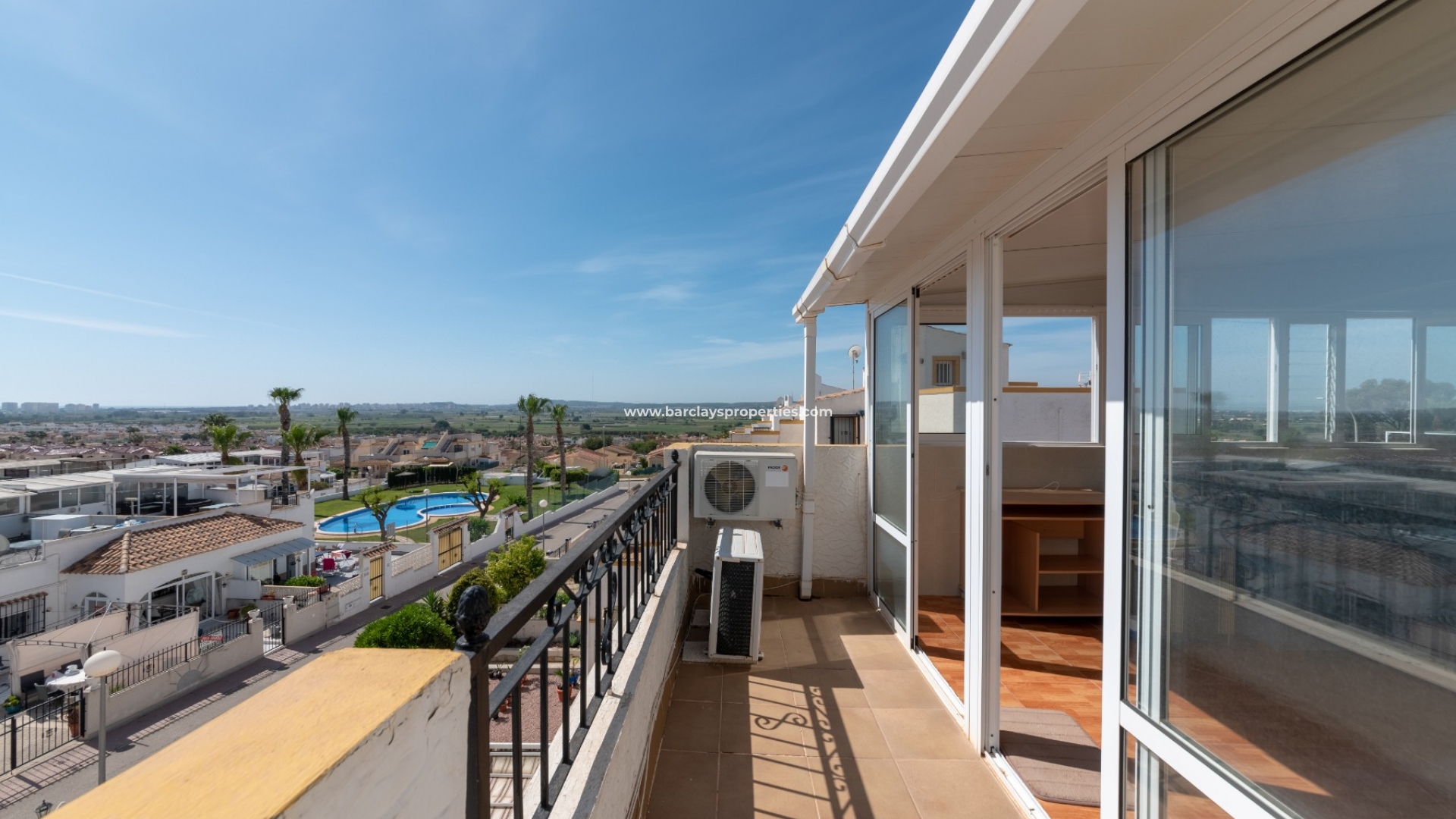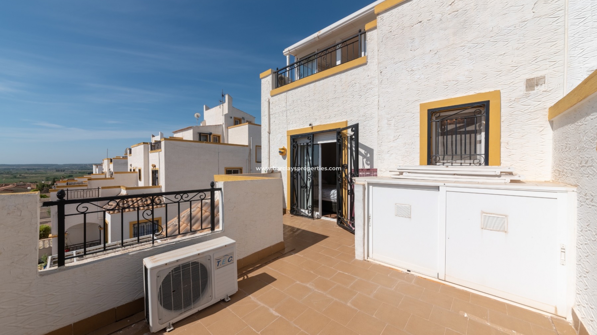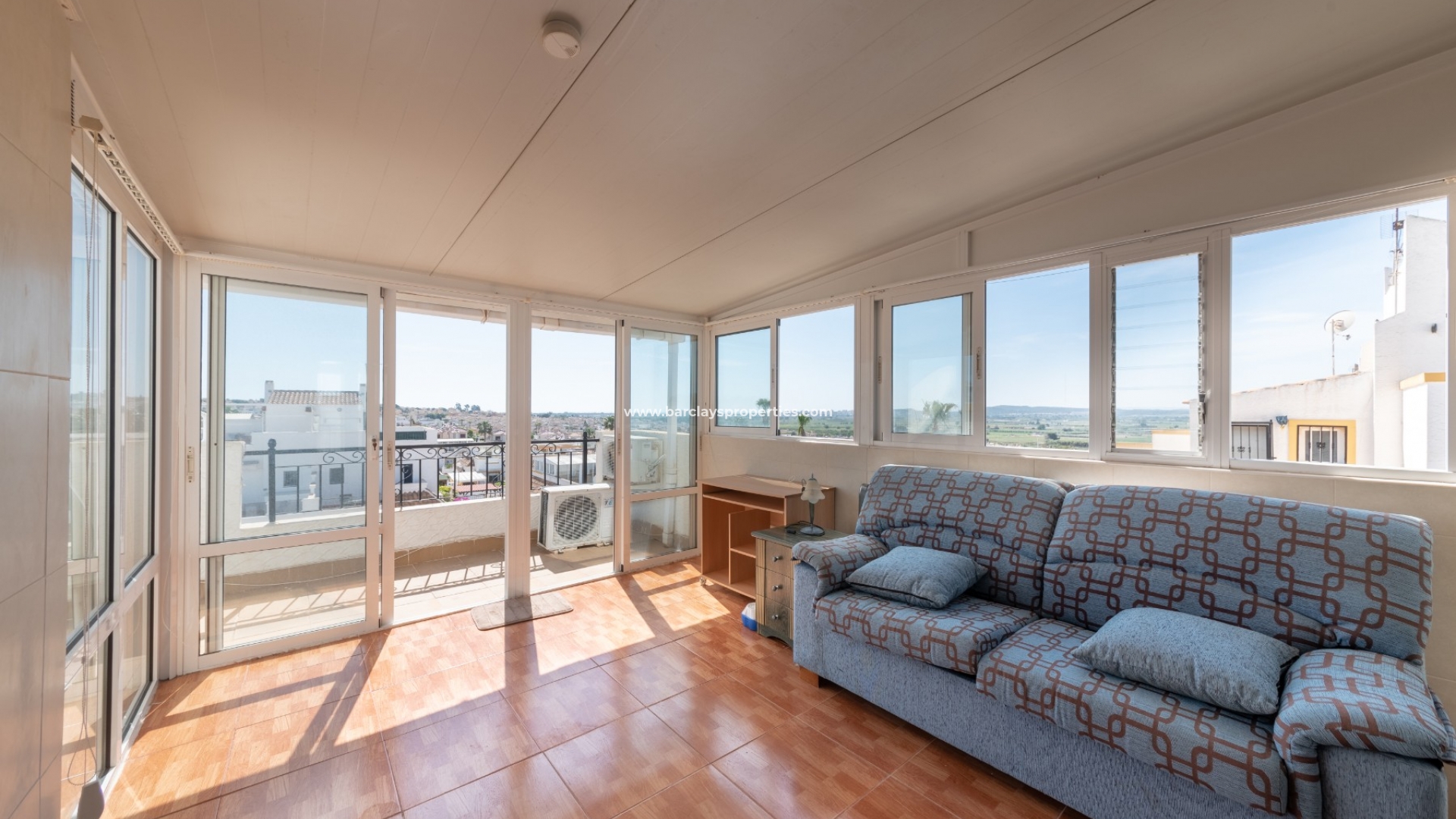 Een trap leidt naar het solarium op het dak, waar zich een ruime glazen serre bevindt met een zithoek om te ontspannen en te genieten van het prachtige uitzicht op het platteland van de Vega Baja.