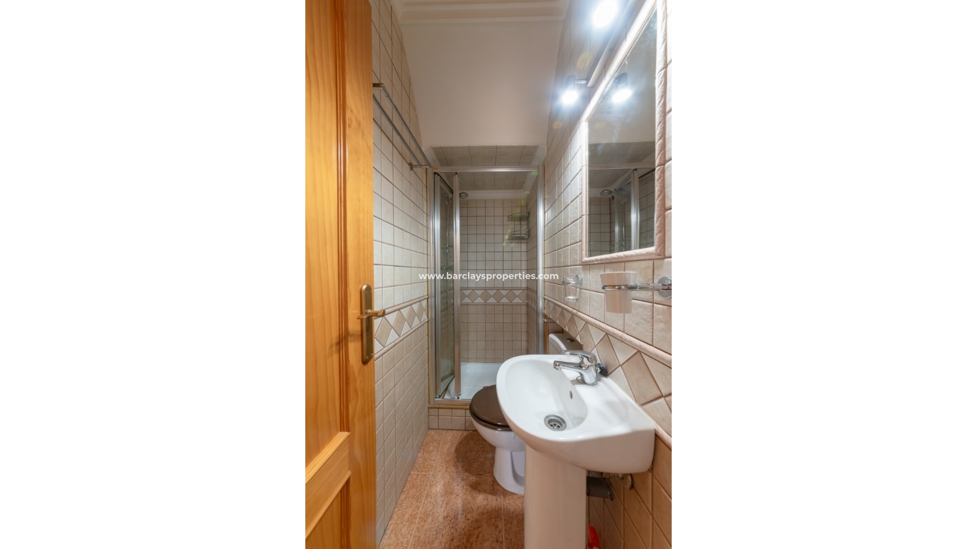 We komen de tuin binnen en vinden een parkeerplaats en een stenen buitenzitje. Een trap leidt naar de glazen veranda met zithoek die een mooie wintertuin vormt in de laatste maanden van het jaar. Vanaf hier betreden we de woning en vinden we een ruime en lichte woonkamer met eethoek en plafondventilatoren, een onafhankelijke moderne, volledig gerenoveerde, uitgebreide keuken met toegangsdeur naar de zijtuin die volledig geplaveid is en voorzien is van een buitenzithoek met zonneschermen en een berging. Een badkamer is te vinden op de begane grond met muur tot muur douche.
