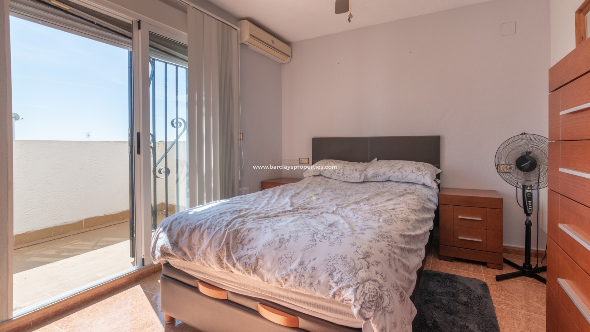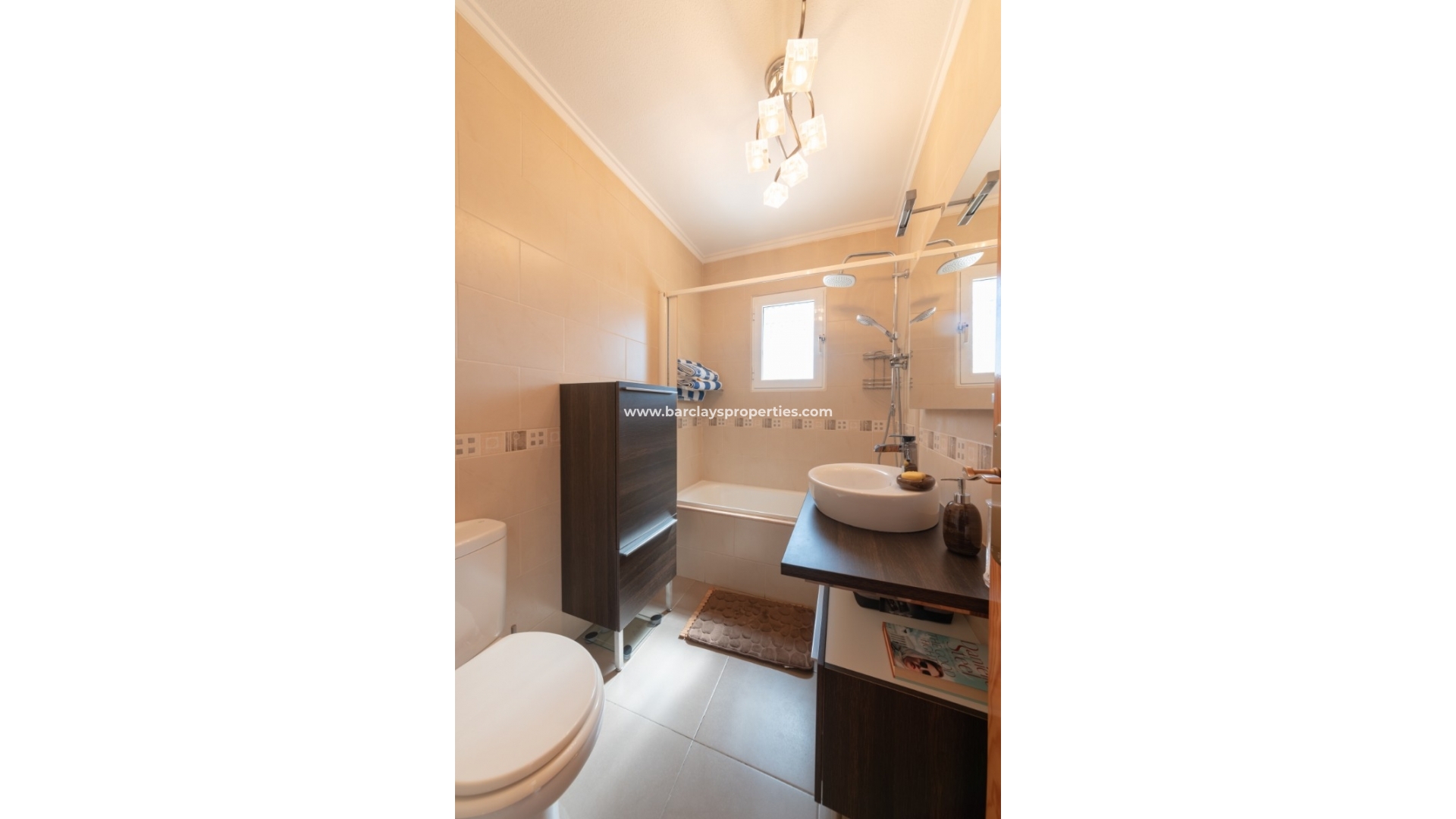 Een trap leidt naar de eerste verdieping waar zich de familiebadkamer bevindt met moderne wastafel en badmeubel, twee slaapkamers met airconditioning en plafondventilatoren (waarvan één de hoofdslaapkamer is die toegang heeft tot zijn eigen ruime privé zonneterras met opslagruimte).