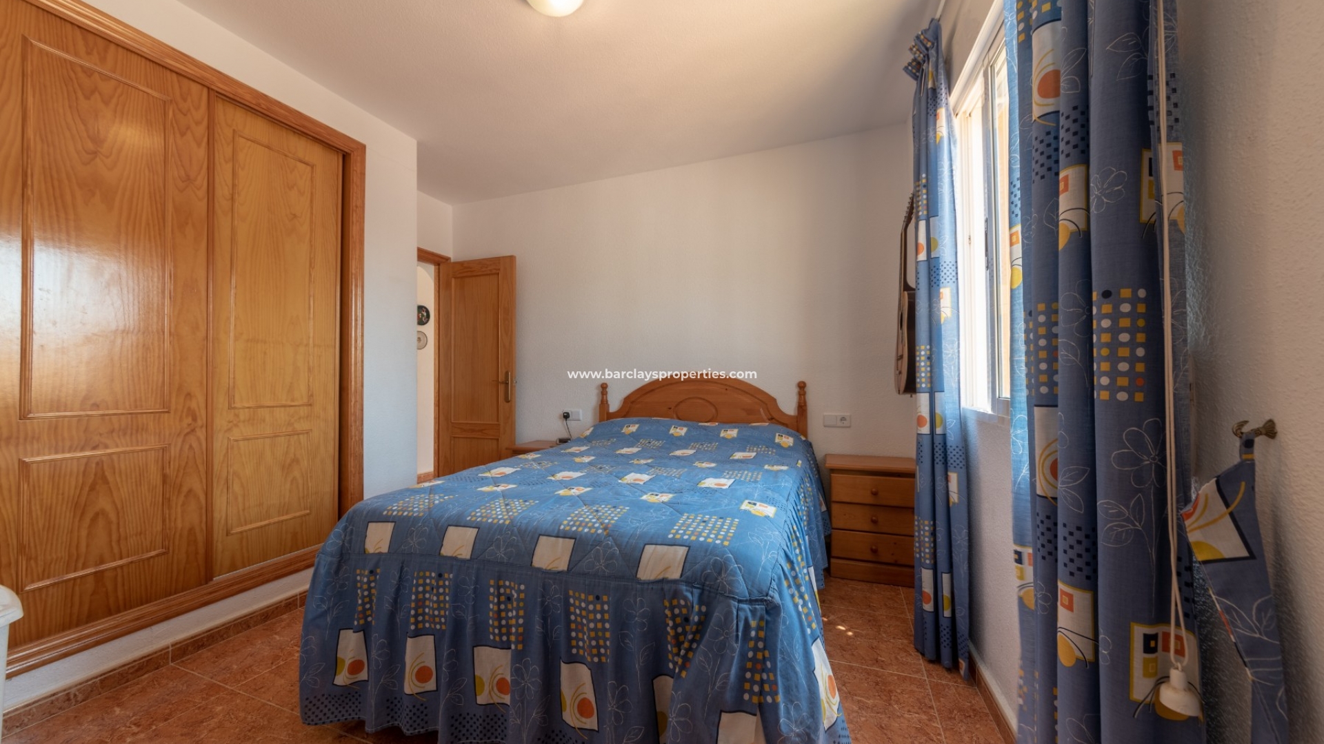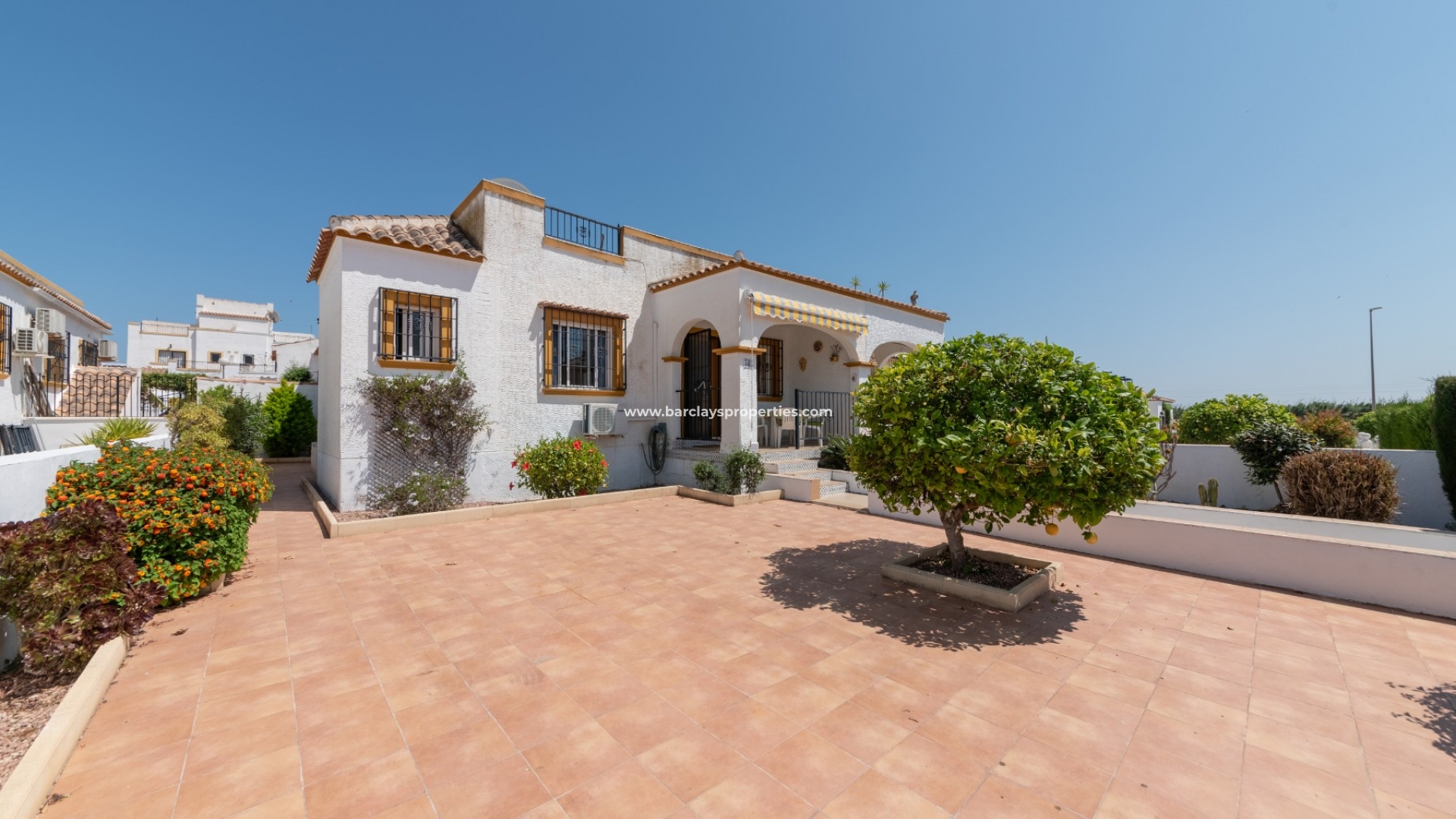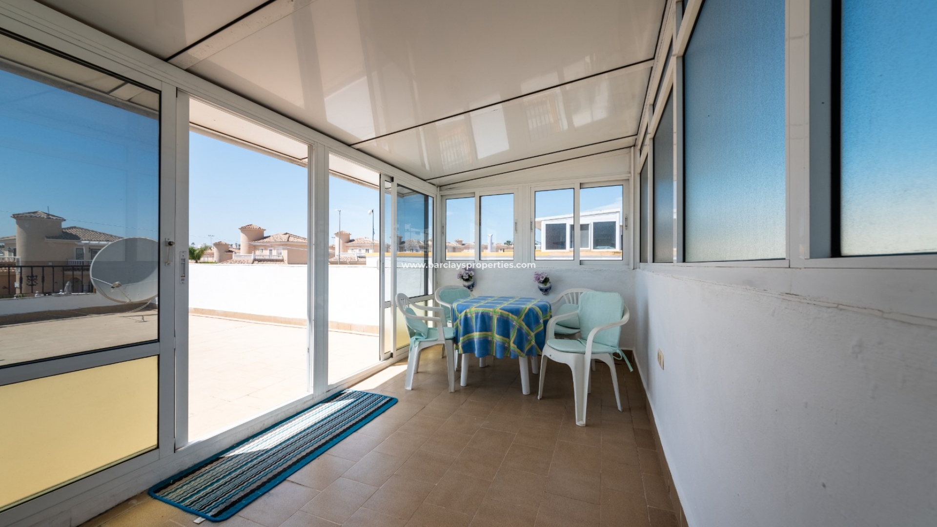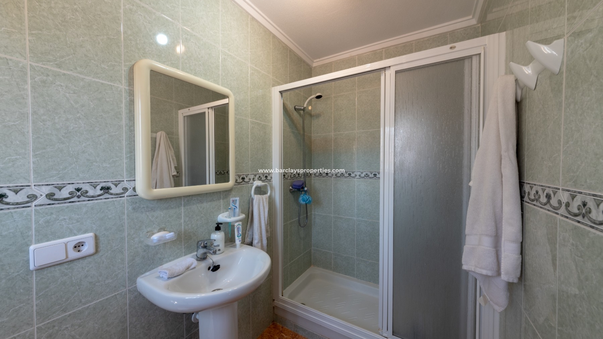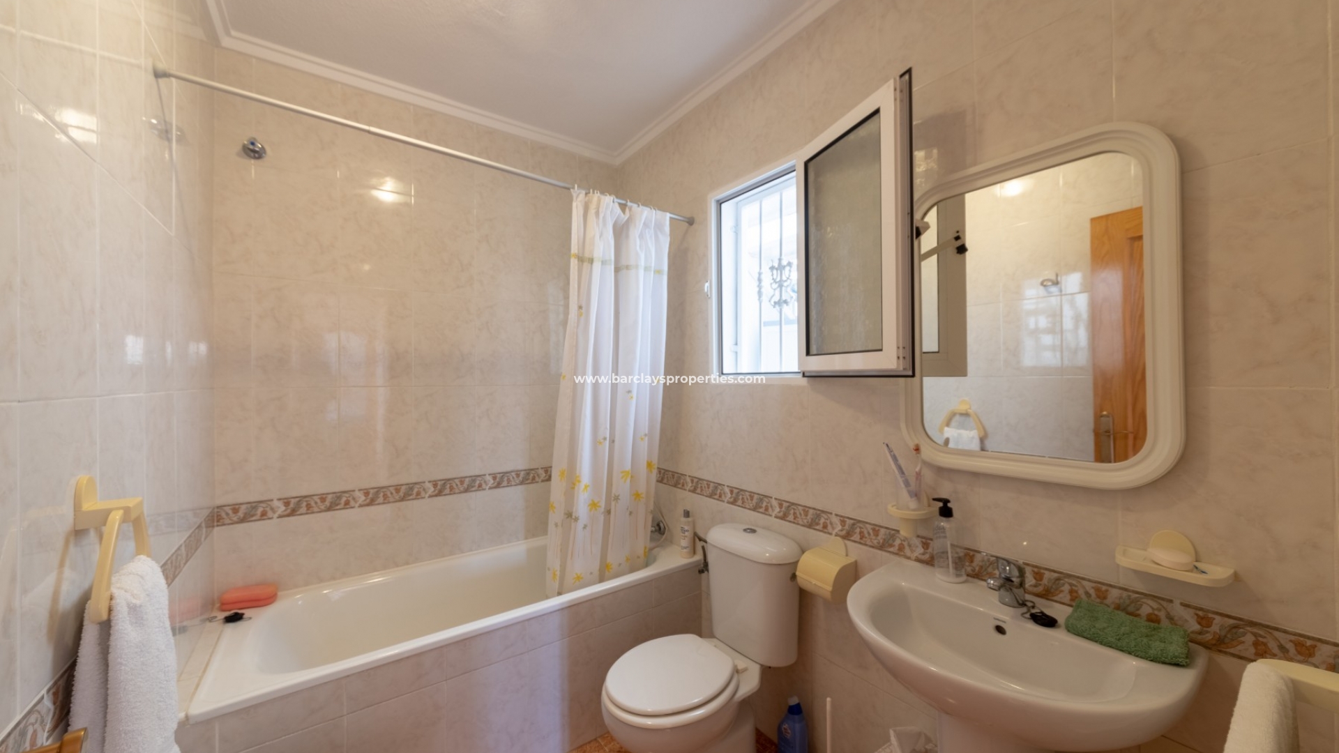 Een trap leidt naar de verhoogde overdekte veranda met veiligheidshekwerk, een zonnescherm en een eethoek buiten. Het interieur van de woning biedt een lichte en ruime woonkamer met eethoek, voorzien van airconditioning en plafondventilator. Vanuit de hal vinden we een tweepersoons slaapkamer met inbouwkasten en een ensuite badkamer met muur tot muur douche. Naast deze slaapkamer is een slaapkamer met airconditioning en inbouwkasten, nog een tweepersoons slaapkamer met airconditioning en een familie badkamer met full size bad. De onafhankelijke volledig ingerichte keuken is toegankelijk vanuit de woonkamer en heeft een deur die leidt naar de bijkeuken / patio waar een trap leidt naar de serre met eethoek die leidt naar het ruime zonneterras dat uitzicht biedt op het platteland en de bergen.