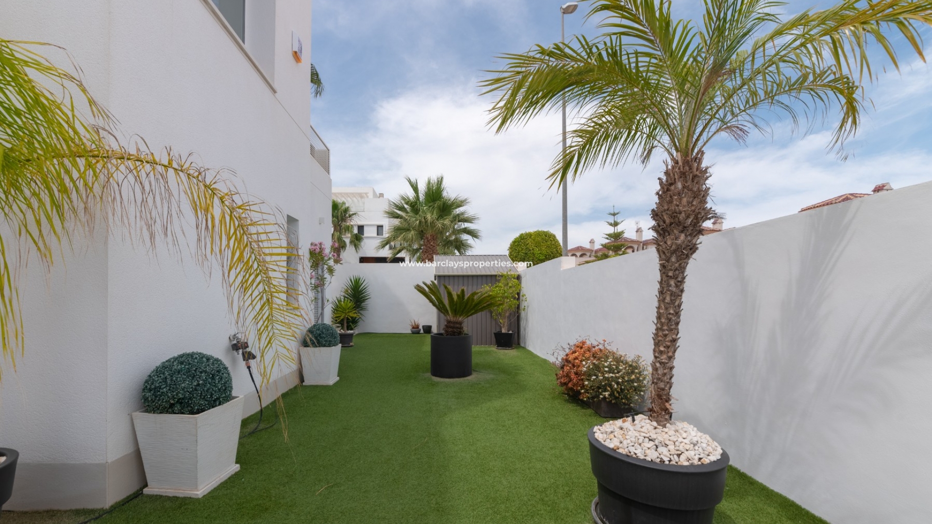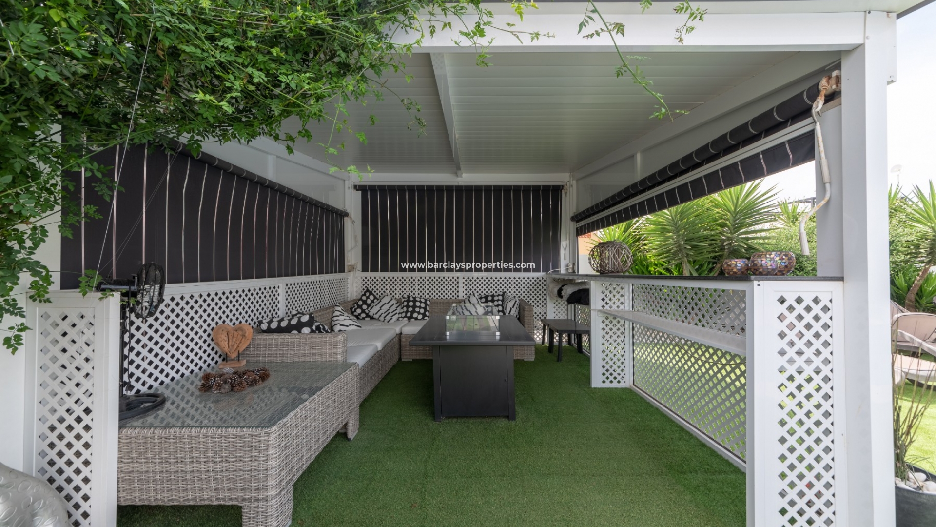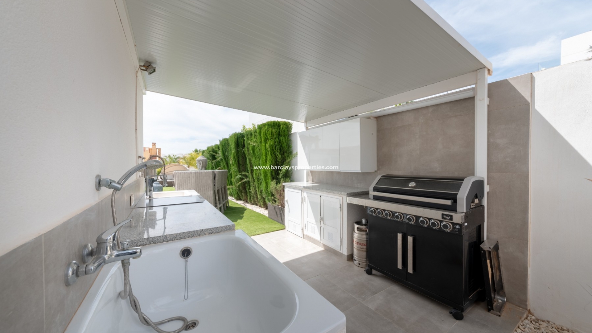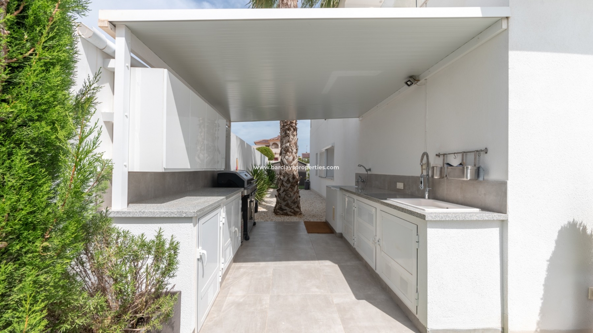 Deze woning is gelegen in een goed formaat perceel van 500m2 met prachtig onderhouden tuinen met bomen en planten met kunstgras gebieden, off-road parking met carport, een prive 8 x 4 zwembad met buitendouche, berging, overdekte chillout out gebieden, zonnebaden gebieden en een op maat gemaakte buitenkeuken compleet met hond bad / douche. De tuin is perfect aangelegd voor het buitenleven in het Spaanse zonnige klimaat gedurende 325 dagen van het jaar!