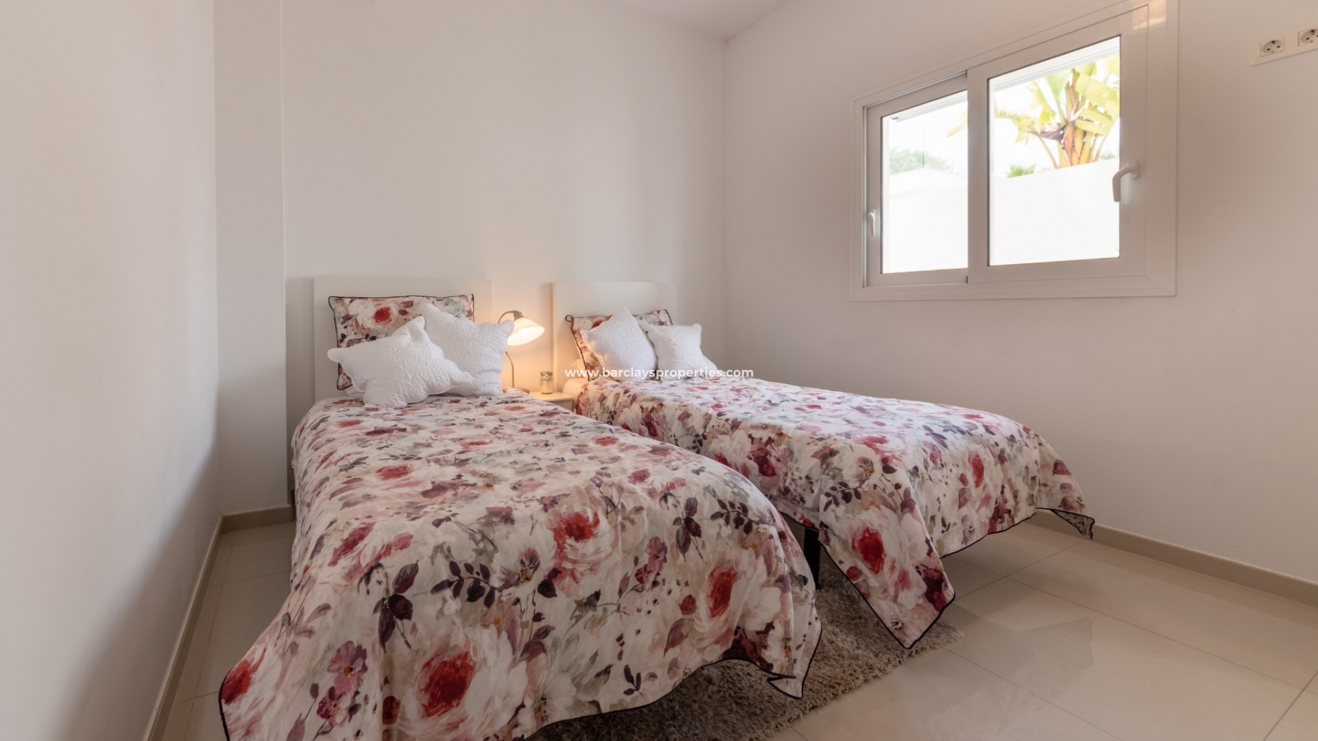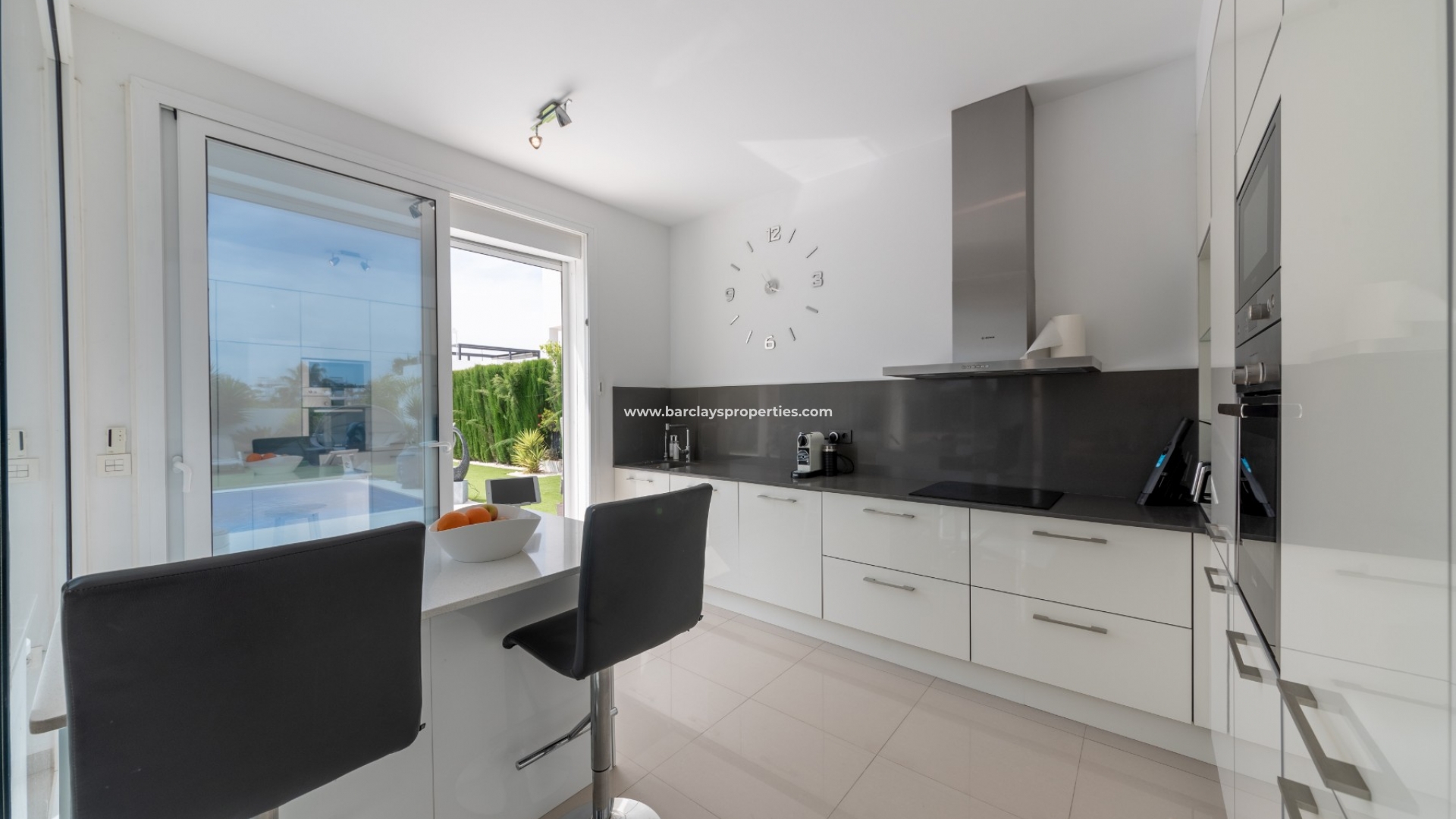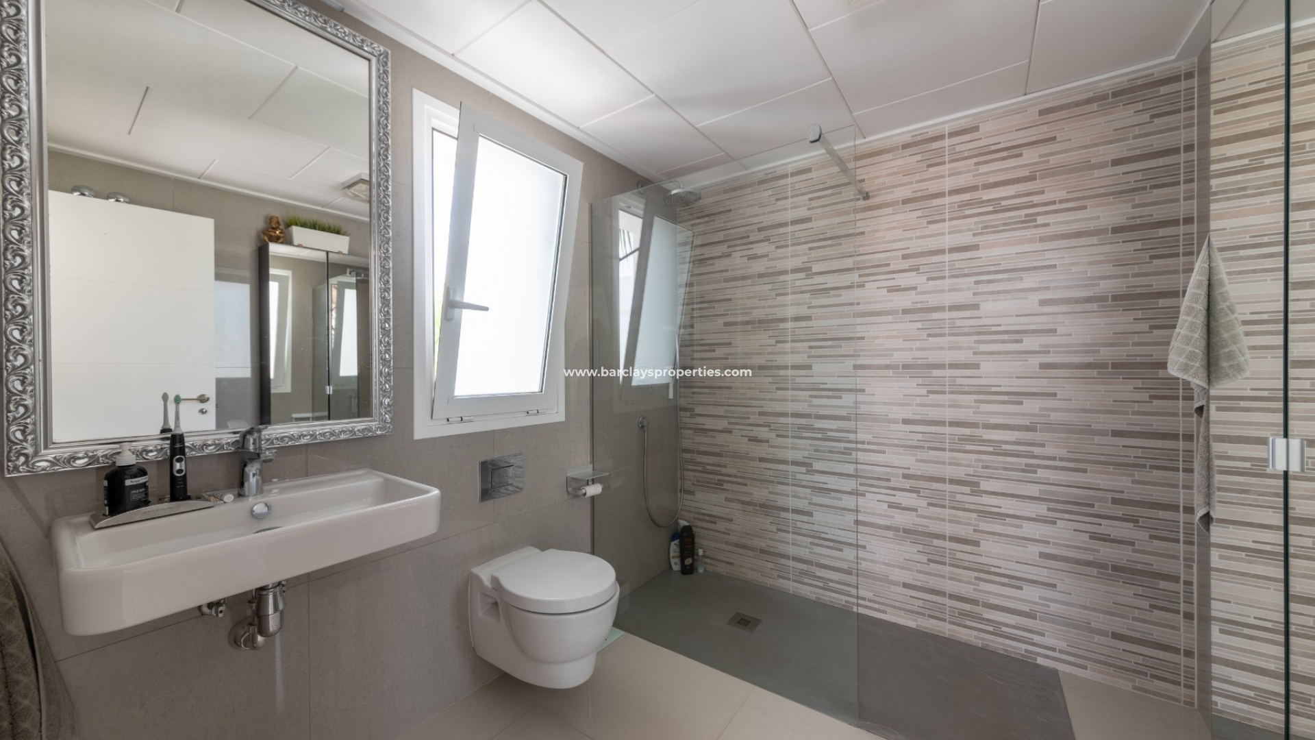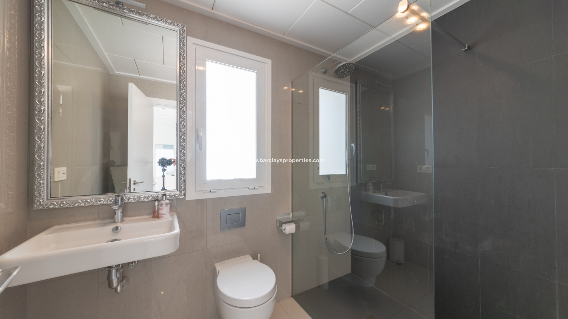 Een overdekte entree leidt ons naar het interieur van het pand en meteen voelen we de helderheid en ruimte gecreëerd door de grote ramen waar het licht de woonkamer / eetkamer en open plan volledig ingerichte moderne keuken met geïntegreerde oven / kookplaat en granieten werkbladen en ontbijtbar binnenkomt. Openslaande deuren vanuit de woonkamer en de keuken leiden naar het zonneterras met schaduwrijke zithoek met uitzicht op het zwembad. Ook op de begane grond vinden we een wasruimte met wasmachine en droger, een tweepersoons slaapkamer met inbouwkasten en een familie badkamer met muur tot muur douche, w.c en wastafel / badmeubel.